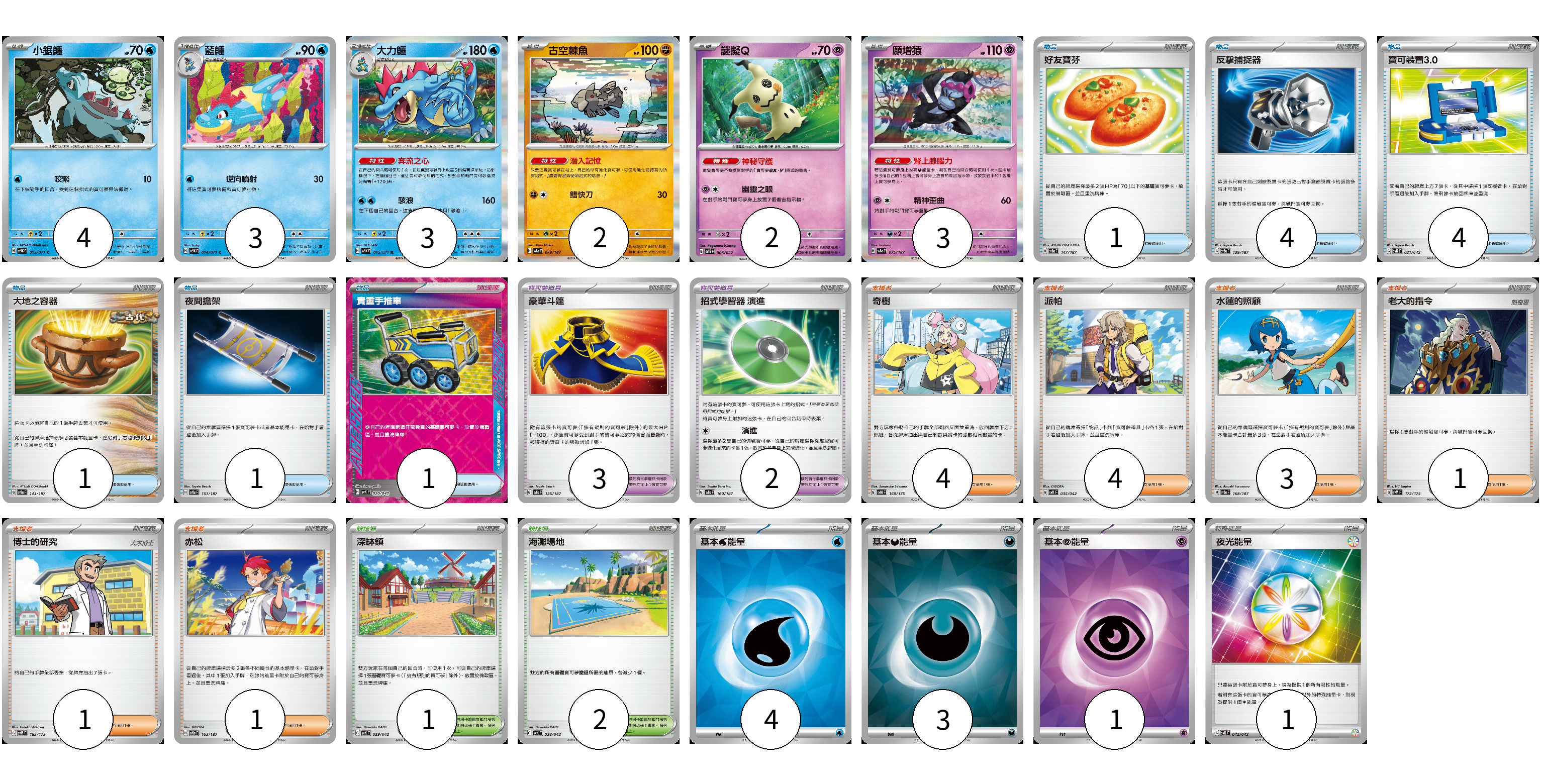 牌組構築方案 以此牌組為基礎新構築牌組 顯示卡面 顯示列表 寶可夢卡(17) 4 3 3 2 2 3 寶可夢道具(5) 3 2 物品卡(12) 1 4 4 1 1 1 支援者卡(14) 4 4 3 1 1 1 競技場卡(3) 1 2 能量卡(9) 4 3 1 1 寶可夢卡(17) 卡牌名稱 張數 卡牌名稱 張數 小鋸鱷 SV5K 013/071 04 藍鱷 SV5K 014/071 03 大力鱷 SV5K 015/071 03 古空棘魚 SV8a 079/187 02 謎擬Q SVTS 006/022 02 願增猿 SV8a 075/187 03 寶可夢道具(5) 卡牌名稱 張數 卡牌名稱 張數 豪華斗篷 SV8a 155/187 03 招式學習器 演進 SV8a 160/187 02 物品卡(12) 卡牌名稱 張數 卡牌名稱 張數 好友寶芬 SV8a 147/187 01 反擊捕捉器 SV8a 139/187 04 寶可裝置3.0 SVK 021/042 04 大地之容器 SV8a 143/187 01 夜間擔架 SV8a 151/187 01 貴重手推車 SVK 020/042 01 支援者卡(14) 卡牌名稱 張數 卡牌名稱 張數 奇樹 SVM 160/175 04 派帕 SVK 035/042 04 水蓮的照顧 SV8a 168/187 03 老大的指令 SVM 172/175 01 博士的研究 SVM 162/175 01 赤松 SV8a 163/187 01 競技場卡(3) 卡牌名稱 張數 卡牌名稱 張數 深缽鎮 SVK 039/042 01 海灘場地 SVK 038/042 02 能量卡(9) 卡牌名稱 張數 卡牌名稱 張數 基本【水】能量 SVK WAT 04 基本【惡】能量 SVK DAR 03 基本【超】能量 SVK PSY 01 夜光能量 SVK 042/042 01 以此牌組為基礎新構築牌組 牌組編碼 tVByps-CoHNnA-TlHAQr copy 列印牌組單 牌組編碼已複製 分享至SNS