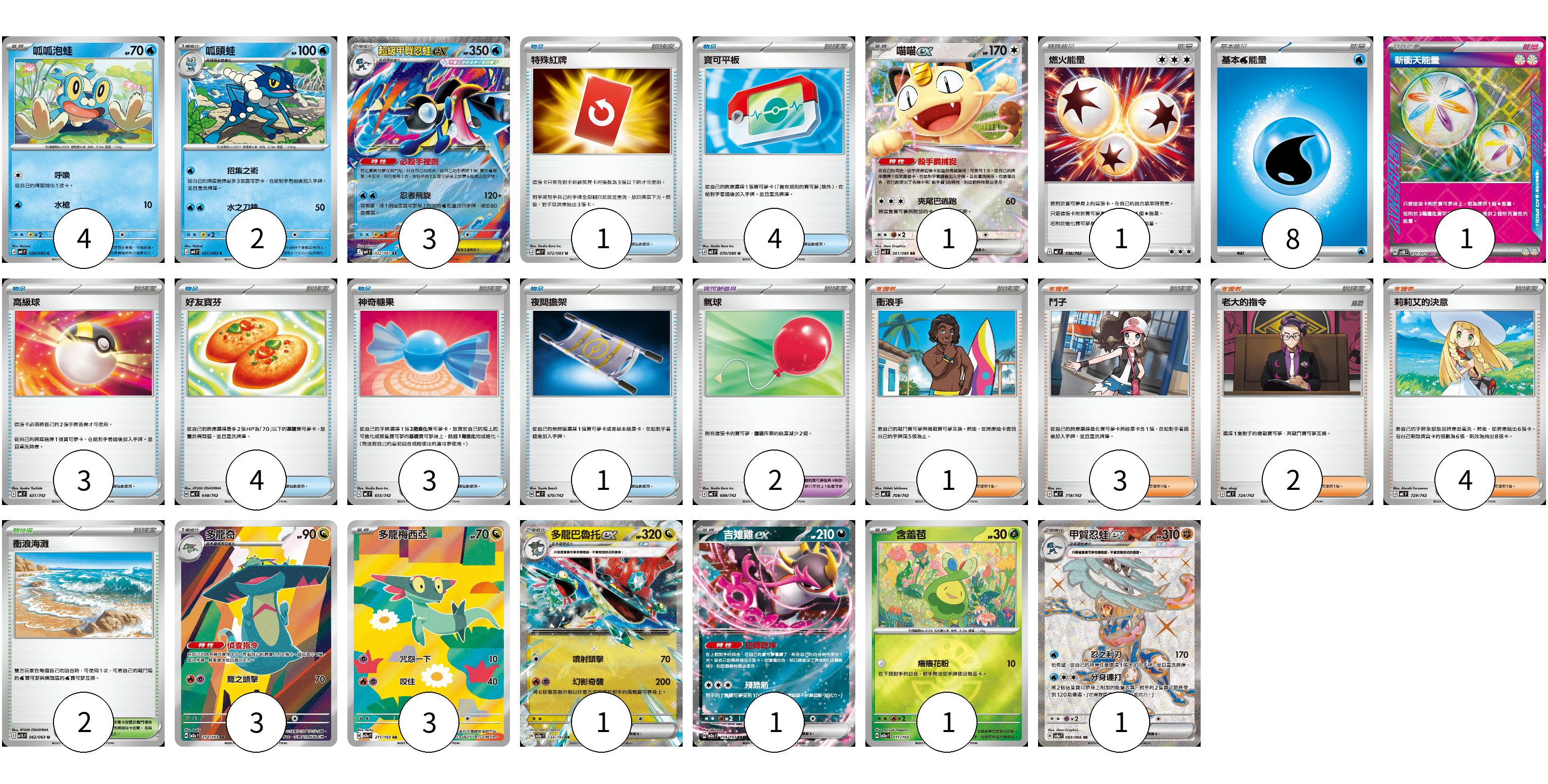 牌組構築方案 以此牌組為基礎新構築牌組 顯示卡面 顯示列表 寶可夢卡(20) 4 2 3 1 3 3 1 1 1 1 寶可夢道具(2) 2 物品卡(16) 1 4 3 4 3 1 支援者卡(10) 1 3 2 4 競技場卡(2) 2 能量卡(10) 1 8 1 寶可夢卡(20) 卡牌名稱 張數 卡牌名稱 張數 呱呱泡蛙 M4 020/083 04 呱頭蛙 M4 021/083 02 超級甲賀忍蛙ex M4 022/083 03 喵喵ex M3 061/080 01 多龍奇 M2a 212/193 03 多龍梅西亞 M2a 211/193 03 多龍巴魯托ex M2a 134/193 01 吉雉雞ex M2a 114/193 01 含羞苞 M2a 011/193 01 甲賀忍蛙ex SV5a 083/066 01 寶可夢道具(2) 卡牌名稱 張數 卡牌名稱 張數 氣球 MC 688/742 02 物品卡(16) 卡牌名稱 張數 卡牌名稱 張數 特殊紅牌 M4 072/083 01 寶可平板 M3 070/080 04 高級球 MC 651/742 03 好友寶芬 MC 648/742 04 神奇糖果 MC 655/742 03 夜間擔架 MC 670/742 01 支援者卡(10) 卡牌名稱 張數 卡牌名稱 張數 衝浪手 MC 708/742 01 鬥子 MC 718/742 03 老大的指令 MC 724/742 02 莉莉艾的決意 MC 729/742 04 競技場卡(2) 卡牌名稱 張數 卡牌名稱 張數 衝浪海灘 M1S 062/063 02 能量卡(10) 卡牌名稱 張數 卡牌名稱 張數 燃火能量 MC 736/742 01 基本【水】能量 MC WAT 08 新衝天能量 SV5K 071/071 01 以此牌組為基礎新構築牌組 牌組編碼 tWVRNU-xpzhrr-otBxTM copy 列印牌組單 牌組編碼已複製 分享至SNS