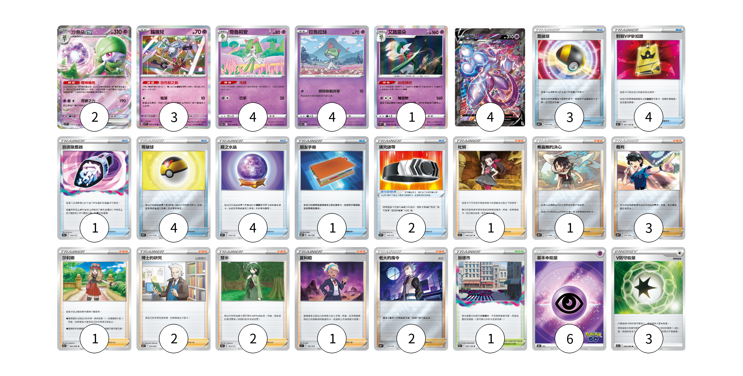 牌組構築方案 以此牌組為基礎新構築牌組 顯示卡面 顯示列表 寶可夢卡(18) 2 3 4 4 1 4 寶可夢道具(2) 2 物品卡(17) 3 4 1 4 4 1 支援者卡(13) 1 1 3 1 2 2 1 2 競技場卡(1) 1 能量卡(9) 6 3 寶可夢卡(18) 卡牌名稱 張數 卡牌名稱 張數 沙奈朵ex SV1S 028/078 02 鑰圈兒 SV1V 045/078 03 奇魯莉安 S11a 037/068 04 拉魯拉絲 S9a 032/067 04 艾路雷朵 S9a 034/067 01 超夢V-UNION SP5 005/013 006/013 007/013 008/013 04 寶可夢道具(2) 卡牌名稱 張數 卡牌名稱 張數 講究腰帶 S12a 145/172 02 物品卡(17) 卡牌名稱 張數 卡牌名稱 張數 高級球 SO 020/030 03 對戰VIP參加證 S8 091/100 04 放逐吸塵器 S12a 144/172 01 等級球 SO 022/030 04 霧之水晶 S12a 134/172 04 朋友手冊 SC2D 141/157 01 支援者卡(13) 卡牌名稱 張數 卡牌名稱 張數 杜娟 S9a 065/067 01 希嘉娜的決心 SO 027/030 01 裁判 SO 024/030 03 莎莉娜 S11a 064/068 01 博士的研究(山梨博士) SN 023/024 02 芽米 S12a 163/172 02 夏科婭 SI 397/414 01 老大的指令(赤日) SO 028/030 02 競技場卡(1) 卡牌名稱 張數 卡牌名稱 張數 放逐市 S11 099/100 01 能量卡(9) 卡牌名稱 張數 卡牌名稱 張數 基本超能量 S10b PSY 06 V防守能量 S11a 068/068 03 以此牌組為基礎新構築牌組 牌組編碼 tZPXUh-ahiujn-MAwWEA copy 列印牌組單 牌組編碼已複製 分享至SNS