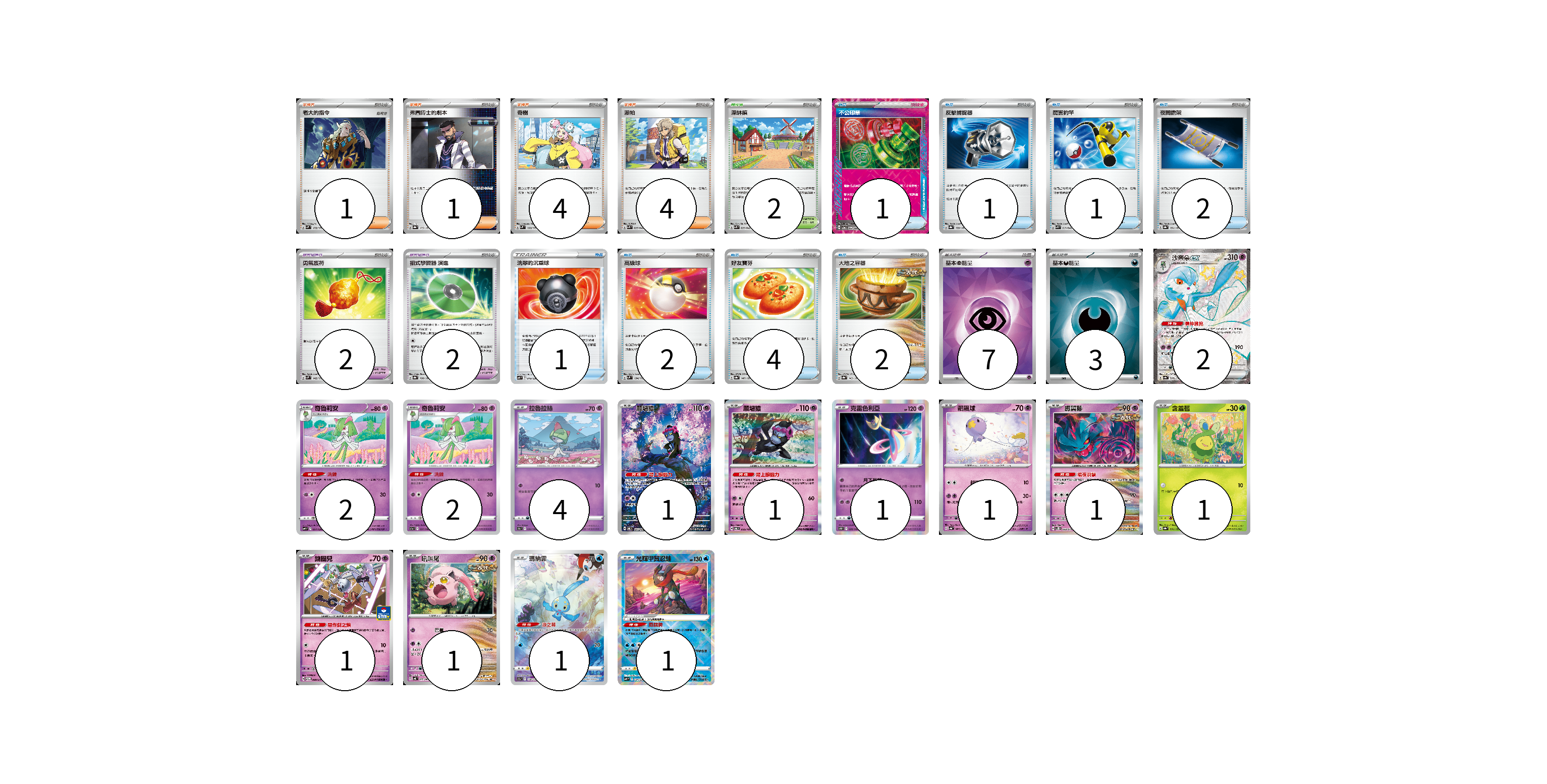 牌組構築方案 以此牌組為基礎新構築牌組 顯示卡面 顯示列表 寶可夢卡(20) 2 2 2 4 1 1 1 1 1 1 1 1 1 1 寶可夢道具(4) 2 2 物品卡(14) 1 1 1 2 1 2 4 2 支援者卡(10) 1 1 4 4 競技場卡(2) 2 能量卡(10) 7 3 寶可夢卡(20) 卡牌名稱 張數 卡牌名稱 張數 沙奈朵ex SV4a 328/190 02 奇魯莉安 SVF 007/038 02 奇魯莉安 S11a 037/068 02 拉魯拉絲 S9a 032/067 04 願增猿 SV6 107/101 01 願增猿 SV6 055/101 01 克雷色利亞 S10D 028/067 01 飄飄球 SV4a 083/190 01 振翼髮 SV5K 033/071 01 含羞苞 SV8a 001/187 01 鑰圈兒 SV-P 089/SV-P 01 吼叫尾 SV4K 032/066 01 瑪納霏 S12a 178/172 01 光輝甲賀忍蛙 SVF 004/038 01 寶可夢道具(4) 卡牌名稱 張數 卡牌名稱 張數 勇氣護符 SVM 142/175 02 招式學習器 演進 SV8a 160/187 02 物品卡(14) 卡牌名稱 張數 卡牌名稱 張數 不公印章 SV5a 053/066 01 反擊捕捉器 SV8a 139/187 01 厲害釣竿 SVK 011/042 01 夜間擔架 SV8a 151/187 02 洗翠的沉重球 SVF 019/038 01 高級球 SVM 134/175 02 好友寶芬 SV8a 147/187 04 大地之容器 SV8a 143/187 02 支援者卡(10) 卡牌名稱 張數 卡牌名稱 張數 老大的指令 SVM 172/175 01 弗圖博士的劇本 SV8a 175/187 01 奇樹 SVM 160/175 04 派帕 SVK 035/042 04 競技場卡(2) 卡牌名稱 張數 卡牌名稱 張數 深缽鎮 SVK 039/042 02 能量卡(10) 卡牌名稱 張數 卡牌名稱 張數 基本【超】能量 SVK PSY 07 基本【惡】能量 SVK DAR 03 以此牌組為基礎新構築牌組 牌組編碼 tdbcXY-bEbFAW-JNkmJe copy 列印牌組單 牌組編碼已複製 分享至SNS
