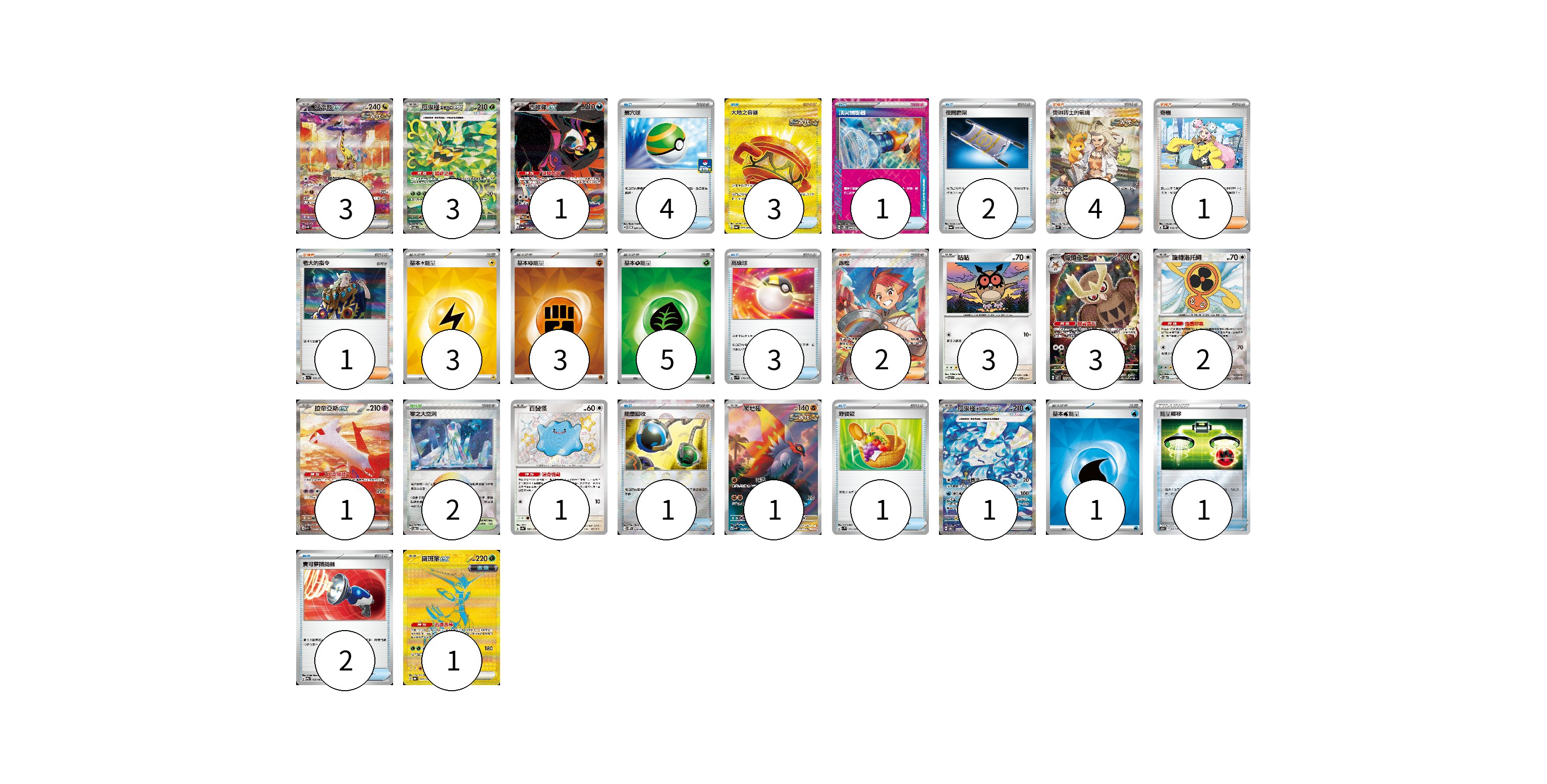 牌組構築方案 以此牌組為基礎新構築牌組 顯示卡面 顯示列表 寶可夢卡(20) 3 3 1 3 3 2 1 1 1 1 1 物品卡(18) 4 3 1 2 3 1 1 1 2 支援者卡(8) 4 1 1 2 競技場卡(2) 2 能量卡(12) 3 3 5 1 寶可夢卡(20) 卡牌名稱 張數 卡牌名稱 張數 猛雷鼓ex SV5K 095/071 03 厄鬼椪 碧草面具ex SV6 125/101 03 吉雉雞ex SV6a 089/064 01 咕咕 SV7 076/102 03 貓頭夜鷹 SV7 114/102 03 旋轉洛托姆 SV8a 131/187 02 拉帝亞斯ex SV7a 087/064 01 百變怪 SV4a 309/190 01 爬地翅 SV4K 074/066 01 厄鬼椪 水井面具ex SV6 127/101 01 鐵斑葉ex SV8a 233/187 01 物品卡(18) 卡牌名稱 張數 卡牌名稱 張數 巢穴球 SV-P 091/SV-P 04 大地之容器 SV6a 093/064 03 頂尖捕捉器 SV5M 062/071 01 夜間擔架 SV6a 056/064 02 高級球 SV1V 070/078 03 能量回收 SV11W 079/086 01 野餐籃 SV1V 071/078 01 能量轉移 SO 017/030 01 寶可夢捕捉器 SV9a 059/063 02 支援者卡(8) 卡牌名稱 張數 卡牌名稱 張數 奧琳博士的氣魄 SV4K 091/066 04 奇樹 SV2D 069/071 01 老大的指令 SV1a 069/073 01 赤松 SV7 123/102 02 競技場卡(2) 卡牌名稱 張數 卡牌名稱 張數 零之大空洞 SV8a 182/187 02 能量卡(12) 卡牌名稱 張數 卡牌名稱 張數 基本【雷】能量 SVK LIG 03 基本【鬥】能量 SVK FIG 03 基本【草】能量 SVK GRA 05 基本【水】能量 SVM WAT 01 以此牌組為基礎新構築牌組 牌組編碼 tfNKUB-mEuecE-EilfCw copy 列印牌組單 牌組編碼已複製 分享至SNS