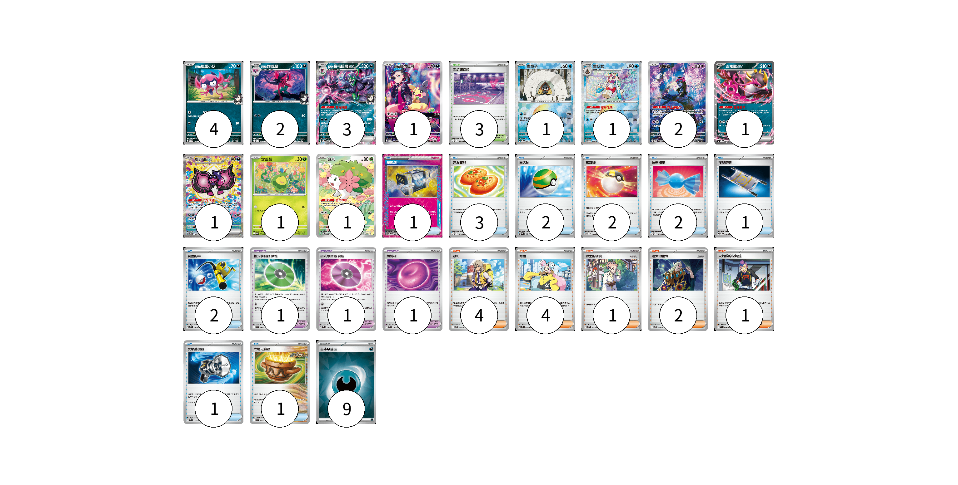 牌組構築方案 以此牌組為基礎新構築牌組 顯示卡面 顯示列表 寶可夢卡(18) 4 2 3 1 1 1 2 1 1 1 1 寶可夢道具(3) 1 1 1 物品卡(15) 1 3 2 2 2 1 2 1 1 支援者卡(12) 4 4 1 2 1 競技場卡(3) 3 能量卡(9) 9 寶可夢卡(18) 卡牌名稱 張數 卡牌名稱 張數 <瑪俐的>搗蛋小妖 SVOM 005/021 04 <瑪俐的>詐唬魔 SVOM 006/021 02 <瑪俐的>長毛巨魔ex SVOM 007/021 03 <瑪俐的>莫魯貝可 SVOM 022/021 01 雪童子 SV8a 037/187 01 雪妖女 SV8a 038/187 01 願增猿 SV6 107/101 02 吉雉雞ex SVOD 004/020 01 桃歹郎ex SV8a 219/187 01 含羞苞 SV8a 001/187 01 謝米 SV9a 066/063 01 寶可夢道具(3) 卡牌名稱 張數 卡牌名稱 張數 招式學習器 演進 SV8a 160/187 01 招式學習器 衰退 SV8a 161/187 01 鎖鏈糬 SV8a 154/187 01 物品卡(15) 卡牌名稱 張數 卡牌名稱 張數 秘密箱 SV6 092/101 01 好友寶芬 SVOD 011/020 03 巢穴球 SVM 133/175 02 高級球 SVOD 012/020 02 神奇糖果 SVOD 013/020 02 夜間擔架 SVOM 016/021 01 厲害釣竿 SVOD 010/020 02 反擊捕捉器 SV8a 139/187 01 大地之容器 SV8a 143/187 01 支援者卡(12) 卡牌名稱 張數 卡牌名稱 張數 派帕 SVOD 018/020 04 奇樹 SVOD 016/020 04 博士的研究 SVOM 019/021 01 老大的指令 SVOD 019/020 02 火箭隊的拉姆達 SV10 094/098 01 競技場卡(3) 卡牌名稱 張數 卡牌名稱 張數 尖釘鎮道館 SVOM 021/021 03 能量卡(9) 卡牌名稱 張數 卡牌名稱 張數 基本【惡】能量 SVOM DAR 09 以此牌組為基礎新構築牌組 牌組編碼 thsCNy-pEYdAj-eidoYf copy 列印牌組單 牌組編碼已複製 分享至SNS