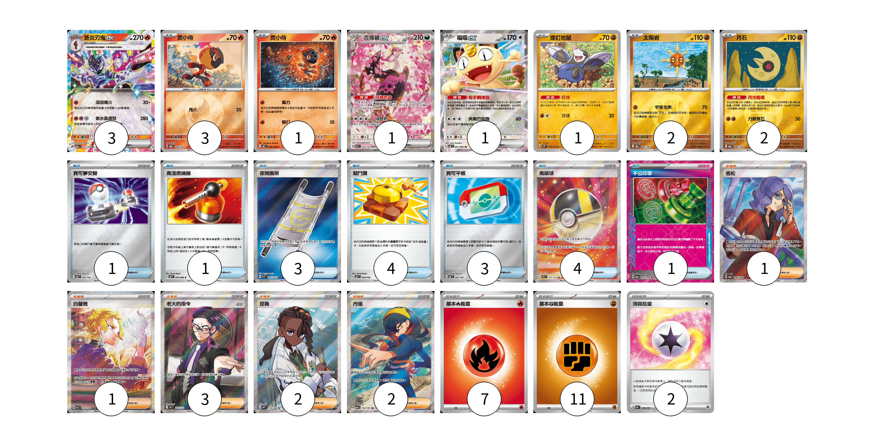 牌組構築方案 以此牌組為基礎新構築牌組 顯示卡面 顯示列表 寶可夢卡(14) 3 3 1 1 1 1 2 2 物品卡(17) 1 1 3 4 3 4 1 支援者卡(9) 1 1 3 2 2 能量卡(20) 7 11 2 寶可夢卡(14) 卡牌名稱 張數 卡牌名稱 張數 蒼炎刃鬼ex M2a 031/193 03 炭小侍 M2a 030/193 03 炭小侍 M2 019/080 01 吉雉雞ex M2a 244/193 01 喵喵ex M3 061/080 01 螺釘地鼠 SV5M 039/071 01 太陽岩 M2a 087/193 02 月石 M2a 086/193 02 物品卡(17) 卡牌名稱 張數 卡牌名稱 張數 寶可夢交替 MC 663/742 01 高溫燃燒器 M2 074/080 01 夜間擔架 M1L 083/063 03 戰鬥鑼 MC 654/742 04 寶可平板 MC 662/742 03 高級球 M2a 216/193 04 不公印章 SV5a 053/066 01 支援者卡(9) 卡牌名稱 張數 卡牌名稱 張數 悟松 SV5a 086/066 01 白蕾雅 SV7 132/102 01 老大的指令(烏羽) MC 760/742 03 琵魯 M3 106/080 02 丹瑜 SV6 123/101 02 能量卡(20) 卡牌名稱 張數 卡牌名稱 張數 基本【火】能量 MC FIR 07 基本【鬥】能量 MC FIG 11 薄霧能量 SV8a 186/187 02 以此牌組為基礎新構築牌組 牌組編碼 tmhmxz-taxBhY-CLzfhm copy 列印牌組單 牌組編碼已複製 分享至SNS