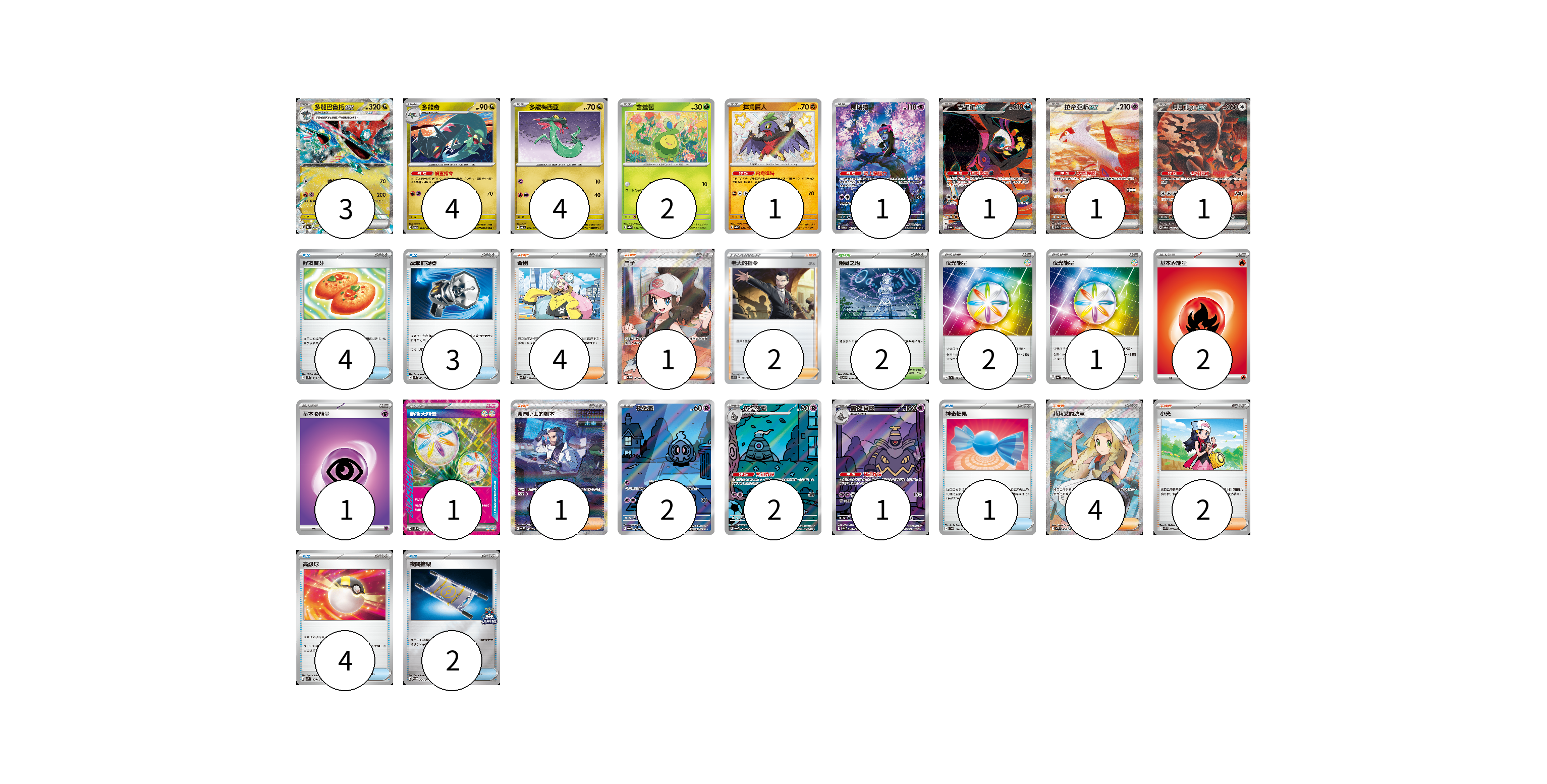 牌組構築方案 以此牌組為基礎新構築牌組 顯示卡面 顯示列表 寶可夢卡(23) 3 4 4 2 1 1 1 1 1 2 2 1 物品卡(14) 4 3 1 4 2 支援者卡(14) 4 1 2 1 4 2 競技場卡(2) 2 能量卡(7) 2 1 2 1 1 寶可夢卡(23) 卡牌名稱 張數 卡牌名稱 張數 多龍巴魯托ex SV8a 120/187 03 多龍奇 SV6 080/101 04 多龍梅西亞 SV6 079/101 04 含羞苞 SV8a 001/187 02 摔角鷹人 SV4a 282/190 01 願增猿 SV6 107/101 01 吉雉雞ex SV6a 089/064 01 拉帝亞斯ex SV7a 087/064 01 月月熊 赫月ex SV8a 225/187 01 夜巡靈 SV6a 068/064 02 彷徨夜靈 SV6a 069/064 02 黑夜魔靈 SV6a 070/064 01 物品卡(14) 卡牌名稱 張數 卡牌名稱 張數 好友寶芬 SV5K 063/071 04 反擊捕捉器 SV4M 059/066 03 神奇糖果 SVD 120/139 01 高級球 SVM 134/175 04 夜間擔架 SV-P 204/SV-P 02 支援者卡(14) 卡牌名稱 張數 卡牌名稱 張數 奇樹 SVK 031/042 04 鬥子 SV11W 166/086 01 老大的指令(坂木) SC1D 161/164 02 弗圖博士的劇本 SV4M 091/066 01 莉莉艾的決意 M1L 086/063 04 小光 M2 077/080 02 競技場卡(2) 卡牌名稱 張數 卡牌名稱 張數 阻礙之塔 SV6 100/101 02 能量卡(7) 卡牌名稱 張數 卡牌名稱 張數 夜光能量 SV1a 073/073 02 夜光能量 SV4a 190/190 01 基本火能量 sv-p FIR 02 基本超能量 sv-p PSY 01 新衝天能量 SV5K 071/071 01 以此牌組為基礎新構築牌組 牌組編碼 tpQHcN-lLAQaA-kXJlpE copy 列印牌組單 牌組編碼已複製 分享至SNS