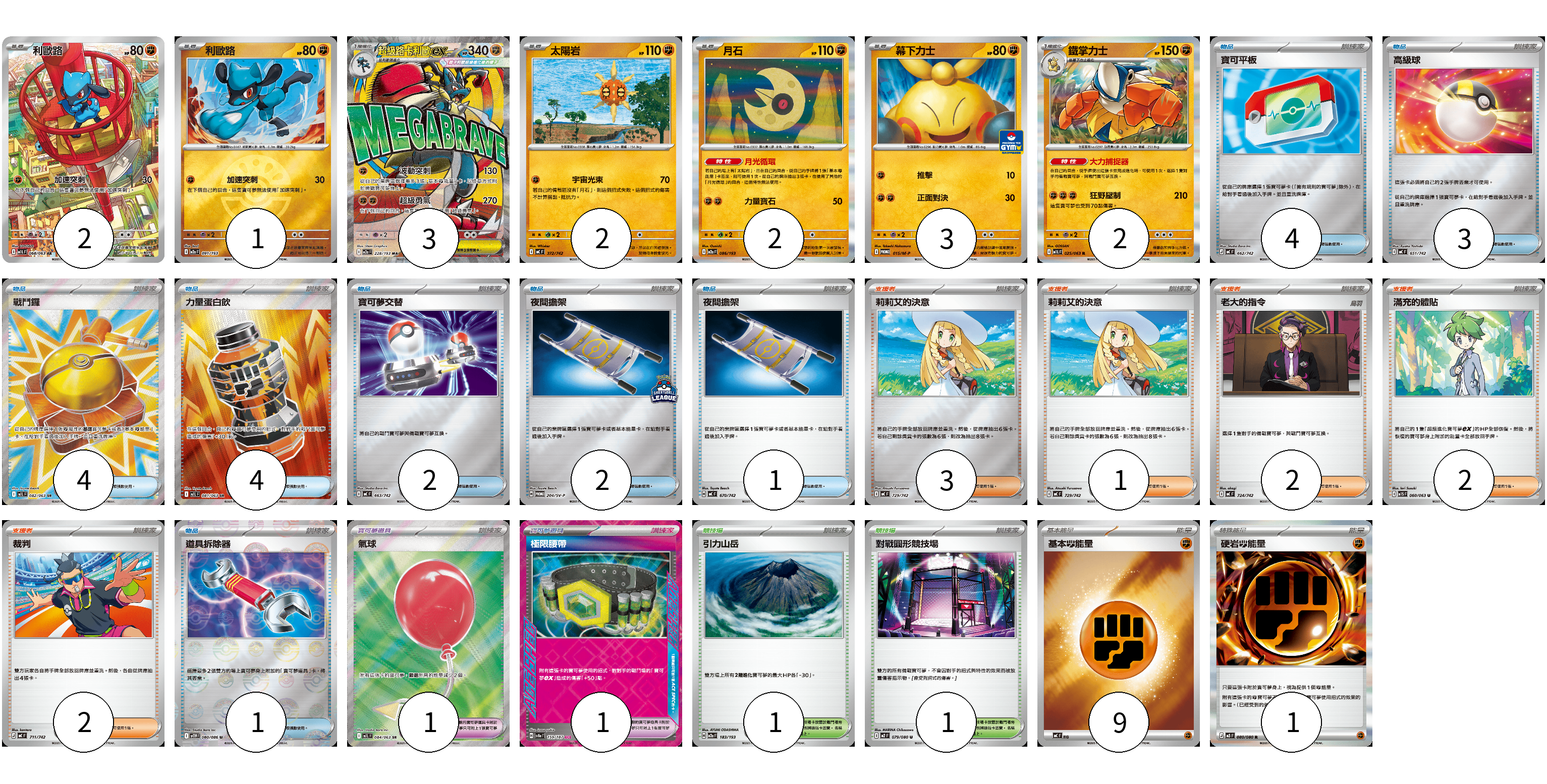 牌組構築方案 以此牌組為基礎新構築牌組 顯示卡面 顯示列表 寶可夢卡(15) 2 1 3 2 2 3 2 寶可夢道具(2) 1 1 物品卡(21) 4 3 4 4 2 2 1 1 支援者卡(10) 3 1 2 2 2 競技場卡(2) 1 1 能量卡(10) 9 1 寶可夢卡(15) 卡牌名稱 張數 卡牌名稱 張數 利歐路 M1L 068/063 02 利歐路 M2a 091/193 01 超級路卡利歐ex M2a 228/193 03 太陽岩 MC 372/742 02 月石 M2a 086/193 02 幕下力士 M-P 015/M-P 03 鐵掌力士 M1L 025/063 02 寶可夢道具(2) 卡牌名稱 張數 卡牌名稱 張數 氣球 M1L 084/063 01 極限腰帶 SV8a 159/187 01 物品卡(21) 卡牌名稱 張數 卡牌名稱 張數 寶可平板 MC 662/742 04 高級球 MC 651/742 03 戰鬥鑼 M1L 082/063 04 力量蛋白飲 M1L 081/063 04 寶可夢交替 MC 663/742 02 夜間擔架 SV-P 204/SV-P 02 夜間擔架 MC 670/742 01 道具拆除器 SV11W 080/086 01 支援者卡(10) 卡牌名稱 張數 卡牌名稱 張數 莉莉艾的決意 MC 729/742 03 莉莉艾的決意 MC 729/742 01 老大的指令 MC 724/742 02 滿充的體貼 M1S 060/063 02 裁判 MC 711/742 02 競技場卡(2) 卡牌名稱 張數 卡牌名稱 張數 引力山岳 M2a 183/193 01 對戰圓形競技場 M2 079/080 01 能量卡(10) 卡牌名稱 張數 卡牌名稱 張數 基本【鬥】能量 MC FIG 09 硬岩【鬥】能量 M3 080/080 01 以此牌組為基礎新構築牌組 牌組編碼 trNZwi-ZlLoEF-VQCBkU copy 列印牌組單 牌組編碼已複製 分享至SNS