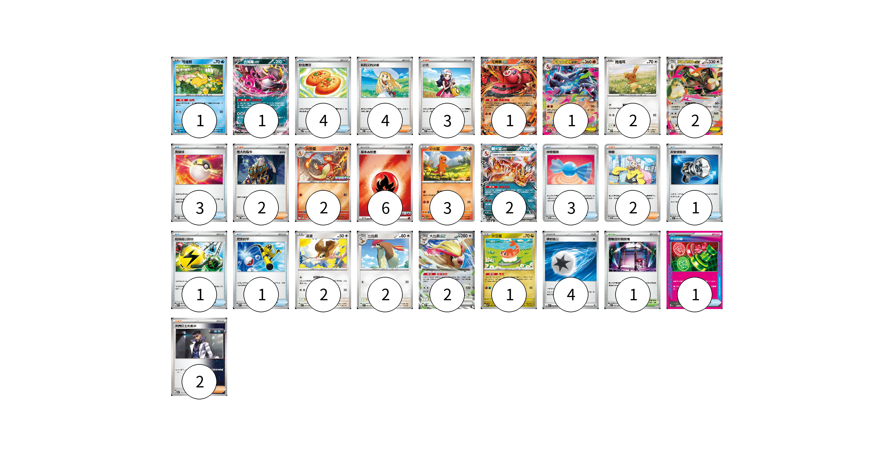 牌組構築方案 以此牌組為基礎新構築牌組 顯示卡面 顯示列表 寶可夢卡(22) 1 1 1 1 2 2 2 3 2 2 2 2 1 寶可夢道具(2) 2 物品卡(14) 4 3 3 1 1 1 1 支援者卡(11) 4 3 2 2 競技場卡(1) 1 能量卡(10) 6 4 寶可夢卡(22) 卡牌名稱 張數 卡牌名稱 張數 可達鴨 M2a 032/193 01 吉雉雞ex M2a 114/193 01 花舞鳥ex M2 018/080 01 超級噴火龍Xex M2 013/080 01 捲捲耳 M2 071/080 02 超級長耳兔ex M2 072/080 02 火恐龍 M-P 021/M-P 02 小火龍 SVTL 001/021 03 噴火龍ex SVTL 006/021 02 波波 SVK 003/042 02 比比鳥 SVK 004/042 02 大比鳥ex SVK 005/042 02 米立龍 SVK 002/042 01 寶可夢道具(2) 卡牌名稱 張數 卡牌名稱 張數 奇樹 SVTL 018/021 02 物品卡(14) 卡牌名稱 張數 卡牌名稱 張數 好友寶芬 M2a 153/193 04 高級球 MBD 014/022 03 神奇糖果 SVTL 013/021 03 反擊捕捉器 SVK 009/042 01 超級能量回收 SVK 010/042 01 厲害釣竿 SVK 011/042 01 不公印章 MBD 011/022 01 支援者卡(11) 卡牌名稱 張數 卡牌名稱 張數 莉莉艾的決意 M2a 175/193 04 小光 M2 077/080 03 老大的指令 MBD 020/022 02 弗圖博士的劇本 SV8a 175/187 02 競技場卡(1) 卡牌名稱 張數 卡牌名稱 張數 對戰圓形競技場 M2 079/080 01 能量卡(10) 卡牌名稱 張數 卡牌名稱 張數 基本【火】能量 M-P 032/M-P 06 噴射能量 SVK 040/042 04 以此牌組為基礎新構築牌組 牌組編碼 ttyvSV-qhOtmX-BgbJkm copy 列印牌組單 牌組編碼已複製 分享至SNS