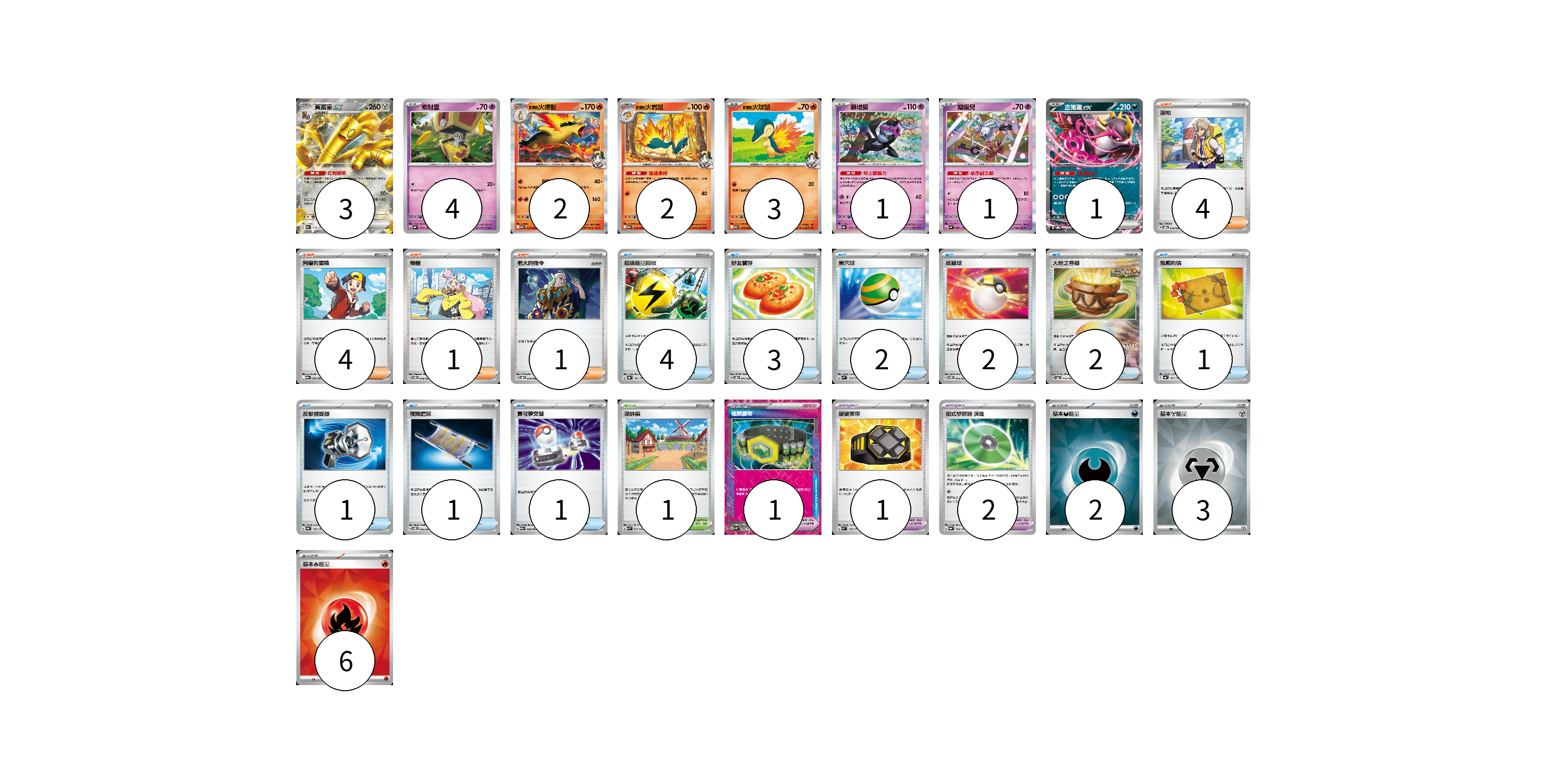 牌組構築方案 以此牌組為基礎新構築牌組 顯示卡面 顯示列表 寶可夢卡(17) 3 4 2 2 3 1 1 1 寶可夢道具(4) 1 1 2 物品卡(17) 4 3 2 2 2 1 1 1 1 支援者卡(10) 4 4 1 1 競技場卡(1) 1 能量卡(11) 2 3 6 寶可夢卡(17) 卡牌名稱 張數 卡牌名稱 張數 賽富豪ex SV8a 117/187 03 索財靈 SV8a 073/187 04 <阿響的>火爆獸 SV9a 017/063 02 <阿響的>火岩鼠 SV9a 016/063 02 <阿響的>火球鼠 SV9a 015/063 03 願增猿 SV8a 075/187 01 鑰圈兒 SV4a 087/190 01 吉雉雞ex SVOD 004/020 01 寶可夢道具(4) 卡牌名稱 張數 卡牌名稱 張數 極限腰帶 SV5K 066/071 01 硬硬束帶 SVM 139/175 01 招式學習器 演進 SV8a 160/187 02 物品卡(17) 卡牌名稱 張數 卡牌名稱 張數 超級能量回收 SV8a 141/187 04 好友寶芬 SVOD 011/020 03 巢穴球 SVM 133/175 02 高級球 SVOM 013/021 02 大地之容器 SV8a 143/187 02 勉勵的信 SV4a 162/190 01 反擊捕捉器 SV8a 139/187 01 夜間擔架 SVOM 016/021 01 寶可夢交替 SV9a 058/063 01 支援者卡(10) 卡牌名稱 張數 卡牌名稱 張數 派帕 SVOD 018/020 04 阿響的冒險 SV9a 063/063 04 奇樹 SVOM 018/021 01 老大的指令 SVOD 019/020 01 競技場卡(1) 卡牌名稱 張數 卡牌名稱 張數 深缽鎮 SVK 039/042 01 能量卡(11) 卡牌名稱 張數 卡牌名稱 張數 基本【惡】能量 SVOM DAR 02 基本【鋼】能量 SVOD MET 03 基本【火】能量 SVK FIR 06 以此牌組為基礎新構築牌組 牌組編碼 tuXsXT-SJqlUA-ItRQbN copy 列印牌組單 牌組編碼已複製 分享至SNS