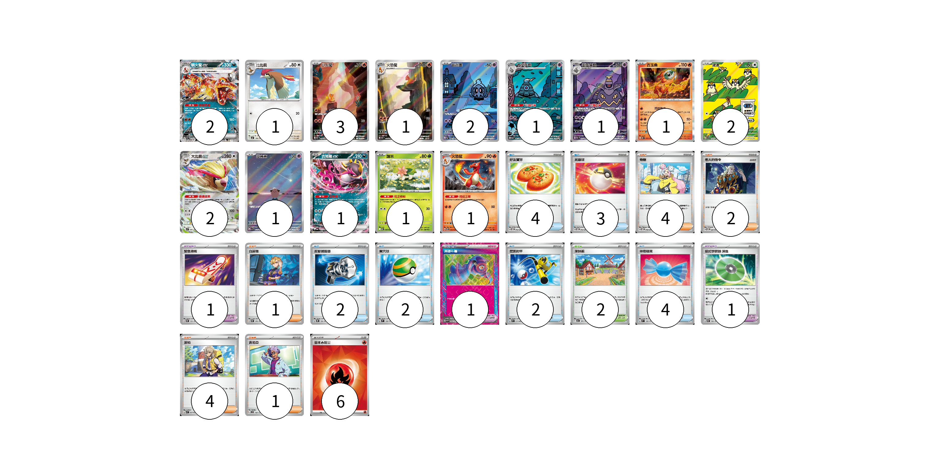 牌組構築方案 以此牌組為基礎新構築牌組 顯示卡面 顯示列表 寶可夢卡(20) 2 1 3 1 2 1 1 1 2 2 1 1 1 1 寶可夢道具(3) 1 1 1 物品卡(17) 4 3 2 2 2 4 支援者卡(12) 4 2 1 4 1 競技場卡(2) 2 能量卡(6) 6 寶可夢卡(20) 卡牌名稱 張數 卡牌名稱 張數 噴火龍ex SV4a 115/190 02 比比鳥 SV4a 138/190 01 小火龍 SV2a 168/165 03 火恐龍 SV2a 169/165 01 夜巡靈 SV6a 068/064 02 彷徨夜靈 SV6a 069/064 01 黑夜魔靈 SV6a 070/064 01 古玉魚 SV8a 025/187 01 波波 SV3 118/108 02 大比鳥ex SV3 089/108 02 皮寶寶 SV3 113/108 01 吉雉雞ex SV6a 038/064 01 謝米 SV9a 006/063 01 火恐龍 SVTL 002/021 01 寶可夢道具(3) 卡牌名稱 張數 卡牌名稱 張數 緊急滑板 SV8a 153/187 01 英雄斗篷 SV5M 064/071 01 招式學習器 演進 SV8a 160/187 01 物品卡(17) 卡牌名稱 張數 卡牌名稱 張數 好友寶芬 SVOM 012/021 04 高級球 SVOM 013/021 03 反擊捕捉器 SV8a 139/187 02 巢穴球 SVM 133/175 02 厲害釣竿 SVK 011/042 02 神奇糖果 SVM 135/175 04 支援者卡(12) 卡牌名稱 張數 卡牌名稱 張數 奇樹 SVOM 018/021 04 老大的指令 SVOM 020/021 02 白蕾雅 SV8a 176/187 01 派帕 SVK 035/042 04 吉尼亞 SVD 129/139 01 競技場卡(2) 卡牌名稱 張數 卡牌名稱 張數 深缽鎮 SV4a 185/190 02 能量卡(6) 卡牌名稱 張數 卡牌名稱 張數 基本【火】能量 SVK FIR 06 以此牌組為基礎新構築牌組 牌組編碼 twNLTF-xLGwot-ZVUZJY copy 列印牌組單 牌組編碼已複製 分享至SNS