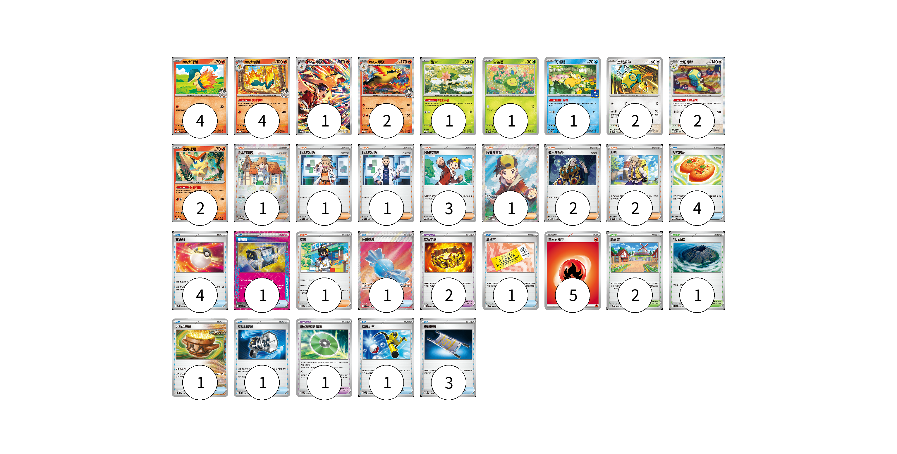牌組構築方案 以此牌組為基礎新構築牌組 顯示卡面 顯示列表 寶可夢卡(20) 4 4 1 2 1 1 1 2 2 2 寶可夢道具(3) 2 1 物品卡(17) 4 4 1 1 1 1 1 1 3 支援者卡(12) 1 1 1 3 1 2 2 1 競技場卡(3) 2 1 能量卡(5) 5 寶可夢卡(20) 卡牌名稱 張數 卡牌名稱 張數 <阿響的>火球鼠 SV9a 015/063 04 <阿響的>火岩鼠 SV9a 016/063 04 <阿響的>火爆獸 SV9a 070/063 01 <阿響的>火爆獸 SV9a 017/063 02 謝米 SV9a 006/063 01 含羞苞 SV8a 001/187 01 可達鴨 SV-P 220/SV-P 01 土龍弟弟 SV8a 129/187 02 土龍節節 SV8a 130/187 02 比克提尼 SV8 012/106 02 寶可夢道具(3) 卡牌名稱 張數 卡牌名稱 張數 猛攻手鐲 SV11W 082/086 02 招式學習器 演進 SV8a 160/187 01 物品卡(17) 卡牌名稱 張數 卡牌名稱 張數 好友寶芬 MBD 013/022 04 高級球 MBD 014/022 04 秘密箱 SV6 092/101 01 神奇糖果 M1S 082/063 01 調換票 SV9 090/100 01 大地之容器 SVHK 011/022 01 反擊捕捉器 SV8a 139/187 01 厲害釣竿 SVOD 010/020 01 夜間擔架 MBD 016/022 03 支援者卡(12) 卡牌名稱 張數 卡牌名稱 張數 博士的研究 SV11B 084/086 01 博士的研究 SVK 032/042 01 博士的研究 SVK 033/042 01 阿響的冒險 SV9a 063/063 03 阿響的冒險 SV9a 084/063 01 老大的指令 MBD 020/022 02 派帕 SVK 035/042 02 烏栗 SV8a 169/187 01 競技場卡(3) 卡牌名稱 張數 卡牌名稱 張數 深缽鎮 SVK 039/042 02 引力山岳 SV8 106/106 01 能量卡(5) 卡牌名稱 張數 卡牌名稱 張數 基本火能量 sv-p FIR 05 以此牌組為基礎新構築牌組 牌組編碼 tzDcWi-KQFCoO-DEUWSZ copy 列印牌組單 牌組編碼已複製 分享至SNS