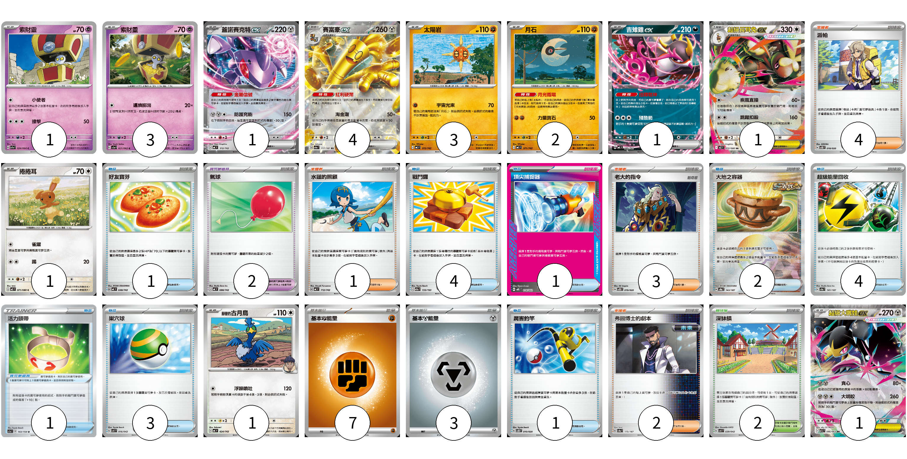 牌組構築方案 以此牌組為基礎新構築牌組 顯示卡面 顯示列表 寶可夢卡(19) 1 3 1 4 3 2 1 1 1 1 1 寶可夢道具(3) 2 1 物品卡(16) 1 4 1 2 4 3 1 支援者卡(10) 4 1 3 2 競技場卡(2) 2 能量卡(10) 7 3 寶可夢卡(19) 卡牌名稱 張數 卡牌名稱 張數 索財靈 SV7a 024/064 01 索財靈 SV3a 021/062 03 蓋諾賽克特ex MC 512/742 01 賽富豪ex SV8a 117/187 04 太陽岩 MC 372/742 03 月石 MC 371/742 02 吉雉雞ex MC 489/742 01 超級長耳兔ex M2 072/080 01 捲捲耳 M2 071/080 01 赫普的古月鳥 MC 624/742 01 超級大嘴娃ex M1L 046/063 01 寶可夢道具(3) 卡牌名稱 張數 卡牌名稱 張數 氣球 MC 688/742 02 活力頭帶 SC1a 143/154 01 物品卡(16) 卡牌名稱 張數 卡牌名稱 張數 好友寶芬 MC 648/742 01 戰鬥鑼 M2a 155/193 04 頂尖捕捉器 MBG 014/022 01 大地之容器 SV8a 143/187 02 超級能量回收 SV8a 141/187 04 巢穴球 SVK 016/042 03 厲害釣竿 SVOD 010/020 01 支援者卡(10) 卡牌名稱 張數 卡牌名稱 張數 派帕 SVOD 018/020 04 水蓮的照顧 MC 712/742 01 老大的指令 SVOD 019/020 03 弗圖博士的劇本 SV8a 175/187 02 競技場卡(2) 卡牌名稱 張數 卡牌名稱 張數 深缽鎮 SVK 039/042 02 能量卡(10) 卡牌名稱 張數 卡牌名稱 張數 基本【鬥】能量 MC FIG 07 基本【鋼】能量 MC MET 03 以此牌組為基礎新構築牌組 牌組編碼 uAjjbV-TnHICu-kWIsIQ copy 列印牌組單 牌組編碼已複製 分享至SNS