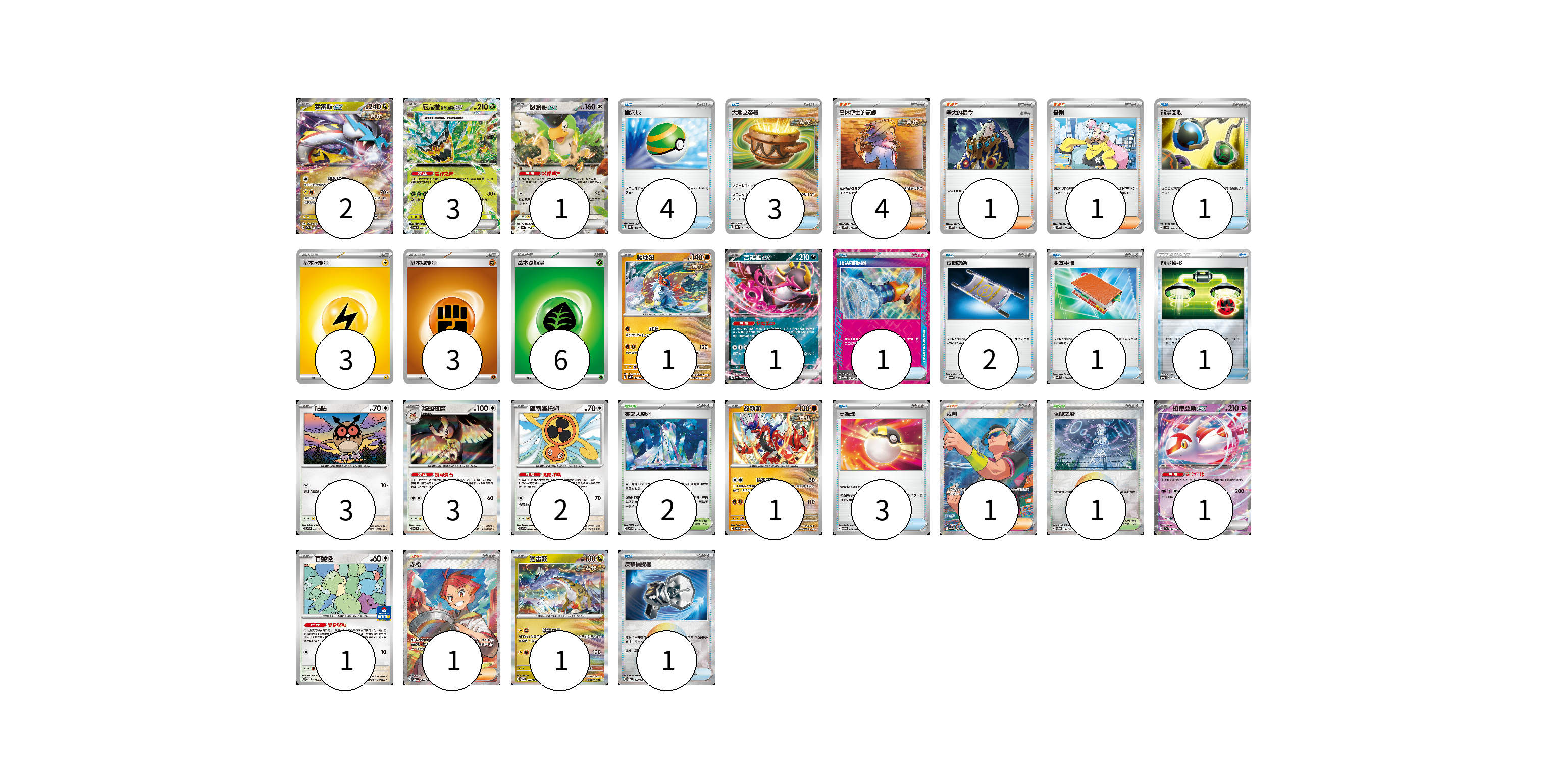 牌組構築方案 以此牌組為基礎新構築牌組 顯示卡面 顯示列表 寶可夢卡(20) 2 3 1 1 1 3 3 2 1 1 1 1 物品卡(17) 4 3 1 1 2 1 1 3 1 支援者卡(8) 4 1 1 1 1 競技場卡(3) 2 1 能量卡(12) 3 3 6 寶可夢卡(20) 卡牌名稱 張數 卡牌名稱 張數 猛雷鼓ex SV5K 053/071 02 厄鬼椪 碧草面具ex SV6 016/101 03 怒鸚哥ex SV4a 154/190 01 爬地翅 SV4K 041/066 01 吉雉雞ex SV6a 038/064 01 咕咕 SV7 076/102 03 貓頭夜鷹 SV7 077/102 03 旋轉洛托姆 SV7 080/102 02 故勒頓 SV8 069/106 01 拉帝亞斯ex SV7a 019/064 01 百變怪 SV-P 111/SV-P 01 猛雷鼓 SV7 075/102 01 物品卡(17) 卡牌名稱 張數 卡牌名稱 張數 巢穴球 SVHK 012/022 04 大地之容器 SVHK 011/022 03 能量回收 SVD 110/139 01 頂尖捕捉器 SV5M 062/071 01 夜間擔架 SV6a 056/064 02 朋友手冊 SVK 014/042 01 能量轉移 SO 017/030 01 高級球 SVOD 012/020 03 反擊捕捉器 SV8a 139/187 01 支援者卡(8) 卡牌名稱 張數 卡牌名稱 張數 奧琳博士的氣魄 SVHK 017/022 04 老大的指令 SVHK 022/022 01 奇樹 SVHK 019/022 01 裁判 SV9a 083/063 01 赤松 SV7 123/102 01 競技場卡(3) 卡牌名稱 張數 卡牌名稱 張數 零之大空洞 SV7 102/102 02 阻礙之塔 SV8a 181/187 01 能量卡(12) 卡牌名稱 張數 卡牌名稱 張數 基本【雷】能量 SVHM LIG 03 基本【鬥】能量 SVHK FIG 03 基本【草】能量 SVF GRA 06 以此牌組為基礎新構築牌組 牌組編碼 uFqgCA-gamNXN-XtzSSO copy 列印牌組單 牌組編碼已複製 分享至SNS