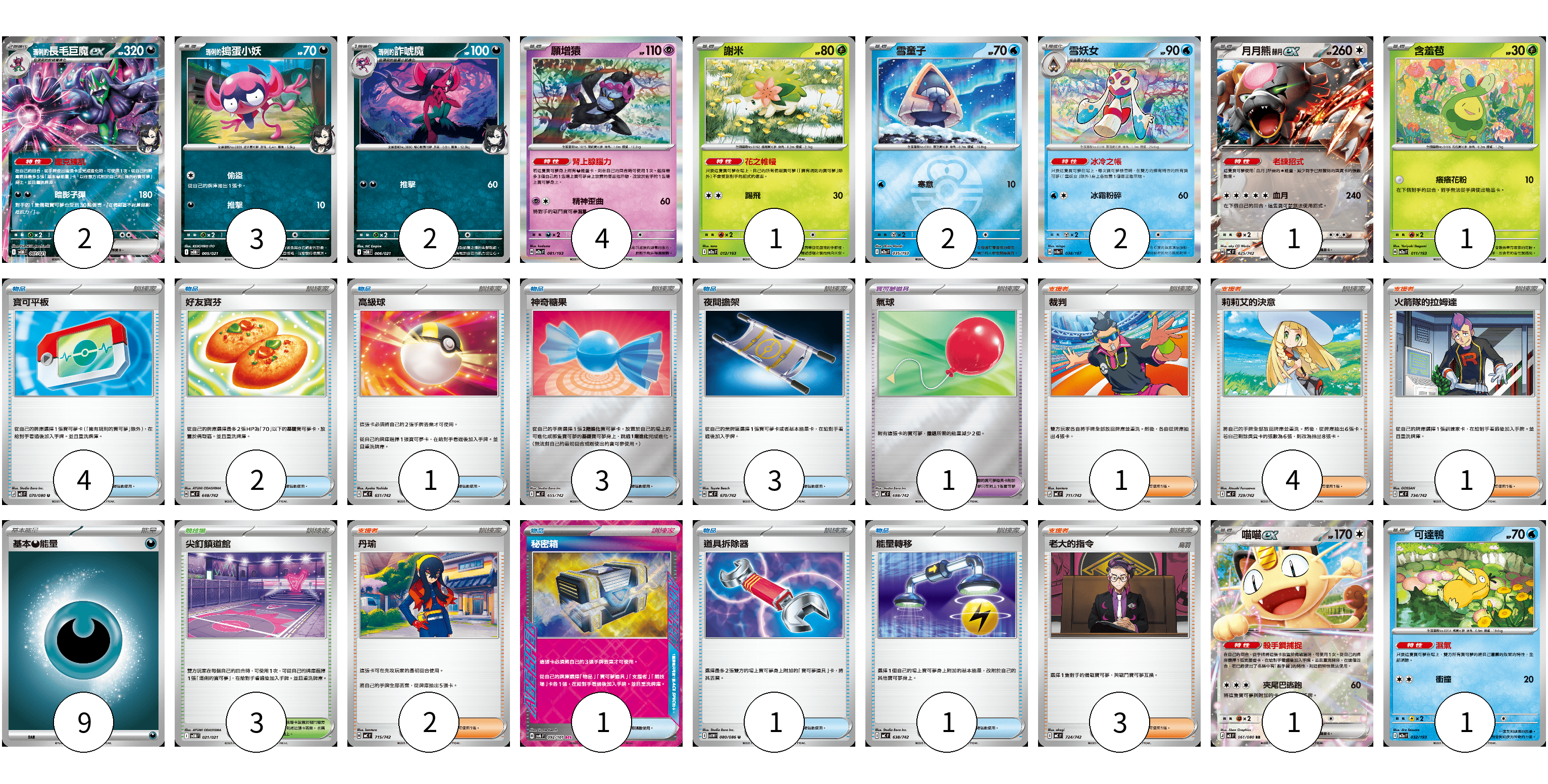 牌組構築方案 以此牌組為基礎新構築牌組 顯示卡面 顯示列表 寶可夢卡(20) 2 3 2 4 1 2 2 1 1 1 1 寶可夢道具(1) 1 物品卡(16) 4 2 1 3 3 1 1 1 支援者卡(11) 1 4 1 2 3 競技場卡(3) 3 能量卡(9) 9 寶可夢卡(20) 卡牌名稱 張數 卡牌名稱 張數 <瑪俐的>長毛巨魔ex SVOM 007/021 02 <瑪俐的>搗蛋小妖 SVOM 005/021 03 <瑪俐的>詐唬魔 SVOM 006/021 02 願增猿 M2a 081/193 04 謝米 M2a 012/193 01 雪童子 M2a 035/193 02 雪妖女 SV8a 038/187 02 月月熊 赫月 ex MC 625/742 01 含羞苞 M2a 011/193 01 喵喵ex M3 061/080 01 可達鴨 M2a 032/193 01 寶可夢道具(1) 卡牌名稱 張數 卡牌名稱 張數 氣球 MC 688/742 01 物品卡(16) 卡牌名稱 張數 卡牌名稱 張數 寶可平板 M3 070/080 04 好友寶芬 MC 648/742 02 高級球 MC 651/742 01 神奇糖果 MC 655/742 03 夜間擔架 MC 670/742 03 秘密箱 SV6 092/101 01 道具拆除器 SV11W 080/086 01 能量轉移 MC 638/742 01 支援者卡(11) 卡牌名稱 張數 卡牌名稱 張數 裁判 MC 711/742 01 莉莉艾的決意 MC 729/742 04 火箭隊的拉姆達 MC 734/742 01 丹瑜 MC 715/742 02 老大的指令 MC 724/742 03 競技場卡(3) 卡牌名稱 張數 卡牌名稱 張數 尖釘鎮道館 SVOM 021/021 03 能量卡(9) 卡牌名稱 張數 卡牌名稱 張數 基本【惡】能量 MC DAR 09 以此牌組為基礎新構築牌組 牌組編碼 uGysBF-PkaSlx-ewaFVs copy 列印牌組單 牌組編碼已複製 分享至SNS