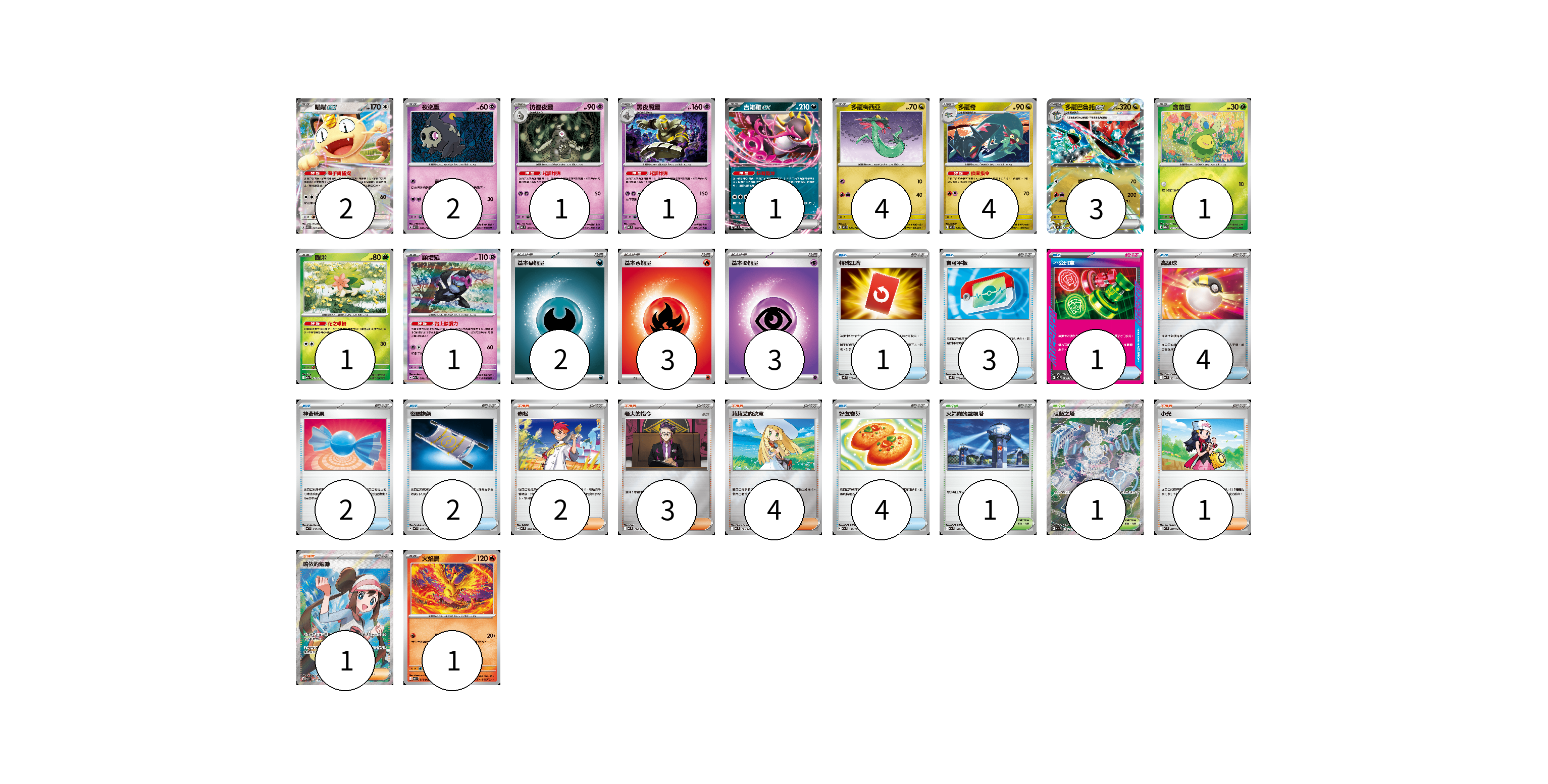牌組構築方案 以此牌組為基礎新構築牌組 顯示卡面 顯示列表 寶可夢卡(22) 2 2 1 1 1 4 4 3 1 1 1 1 物品卡(17) 1 3 1 4 2 2 4 支援者卡(11) 2 3 4 1 1 競技場卡(2) 1 1 能量卡(8) 2 3 3 寶可夢卡(22) 卡牌名稱 張數 卡牌名稱 張數 喵喵ex M3 061/080 02 夜巡靈 MC 308/742 02 彷徨夜靈 MC 309/742 01 黑夜魔靈 MC 310/742 01 吉雉雞ex MC 489/742 01 多龍梅西亞 MC 546/742 04 多龍奇 MC 547/742 04 多龍巴魯托ex MC 548/742 03 含羞苞 M2a 011/193 01 謝米 M2a 012/193 01 願增猿 M2a 081/193 01 火焰鳥 M2 014/080 01 物品卡(17) 卡牌名稱 張數 卡牌名稱 張數 特殊紅牌 M4 072/083 01 寶可平板 M3 070/080 03 不公印章 MC 633/742 01 高級球 MC 651/742 04 神奇糖果 MC 655/742 02 夜間擔架 MC 670/742 02 好友寶芬 M2a 153/193 04 支援者卡(11) 卡牌名稱 張數 卡牌名稱 張數 赤松 MC 696/742 02 老大的指令 MC 724/742 03 莉莉艾的決意 MC 729/742 04 小光 M2 077/080 01 鳴依的勉勵 M3 107/080 01 競技場卡(2) 卡牌名稱 張數 卡牌名稱 張數 火箭隊的監視塔 M2a 189/193 01 阻礙之塔 M2a 222/193 01 能量卡(8) 卡牌名稱 張數 卡牌名稱 張數 基本【惡】能量 MC DAR 02 基本【火】能量 MC FIR 03 基本【超】能量 MBD PSY 03 以此牌組為基礎新構築牌組 牌組編碼 uHcXqP-hRUAiN-ntGcwM copy 列印牌組單 牌組編碼已複製 分享至SNS