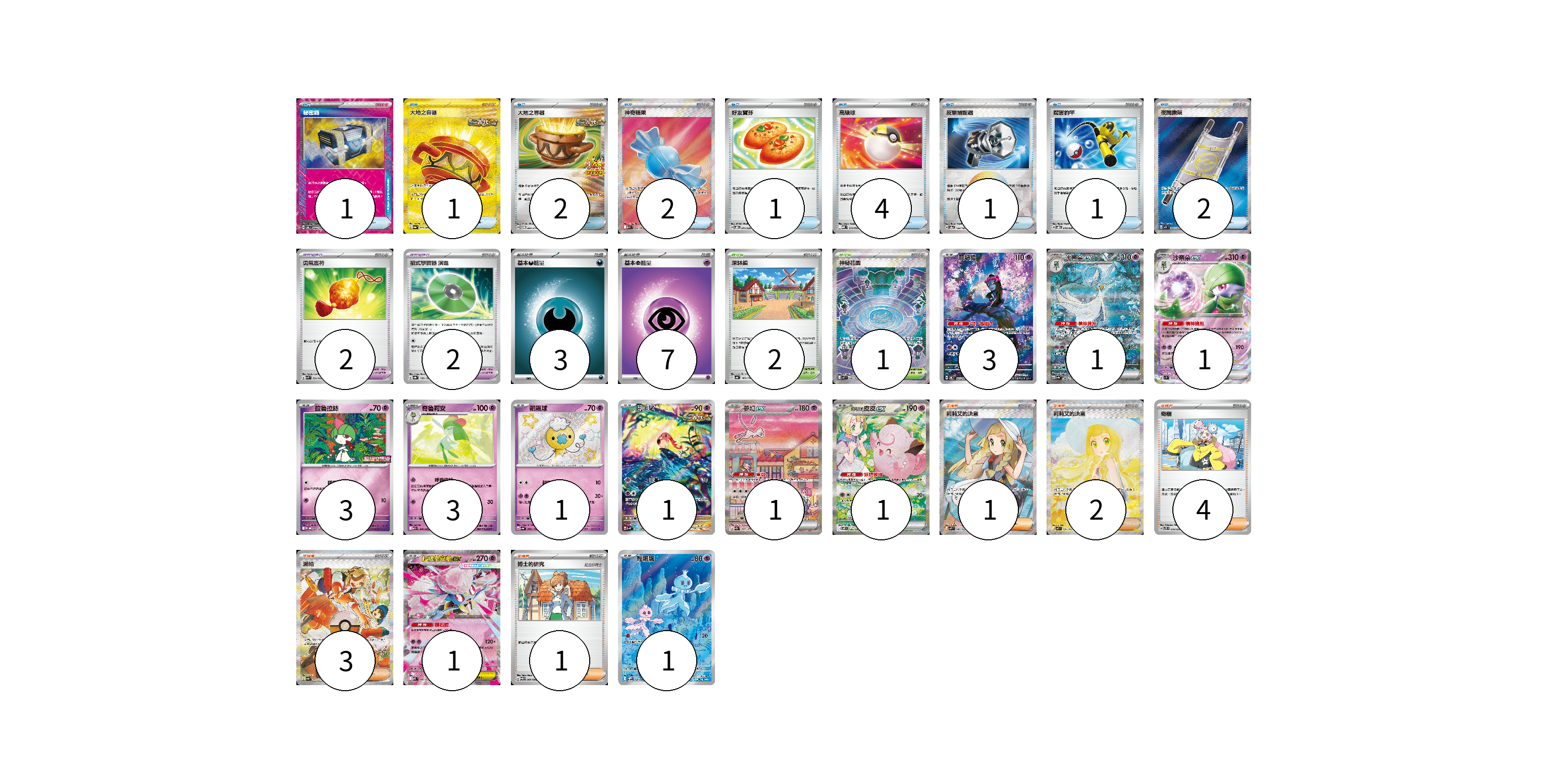 牌組構築方案 以此牌組為基礎新構築牌組 顯示卡面 顯示列表 寶可夢卡(17) 3 1 1 3 3 1 1 1 1 1 1 寶可夢道具(4) 2 2 物品卡(15) 1 1 2 2 1 4 1 1 2 支援者卡(11) 1 2 4 3 1 競技場卡(3) 2 1 能量卡(10) 3 7 寶可夢卡(17) 卡牌名稱 張數 卡牌名稱 張數 願增猿 SV6 107/101 03 沙奈朵ex SV4a 348/190 01 沙奈朵ex SV1S 028/078 01 拉魯拉絲 M-P 005/M-P 03 奇魯莉安 M1S 041/063 03 飄飄球 SV4a 260/190 01 吼叫尾 SV4K 071/066 01 夢幻ex SV2a 205/165 01 莉莉艾的皮皮ex SV9 126/100 01 超級蒂安希ex MBD 006/022 01 輕飄飄 SV11W 124/086 01 寶可夢道具(4) 卡牌名稱 張數 卡牌名稱 張數 勇氣護符 SVK 024/042 02 招式學習器 演進 SV8a 160/187 02 物品卡(15) 卡牌名稱 張數 卡牌名稱 張數 秘密箱 SV6 092/101 01 大地之容器 SV6a 093/064 01 大地之容器 SV-P 084/SV-P 02 神奇糖果 M1S 082/063 02 好友寶芬 SVOD 011/020 01 高級球 MBD 014/022 04 反擊捕捉器 SV8a 139/187 01 厲害釣竿 SVOD 010/020 01 夜間擔架 M1L 083/063 02 支援者卡(11) 卡牌名稱 張數 卡牌名稱 張數 莉莉艾的決意 M1L 086/063 01 莉莉艾的決意 M1L 091/063 02 奇樹 SVTS 018/022 04 派帕 SV4a 353/190 03 博士的研究 SV11B 084/086 01 競技場卡(3) 卡牌名稱 張數 卡牌名稱 張數 深缽鎮 SV4a 185/190 02 神秘花園 M1S 086/063 01 能量卡(10) 卡牌名稱 張數 卡牌名稱 張數 基本【惡】能量 MBG DAR 03 基本【超】能量 MBD PSY 07 以此牌組為基礎新構築牌組 牌組編碼 uOZDIg-cEJGbt-VHDfob copy 列印牌組單 牌組編碼已複製 分享至SNS
