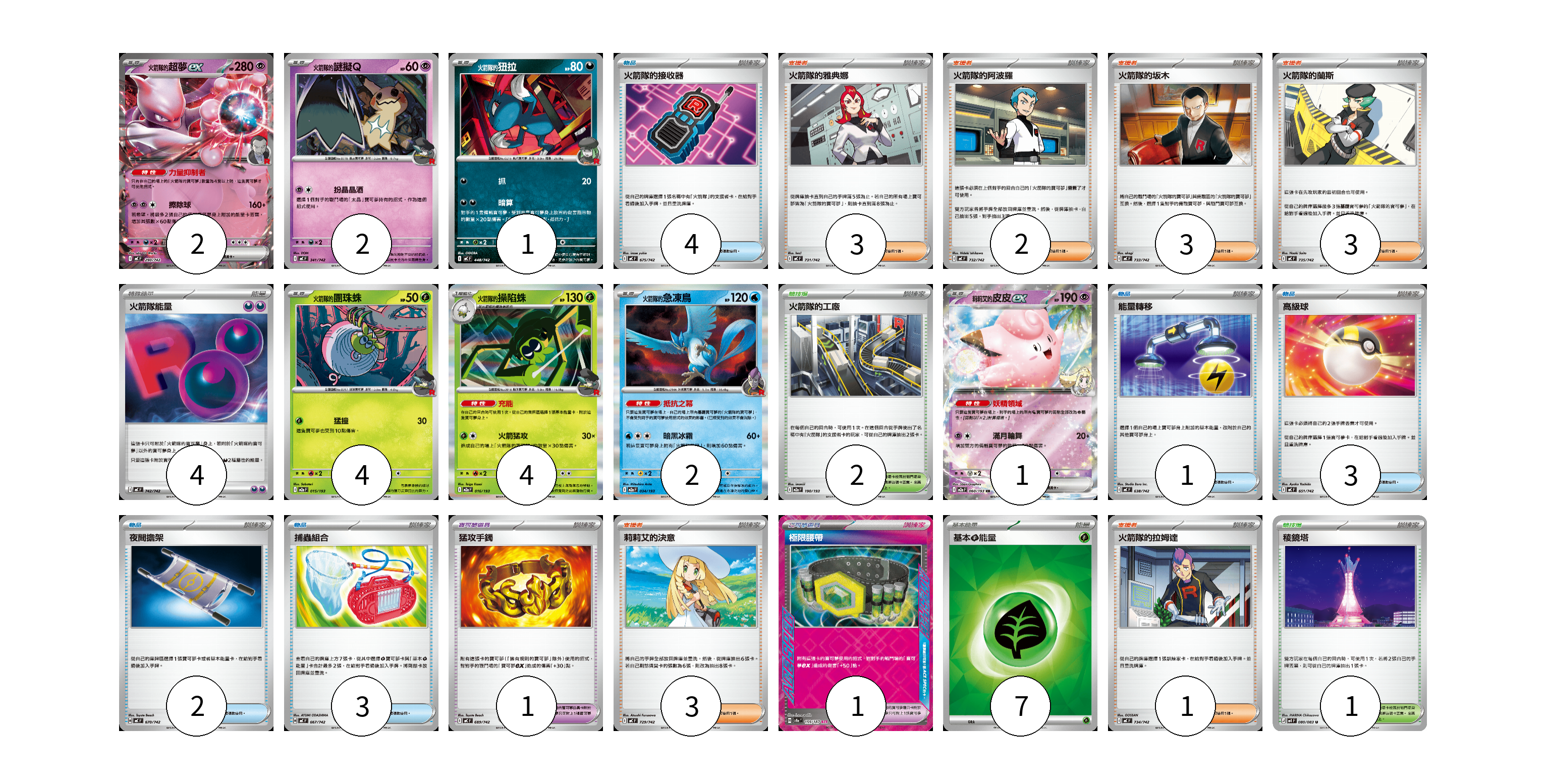 牌組構築方案 以此牌組為基礎新構築牌組 顯示卡面 顯示列表 寶可夢卡(16) 2 2 1 4 4 2 1 寶可夢道具(2) 1 1 物品卡(13) 4 1 3 2 3 支援者卡(15) 3 2 3 3 3 1 競技場卡(3) 2 1 能量卡(11) 4 7 寶可夢卡(16) 卡牌名稱 張數 卡牌名稱 張數 <火箭隊的>超夢ex MC 290/742 02 <火箭隊的>謎擬Q MC 341/742 02 <火箭隊的>狃拉 MC 448/742 01 <火箭隊的>團珠蛛 M2a 015/193 04 <火箭隊的>操陷蛛 M2a 016/193 04 <火箭隊的>急凍鳥 M2a 034/193 02 莉莉艾的皮皮ex M2a 060/193 01 寶可夢道具(2) 卡牌名稱 張數 卡牌名稱 張數 猛攻手鐲 MC 689/742 01 極限腰帶 SV8a 159/187 01 物品卡(13) 卡牌名稱 張數 卡牌名稱 張數 火箭隊的接收器 MC 675/742 04 能量轉移 MC 638/742 01 高級球 MC 651/742 03 夜間擔架 MC 670/742 02 捕蟲組合 MC 667/742 03 支援者卡(15) 卡牌名稱 張數 卡牌名稱 張數 火箭隊的雅典娜 MC 731/742 03 火箭隊的阿波羅 MC 732/742 02 火箭隊的坂木 MC 733/742 03 火箭隊的蘭斯 MC 735/742 03 莉莉艾的決意 MC 729/742 03 火箭隊的拉姆達 MC 734/742 01 競技場卡(3) 卡牌名稱 張數 卡牌名稱 張數 火箭隊的工廠 M2a 190/193 02 稜鏡塔 M4 080/083 01 能量卡(11) 卡牌名稱 張數 卡牌名稱 張數 火箭隊能量 MC 742/742 04 基本【草】能量 SVM GRA 07 以此牌組為基礎新構築牌組 牌組編碼 uObqWa-SpnDGf-ERmRyf copy 列印牌組單 牌組編碼已複製 分享至SNS