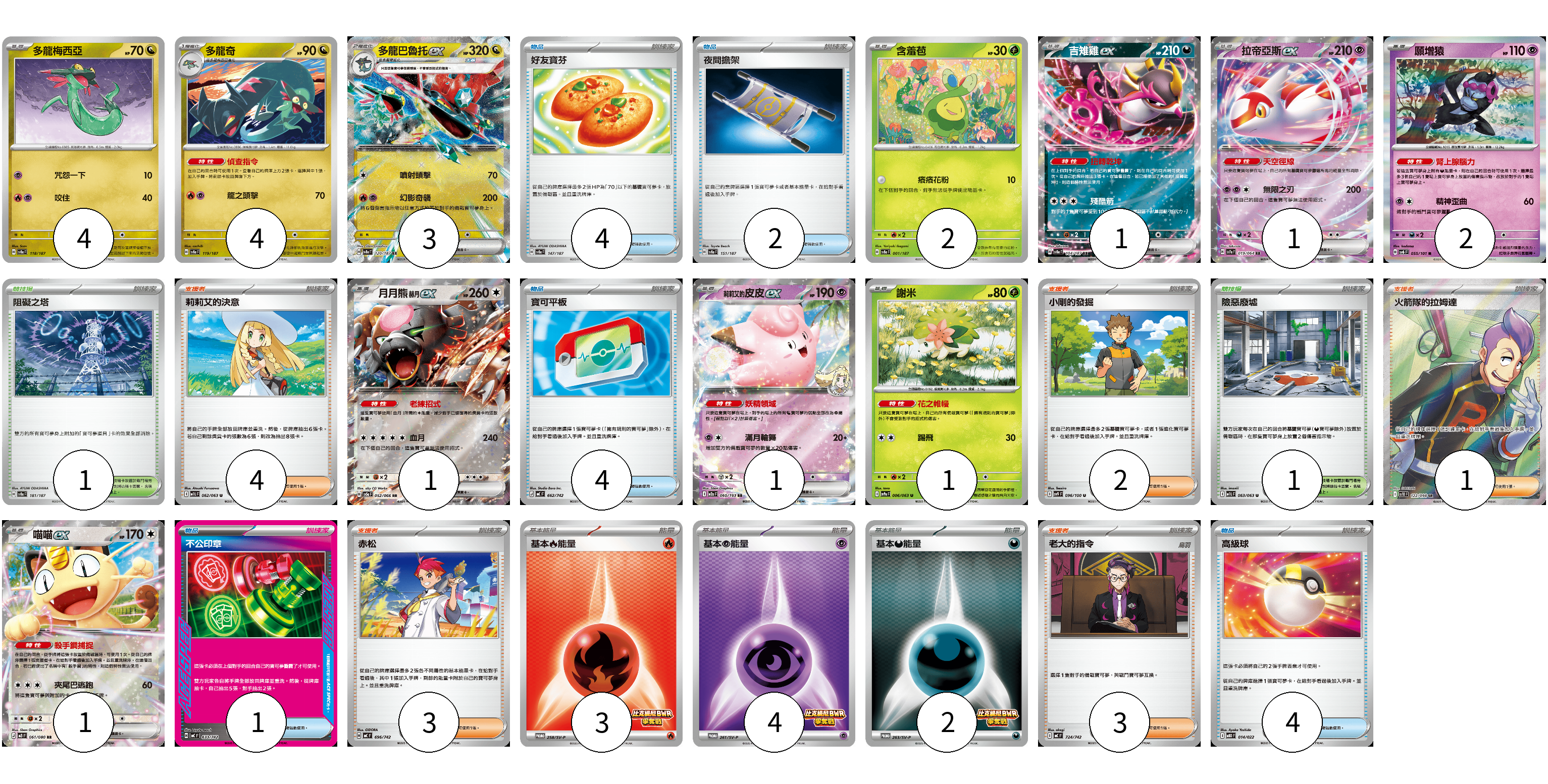 牌組構築方案 以此牌組為基礎新構築牌組 顯示卡面 顯示列表 寶可夢卡(21) 4 4 3 2 1 1 2 1 1 1 1 物品卡(15) 4 2 4 1 4 支援者卡(13) 4 2 1 3 3 競技場卡(2) 1 1 能量卡(9) 3 4 2 寶可夢卡(21) 卡牌名稱 張數 卡牌名稱 張數 多龍梅西亞 SV8a 118/187 04 多龍奇 SV8a 119/187 04 多龍巴魯托ex SV8a 120/187 03 含羞苞 SV8a 001/187 02 吉雉雞ex SV8a 104/187 01 拉帝亞斯ex SV7a 019/064 01 願增猿 SV6 055/101 02 月月熊 赫月 ex SV5a 052/066 01 莉莉艾的皮皮ex M2a 060/193 01 謝米 SV9a 006/063 01 喵喵ex M3 061/080 01 物品卡(15) 卡牌名稱 張數 卡牌名稱 張數 好友寶芬 SV8a 147/187 04 夜間擔架 SV8a 151/187 02 寶可平板 MC 662/742 04 不公印章 MC 633/742 01 高級球 MBD 014/022 04 支援者卡(13) 卡牌名稱 張數 卡牌名稱 張數 莉莉艾的決意 M1L 062/063 04 小剛的發掘 SV9 096/100 02 火箭隊的拉姆達 SV10 122/098 01 赤松 MC 696/742 03 老大的指令 MC 724/742 03 競技場卡(2) 卡牌名稱 張數 卡牌名稱 張數 阻礙之塔 SV8a 181/187 01 險惡廢墟 M1L 063/063 01 能量卡(9) 卡牌名稱 張數 卡牌名稱 張數 基本【火】能量 SV-P 258/SV-P 03 基本【超】能量 SV-P 261/SV-P 04 基本【惡】能量 SV-P 263/SV-P 02 以此牌組為基礎新構築牌組 牌組編碼 uQCPaW-HGUbRd-ziAojM copy 列印牌組單 牌組編碼已複製 分享至SNS