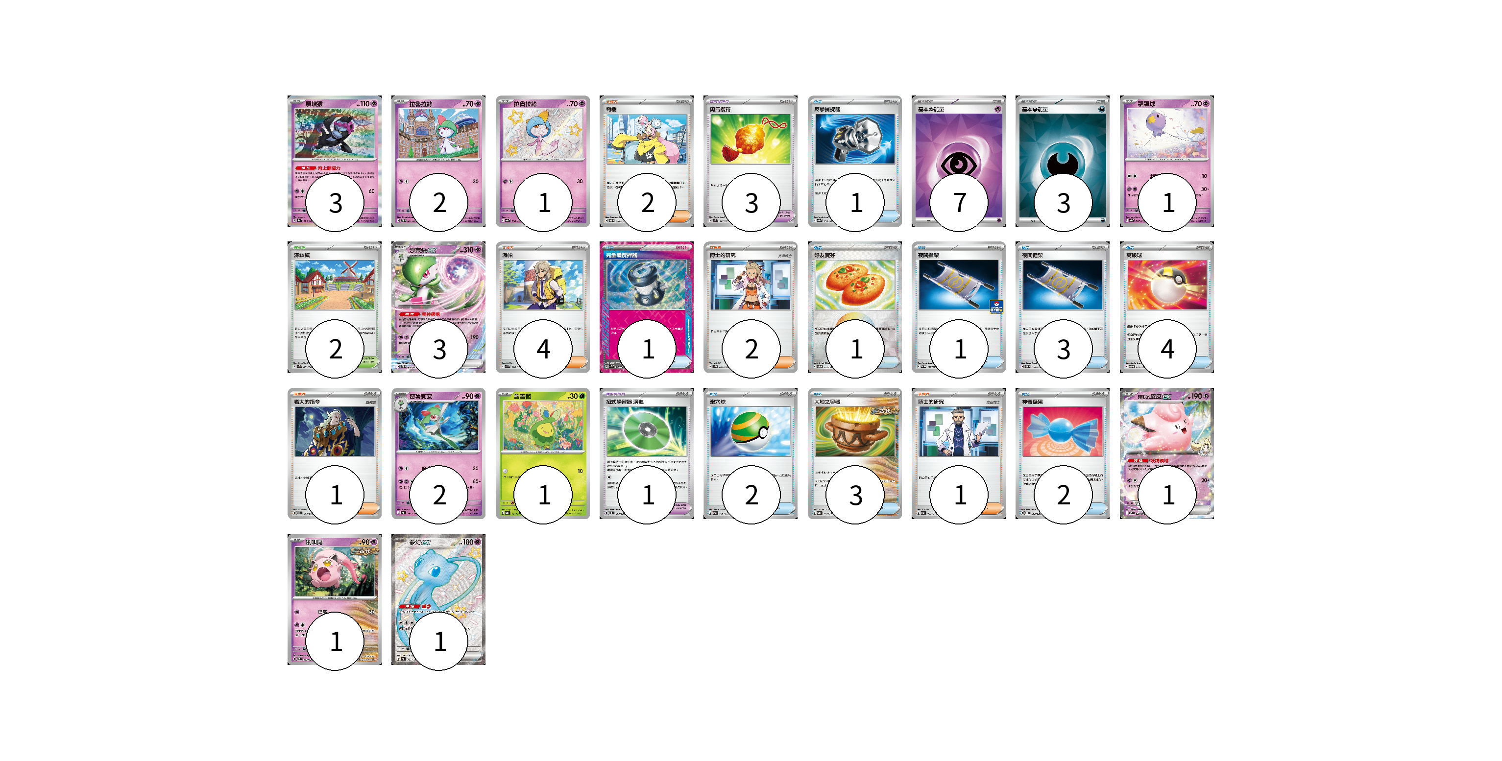 牌組構築方案 以此牌組為基礎新構築牌組 顯示卡面 顯示列表 寶可夢卡(16) 3 2 1 1 3 2 1 1 1 1 寶可夢道具(4) 3 1 物品卡(18) 1 1 1 1 3 4 2 3 2 支援者卡(10) 2 4 2 1 1 競技場卡(2) 2 能量卡(10) 7 3 寶可夢卡(16) 卡牌名稱 張數 卡牌名稱 張數 願增猿 SV8a 075/187 03 拉魯拉絲 SVTS 002/022 02 拉魯拉絲 SV4a 258/190 01 飄飄球 SV4a 083/190 01 沙奈朵ex SVTS 004/022 03 奇魯莉安 SV4a 081/190 02 含羞苞 SV8a 001/187 01 莉莉艾的皮皮ex SV9 033/100 01 吼叫尾 SVTS 007/022 01 夢幻ex SV4a 327/190 01 寶可夢道具(4) 卡牌名稱 張數 卡牌名稱 張數 勇氣護符 SVM 142/175 03 招式學習器 演進 SVTL 017/021 01 物品卡(18) 卡牌名稱 張數 卡牌名稱 張數 反擊捕捉器 SV8a 139/187 01 完全體攪拌器 SVK 017/042 01 好友寶芬 SV8a 147/187 01 夜間擔架 SV-P 227/SV-P 01 夜間擔架 SVOM 016/021 03 高級球 SVOD 012/020 04 巢穴球 SVK 016/042 02 大地之容器 SV8a 143/187 03 神奇糖果 SVOD 013/020 02 支援者卡(10) 卡牌名稱 張數 卡牌名稱 張數 奇樹 SVOD 016/020 02 派帕 SV1V 076/078 04 博士的研究 SVF 030/038 02 老大的指令 SVTH 017/018 01 博士的研究 SVK 033/042 01 競技場卡(2) 卡牌名稱 張數 卡牌名稱 張數 深缽鎮 SVK 039/042 02 能量卡(10) 卡牌名稱 張數 卡牌名稱 張數 基本【超】能量 SVOD PSY 07 基本【惡】能量 SVOM DAR 03 以此牌組為基礎新構築牌組 牌組編碼 uQugVC-qsEvRS-zvMtal copy 列印牌組單 牌組編碼已複製 分享至SNS