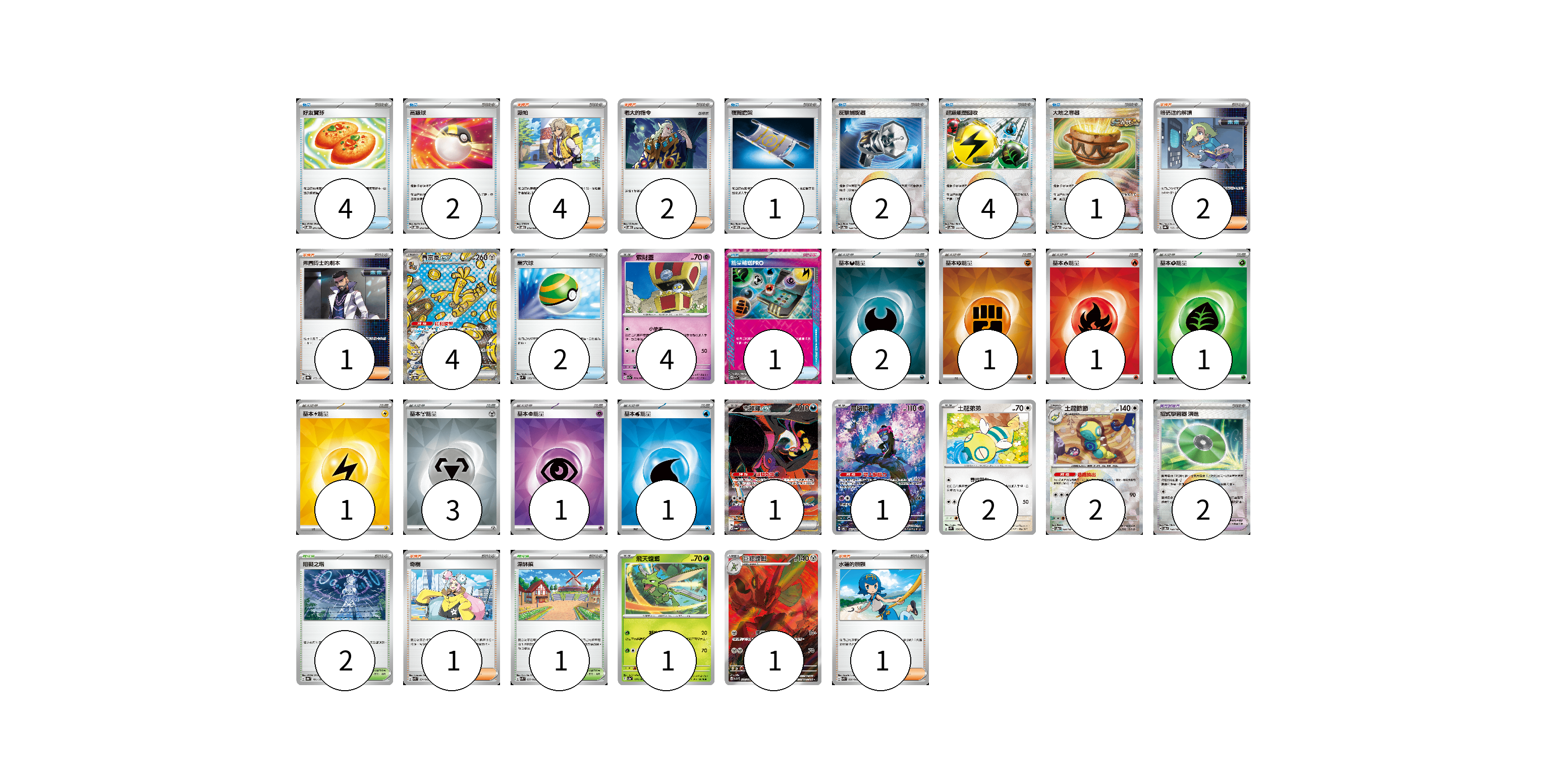 牌組構築方案 以此牌組為基礎新構築牌組 顯示卡面 顯示列表 寶可夢卡(16) 4 4 1 1 2 2 1 1 寶可夢道具(2) 2 物品卡(17) 4 2 1 2 4 1 2 1 支援者卡(11) 4 2 2 1 1 1 競技場卡(3) 2 1 能量卡(11) 2 1 1 1 1 3 1 1 寶可夢卡(16) 卡牌名稱 張數 卡牌名稱 張數 賽富豪ex SV8a 220/187 04 索財靈 SV7a 024/064 04 吉雉雞ex SV6a 089/064 01 願增猿 SV6 107/101 01 土龍弟弟 SV2P 056/071 02 土龍節節 SV8a 130/187 02 飛天螳螂 SV2a 123/165 01 巨鉗螳螂 SV3 116/108 01 寶可夢道具(2) 卡牌名稱 張數 卡牌名稱 張數 招式學習器 演進 SV8a 160/187 02 物品卡(17) 卡牌名稱 張數 卡牌名稱 張數 好友寶芬 SVOD 011/020 04 高級球 SVOD 012/020 02 夜間擔架 SVOM 016/021 01 反擊捕捉器 SV8a 139/187 02 超級能量回收 SV8a 141/187 04 大地之容器 SV8a 143/187 01 巢穴球 SVM 133/175 02 能量輸送PRO SV7a 052/064 01 支援者卡(11) 卡牌名稱 張數 卡牌名稱 張數 派帕 SVOD 018/020 04 老大的指令 SVOD 019/020 02 暗碼迷的解讀 SV8a 165/187 02 弗圖博士的劇本 SV8a 175/187 01 奇樹 SVK 031/042 01 水蓮的照顧 SVK 028/042 01 競技場卡(3) 卡牌名稱 張數 卡牌名稱 張數 阻礙之塔 SV8a 181/187 02 深缽鎮 SVK 039/042 01 能量卡(11) 卡牌名稱 張數 卡牌名稱 張數 基本【惡】能量 SVK DAR 02 基本【鬥】能量 SVK FIG 01 基本【火】能量 SVK FIR 01 基本【草】能量 SVK GRA 01 基本【雷】能量 SVK LIG 01 基本【鋼】能量 SVK MET 03 基本【超】能量 SVK PSY 01 基本【水】能量 SVK WAT 01 以此牌組為基礎新構築牌組 牌組編碼 uRKkCW-fYVAmw-GOcJvX copy 列印牌組單 牌組編碼已複製 分享至SNS
