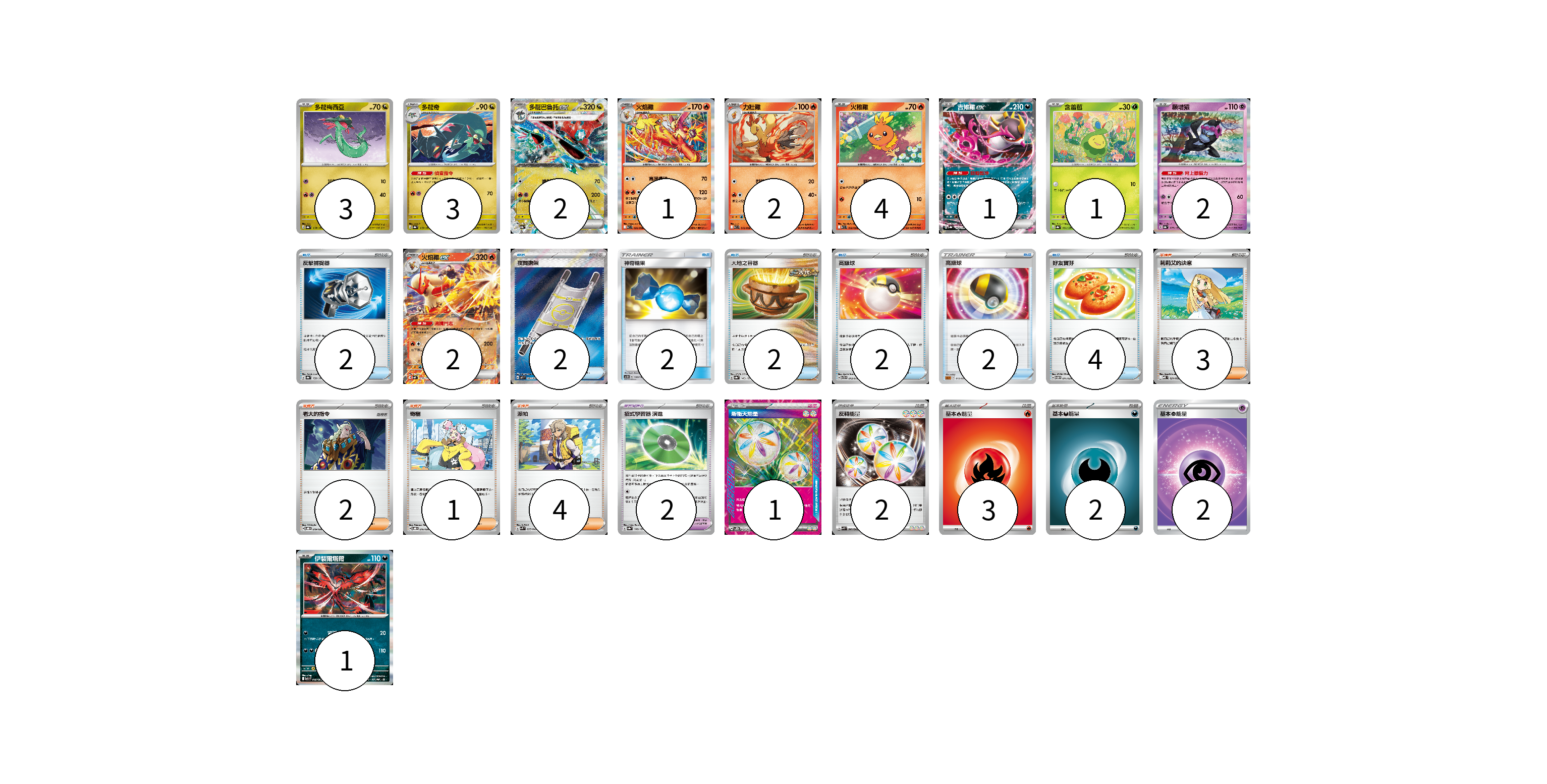牌組構築方案 以此牌組為基礎新構築牌組 顯示卡面 顯示列表 寶可夢卡(22) 3 3 2 1 2 4 1 1 2 2 1 寶可夢道具(2) 2 物品卡(16) 2 2 2 2 2 2 4 支援者卡(10) 3 2 1 4 能量卡(10) 1 2 3 2 2 寶可夢卡(22) 卡牌名稱 張數 卡牌名稱 張數 多龍梅西亞 SV8a 118/187 03 多龍奇 SV8a 119/187 03 多龍巴魯托ex SV8a 120/187 02 火焰雞 SV10 020/098 01 力壯雞 SV10 019/098 02 火稚雞 SV10 018/098 04 吉雉雞ex SV8a 104/187 01 含羞苞 SV8a 001/187 01 願增猿 SV8a 075/187 02 火焰雞ex SVM 016/175 02 伊裴爾塔爾 M1L 040/063 01 寶可夢道具(2) 卡牌名稱 張數 卡牌名稱 張數 招式學習器 演進 SV8a 160/187 02 物品卡(16) 卡牌名稱 張數 卡牌名稱 張數 反擊捕捉器 SV8a 139/187 02 夜間擔架 M1L 083/063 02 神奇糖果 AC1D 140/157 02 大地之容器 SV8a 143/187 02 高級球 SVTG 013/019 02 高級球 SLL 013/021 02 好友寶芬 SVTM 011/022 04 支援者卡(10) 卡牌名稱 張數 卡牌名稱 張數 莉莉艾的決意 MBD 021/022 03 老大的指令 SVOD 019/020 02 奇樹 SVOD 016/020 01 派帕 SVK 035/042 04 能量卡(10) 卡牌名稱 張數 卡牌名稱 張數 新衝天能量 SV5K 071/071 01 反轉能量 SVK 041/042 02 基本【火】能量 SVTL FIR 03 基本【惡】能量 SVF DAR 02 基本【超】能量 SI PSY 02 以此牌組為基礎新構築牌組 牌組編碼 uSwZxj-GDelQK-EtpdVE copy 列印牌組單 牌組編碼已複製 分享至SNS