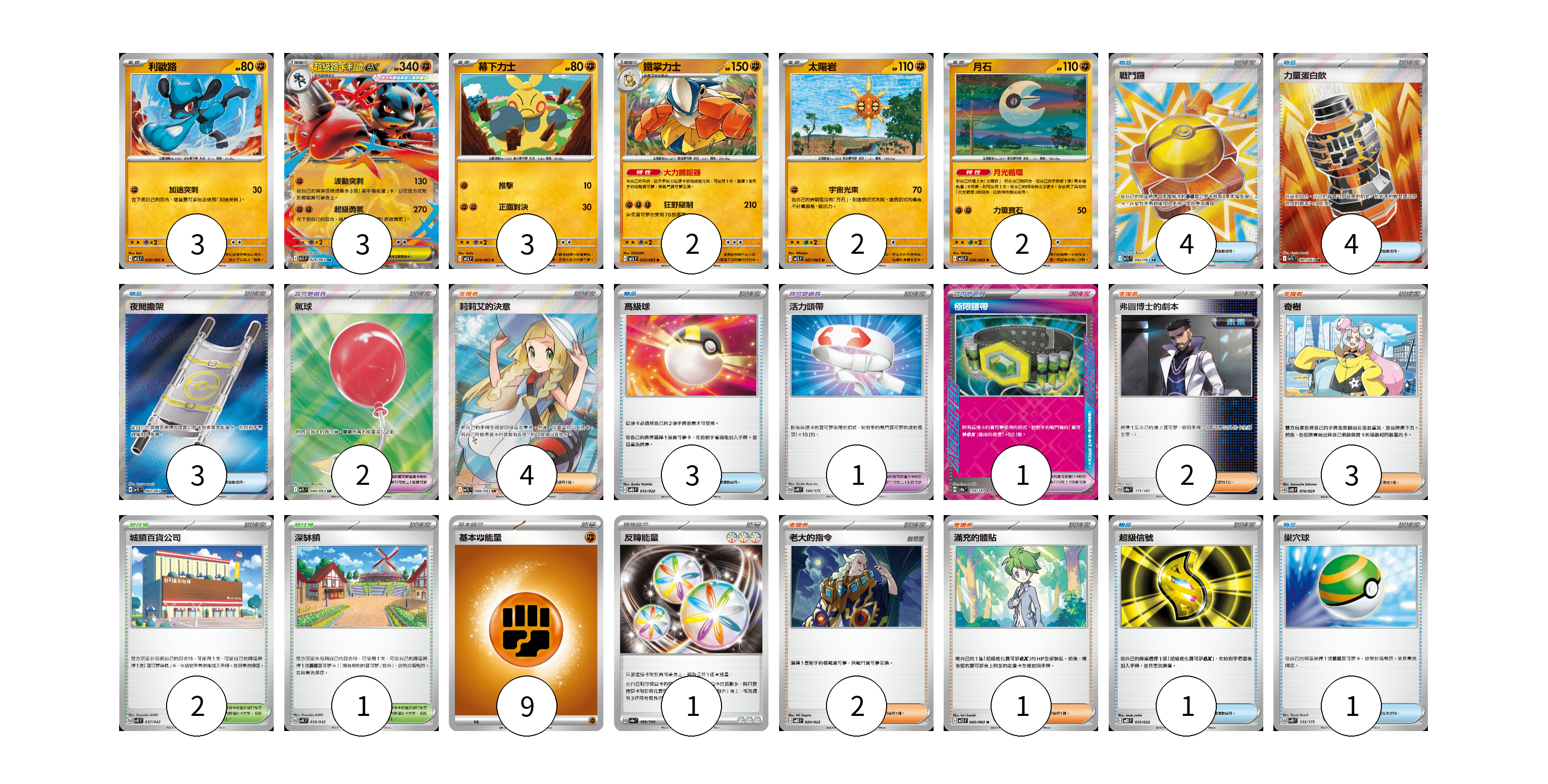 牌組構築方案 以此牌組為基礎新構築牌組 顯示卡面 顯示列表 寶可夢卡(15) 3 3 3 2 2 2 寶可夢道具(4) 2 1 1 物品卡(16) 4 4 3 3 1 1 支援者卡(12) 4 2 3 2 1 競技場卡(3) 2 1 能量卡(10) 9 1 寶可夢卡(15) 卡牌名稱 張數 卡牌名稱 張數 利歐路 M1L 028/063 03 超級路卡利歐ex M1L 029/063 03 幕下力士 M1L 024/063 03 鐵掌力士 M1L 025/063 02 太陽岩 M1L 027/063 02 月石 M1L 026/063 02 寶可夢道具(4) 卡牌名稱 張數 卡牌名稱 張數 氣球 M1L 084/063 02 活力頭帶 SVM 140/175 01 極限腰帶 SV8a 159/187 01 物品卡(16) 卡牌名稱 張數 卡牌名稱 張數 戰鬥鑼 M1L 082/063 04 力量蛋白飲 M1L 081/063 04 夜間擔架 M1L 083/063 03 高級球 MBG 012/022 03 超級信號 MBD 015/022 01 巢穴球 SVM 133/175 01 支援者卡(12) 卡牌名稱 張數 卡牌名稱 張數 莉莉艾的決意 M1L 086/063 04 弗圖博士的劇本 SV8a 175/187 02 奇樹 SVOD 016/020 03 老大的指令 MBD 020/022 02 滿充的體貼 M1S 060/063 01 競技場卡(3) 卡牌名稱 張數 卡牌名稱 張數 城鎮百貨公司 SVK 037/042 02 深缽鎮 SVK 039/042 01 能量卡(10) 卡牌名稱 張數 卡牌名稱 張數 基本【鬥】能量 M-P FIG 09 反轉能量 SV4a 189/190 01 以此牌組為基礎新構築牌組 牌組編碼 uWsRxN-ijETtw-dyZOEV copy 列印牌組單 牌組編碼已複製 分享至SNS
