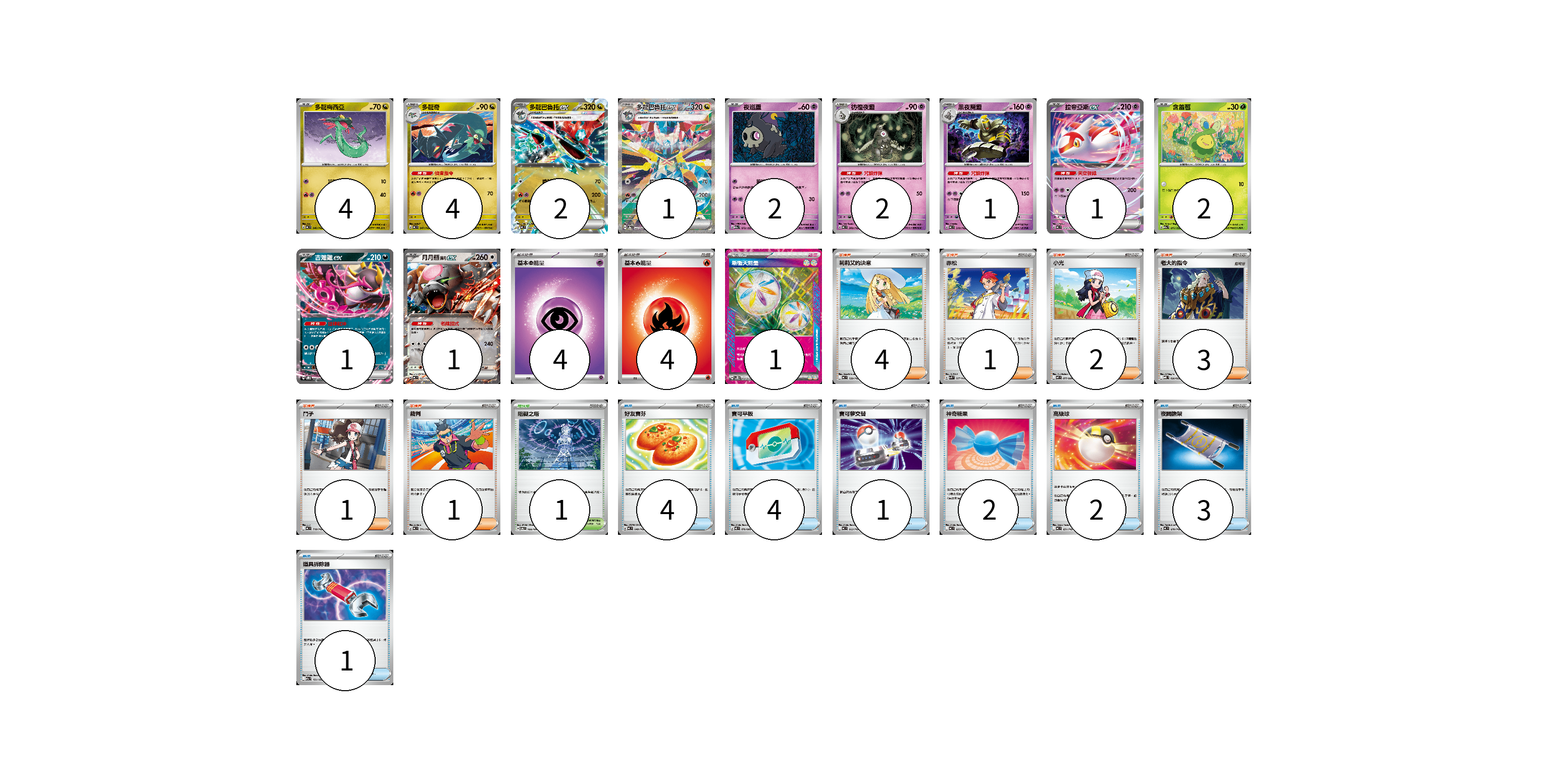 牌組構築方案 以此牌組為基礎新構築牌組 顯示卡面 顯示列表 寶可夢卡(21) 4 4 2 1 2 2 1 1 2 1 1 物品卡(17) 4 4 1 2 2 3 1 支援者卡(12) 4 1 2 3 1 1 競技場卡(1) 1 能量卡(9) 4 4 1 寶可夢卡(21) 卡牌名稱 張數 卡牌名稱 張數 多龍梅西亞 MC 546/742 04 多龍奇 MC 547/742 04 多龍巴魯托ex MC 548/742 02 多龍巴魯托ex SV8a 221/187 01 夜巡靈 M2a 072/193 02 彷徨夜靈 MC 309/742 02 黑夜魔靈 MC 310/742 01 拉帝亞斯ex MC 312/742 01 含羞苞 M2a 011/193 02 吉雉雞ex SVOD 004/020 01 月月熊 赫月 ex MC 625/742 01 物品卡(17) 卡牌名稱 張數 卡牌名稱 張數 好友寶芬 MC 648/742 04 寶可平板 M3 070/080 04 寶可夢交替 MC 663/742 01 神奇糖果 MC 655/742 02 高級球 MC 651/742 02 夜間擔架 MC 670/742 03 道具拆除器 M2a 151/193 01 支援者卡(12) 卡牌名稱 張數 卡牌名稱 張數 莉莉艾的決意 MC 729/742 04 赤松 SVK 027/042 01 小光 M2 077/080 02 老大的指令 MBD 020/022 03 鬥子 MC 718/742 01 裁判 MC 711/742 01 競技場卡(1) 卡牌名稱 張數 卡牌名稱 張數 阻礙之塔 SV6 100/101 01 能量卡(9) 卡牌名稱 張數 卡牌名稱 張數 基本【超】能量 MC PSY 04 基本【火】能量 MC FIR 04 新衝天能量 SV5K 071/071 01 以此牌組為基礎新構築牌組 牌組編碼 uYLtNI-ITLPSa-KYqiby copy 列印牌組單 牌組編碼已複製 分享至SNS