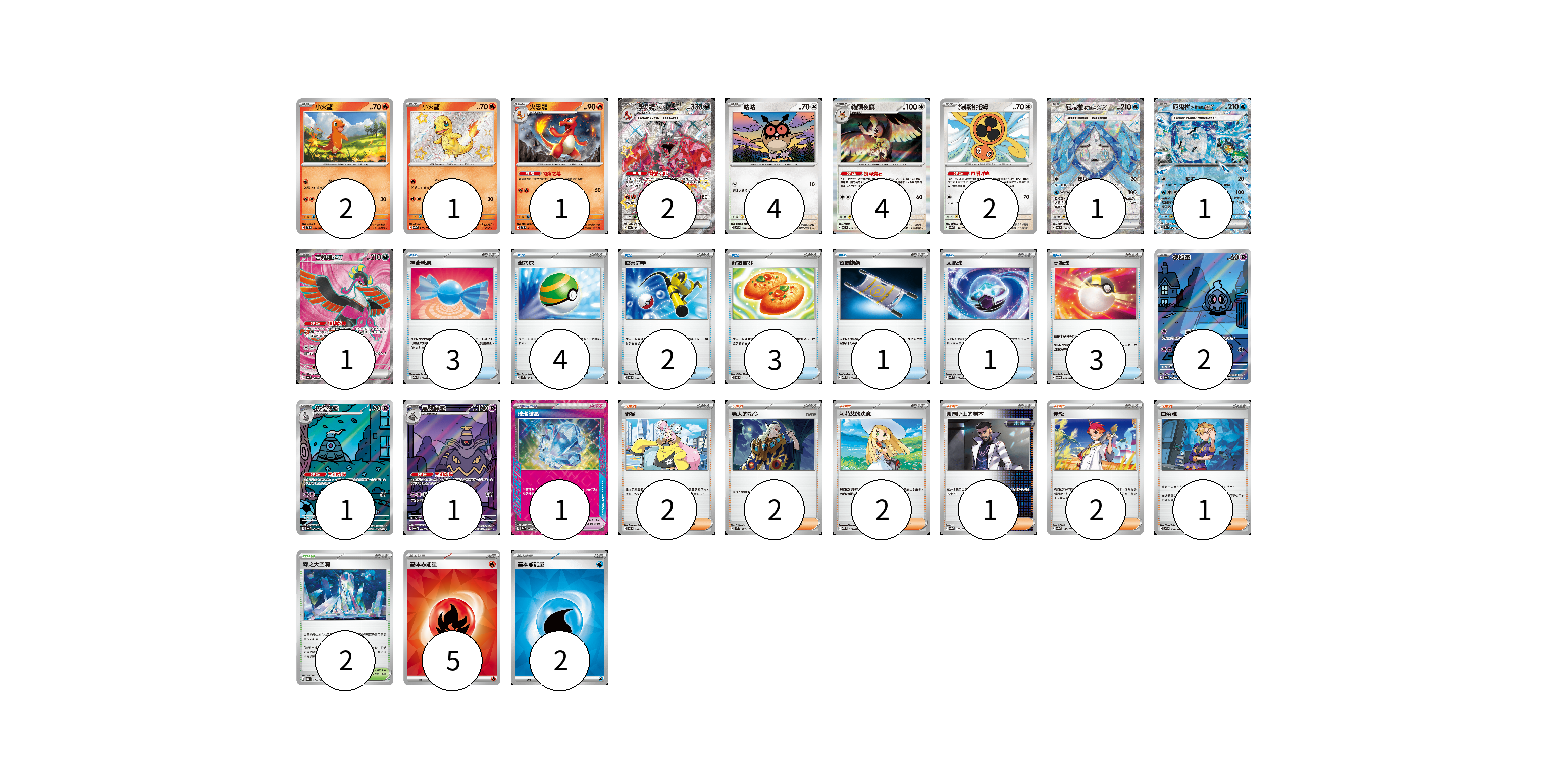 牌組構築方案 以此牌組為基礎新構築牌組 顯示卡面 顯示列表 寶可夢卡(23) 2 1 1 2 4 4 2 1 1 1 2 1 1 寶可夢道具(1) 1 物品卡(17) 3 4 2 3 1 1 3 支援者卡(10) 2 2 2 1 2 1 競技場卡(2) 2 能量卡(7) 5 2 寶可夢卡(23) 卡牌名稱 張數 卡牌名稱 張數 小火龍 SVTL 001/021 02 小火龍 SV4a 210/190 01 火恐龍 SVTL 002/021 01 噴火龍ex SV4a 331/190 02 咕咕 SV7 076/102 04 貓頭夜鷹 SV7 077/102 04 旋轉洛托姆 SV8a 131/187 02 厄鬼椪 水井面具ex SV6 117/101 01 厄鬼椪 水井面具ex SV8a 050/187 01 吉雉雞ex SV6a 081/064 01 夜巡靈 SV6a 068/064 02 彷徨夜靈 SV6a 069/064 01 黑夜魔靈 SV6a 070/064 01 寶可夢道具(1) 卡牌名稱 張數 卡牌名稱 張數 璀璨結晶 SV8a 152/187 01 物品卡(17) 卡牌名稱 張數 卡牌名稱 張數 神奇糖果 MBG 013/022 03 巢穴球 SVM 133/175 04 厲害釣竿 SVOD 010/020 02 好友寶芬 SVOD 011/020 03 夜間擔架 MBD 016/022 01 太晶珠 SVK 013/042 01 高級球 SVOD 012/020 03 支援者卡(10) 卡牌名稱 張數 卡牌名稱 張數 奇樹 SVOD 016/020 02 老大的指令 SVM 172/175 02 莉莉艾的決意 MBD 021/022 02 弗圖博士的劇本 SV8a 175/187 01 赤松 SV8a 163/187 02 白蕾雅 SV7 100/102 01 競技場卡(2) 卡牌名稱 張數 卡牌名稱 張數 零之大空洞 SV8a 182/187 02 能量卡(7) 卡牌名稱 張數 卡牌名稱 張數 基本【火】能量 SVQL FIR 05 基本【水】能量 SVM WAT 02 以此牌組為基礎新構築牌組 牌組編碼 uYveFL-hSubPu-QioKWX copy 列印牌組單 牌組編碼已複製 分享至SNS