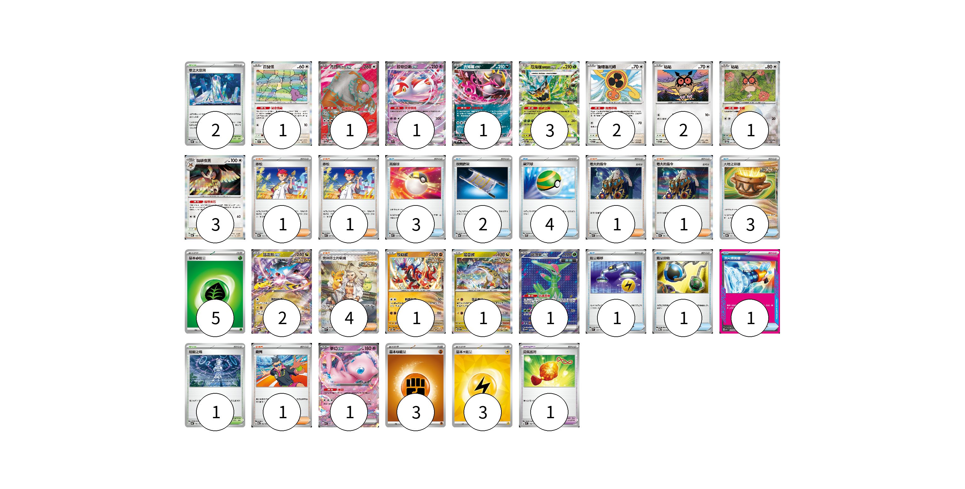 牌組構築方案 以此牌組為基礎新構築牌組 顯示卡面 顯示列表 寶可夢卡(21) 1 1 1 1 3 2 2 1 3 2 1 1 1 1 寶可夢道具(1) 1 物品卡(15) 3 2 4 3 1 1 1 支援者卡(9) 1 1 1 1 4 1 競技場卡(3) 2 1 能量卡(11) 5 3 3 寶可夢卡(21) 卡牌名稱 張數 卡牌名稱 張數 百變怪 SV4a 144/190 01 月月熊 赫月 ex SV5a 084/066 01 拉帝亞斯ex SV7a 019/064 01 吉雉雞ex SV8a 104/187 01 厄鬼椪 碧草面具ex SV6 016/101 03 旋轉洛托姆 SV7 080/102 02 咕咕 SV7 076/102 02 咕咕 SV8a 127/187 01 貓頭夜鷹 SV8a 128/187 03 猛雷鼓ex SV8a 124/187 02 故勒頓 SV8 069/106 01 猛雷鼓 SV7 075/102 01 鐵斑葉ex SV5M 084/071 01 夢幻ex SVK 001/042 01 寶可夢道具(1) 卡牌名稱 張數 卡牌名稱 張數 勇氣護符 SVM 142/175 01 物品卡(15) 卡牌名稱 張數 卡牌名稱 張數 高級球 SVK 018/042 03 夜間擔架 SV6a 056/064 02 巢穴球 SVAW 014/023 04 大地之容器 SV8a 143/187 03 能量轉移 SVM 127/175 01 能量回收 SVQL 012/022 01 頂尖捕捉器 MBG 014/022 01 支援者卡(9) 卡牌名稱 張數 卡牌名稱 張數 赤松 SV8a 163/187 01 赤松 SVK 027/042 01 老大的指令 SVK 036/042 01 老大的指令 SV4a 181/190 01 奧琳博士的氣魄 SV4K 091/066 04 裁判 SV9a 062/063 01 競技場卡(3) 卡牌名稱 張數 卡牌名稱 張數 零之大空洞 SV8a 182/187 02 阻礙之塔 SV8a 181/187 01 能量卡(11) 卡牌名稱 張數 卡牌名稱 張數 基本草能量 sv-p GRA 05 基本【鬥】能量 M-P FIG 03 基本【雷】能量 SVQP LIG 03 以此牌組為基礎新構築牌組 牌組編碼 uZWjSP-OLfbvq-VsKwfW copy 列印牌組單 牌組編碼已複製 分享至SNS