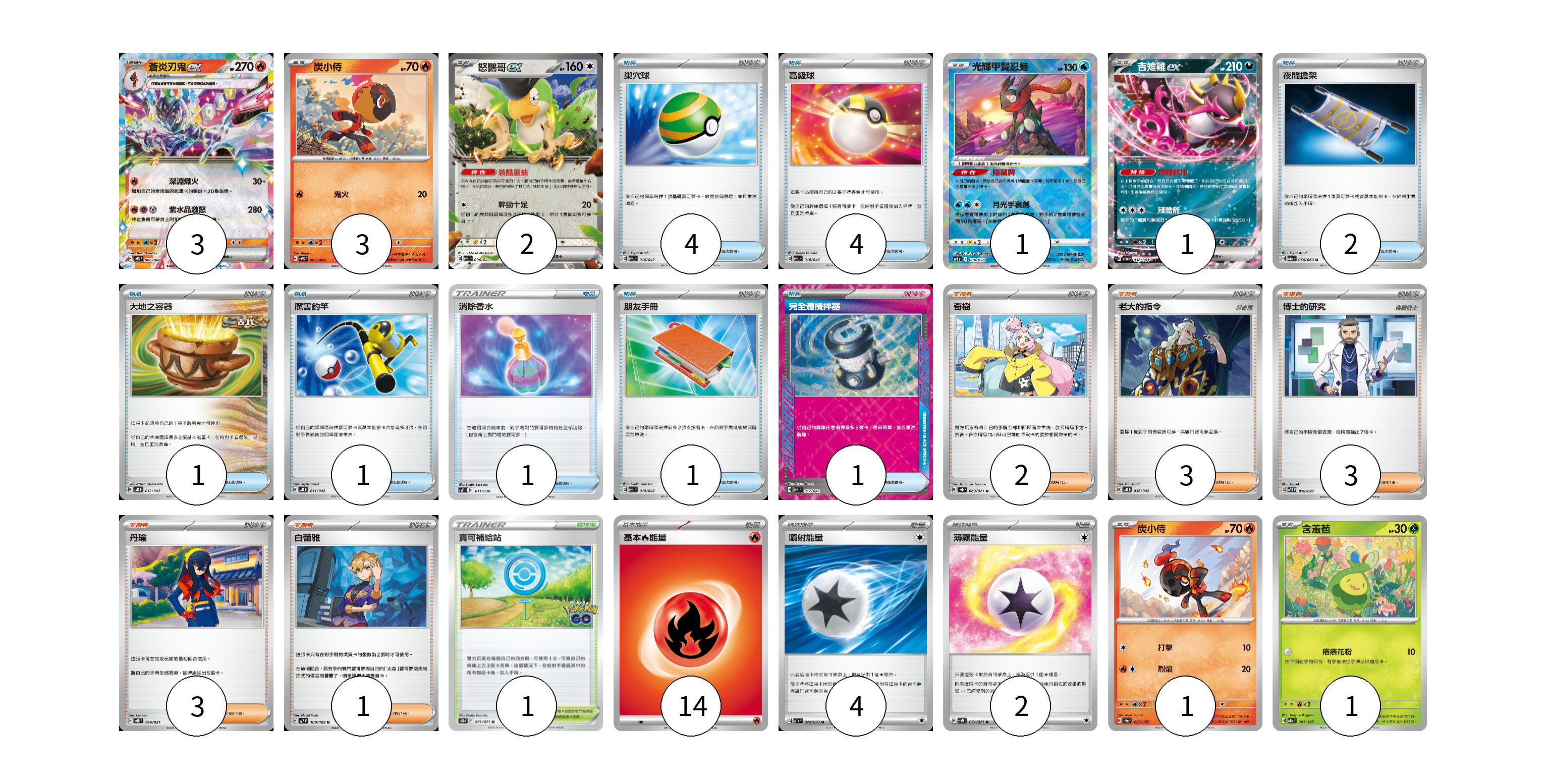 牌組構築方案 以此牌組為基礎新構築牌組 顯示卡面 顯示列表 寶可夢卡(12) 3 3 2 1 1 1 1 物品卡(15) 4 4 2 1 1 1 1 1 支援者卡(12) 2 3 3 3 1 競技場卡(1) 1 能量卡(20) 14 4 2 寶可夢卡(12) 卡牌名稱 張數 卡牌名稱 張數 蒼炎刃鬼ex SVPS 006/008 03 炭小侍 SVPS 005/008 03 怒鸚哥ex SVK 006/042 02 光輝甲賀忍蛙 SVF 004/038 01 吉雉雞ex SV6a 038/064 01 炭小侍 SV8a 023/187 01 含羞苞 SV8a 001/187 01 物品卡(15) 卡牌名稱 張數 卡牌名稱 張數 巢穴球 SVK 016/042 04 高級球 SVK 018/042 04 夜間擔架 SV6a 056/064 02 大地之容器 SVK 012/042 01 厲害釣竿 SVK 011/042 01 消除香水 SVF 011/038 01 朋友手冊 SVK 014/042 01 完全體攪拌器 SVK 017/042 01 支援者卡(12) 卡牌名稱 張數 卡牌名稱 張數 奇樹 SV2D 069/071 02 老大的指令 SVK 036/042 03 博士的研究 SVTR 018/021 03 丹瑜 SVTR 016/021 03 白蕾雅 SV7 100/102 01 競技場卡(1) 卡牌名稱 張數 卡牌名稱 張數 寶可補給站 S10b 071/071 01 能量卡(20) 卡牌名稱 張數 卡牌名稱 張數 基本【火】能量 SVF FIR 14 噴射能量 SV1a 072/073 04 薄霧能量 SV5M 071/071 02 以此牌組為基礎新構築牌組 牌組編碼 uaGYbJ-osOGkL-GbPKkR copy 列印牌組單 牌組編碼已複製 分享至SNS
