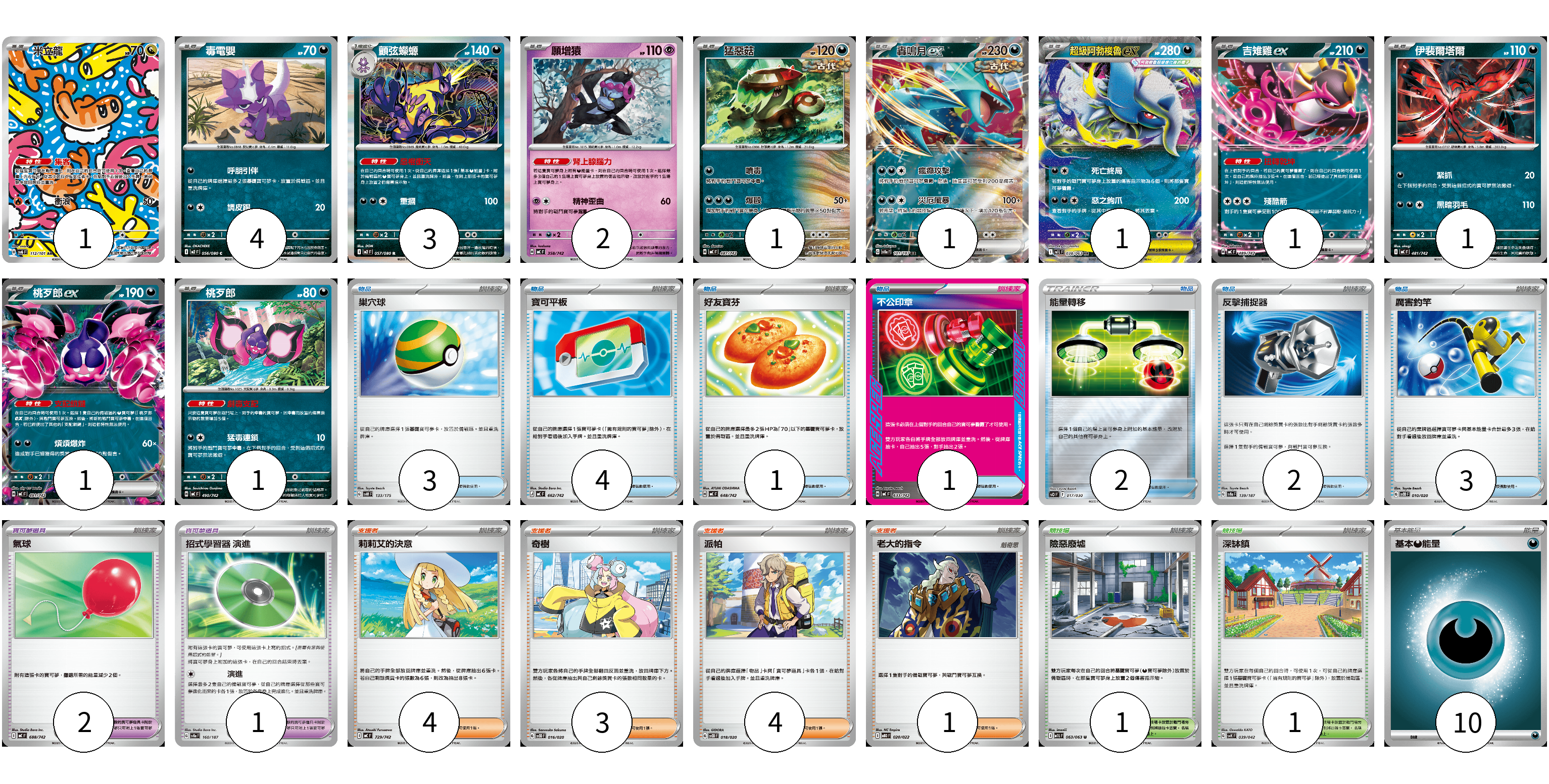 牌組構築方案 以此牌組為基礎新構築牌組 顯示卡面 顯示列表 寶可夢卡(17) 1 4 3 2 1 1 1 1 1 1 1 寶可夢道具(3) 2 1 物品卡(16) 3 4 1 1 2 2 3 支援者卡(12) 4 3 4 1 競技場卡(2) 1 1 能量卡(10) 10 寶可夢卡(17) 卡牌名稱 張數 卡牌名稱 張數 米立龍 SV6 112/101 01 毒電嬰 M2 056/080 04 顫弦蠑螈 M2 057/080 03 願增猿 MC 358/742 02 猛惡菇 MC 487/742 01 轟鳴月ex SV8a 101/187 01 超級阿勃梭魯ex M1L 038/063 01 吉雉雞ex MC 489/742 01 伊裴爾塔爾 MC 481/742 01 桃歹郎ex MC 491/742 01 桃歹郎 MC 490/742 01 寶可夢道具(3) 卡牌名稱 張數 卡牌名稱 張數 氣球 MC 688/742 02 招式學習器 演進 SV8a 160/187 01 物品卡(16) 卡牌名稱 張數 卡牌名稱 張數 巢穴球 SVM 133/175 03 寶可平板 MC 662/742 04 好友寶芬 MC 648/742 01 不公印章 MC 633/742 01 能量轉移 SO 017/030 02 反擊捕捉器 SV8a 139/187 02 厲害釣竿 SVOD 010/020 03 支援者卡(12) 卡牌名稱 張數 卡牌名稱 張數 莉莉艾的決意 MC 729/742 04 奇樹 SVOD 016/020 03 派帕 SVOD 018/020 04 老大的指令 MBD 020/022 01 競技場卡(2) 卡牌名稱 張數 卡牌名稱 張數 險惡廢墟 M1L 063/063 01 深缽鎮 SVK 039/042 01 能量卡(10) 卡牌名稱 張數 卡牌名稱 張數 基本【惡】能量 MC DAR 10 以此牌組為基礎新構築牌組 牌組編碼 ubfcoJ-zyMqHK-hWeetw copy 列印牌組單 牌組編碼已複製 分享至SNS