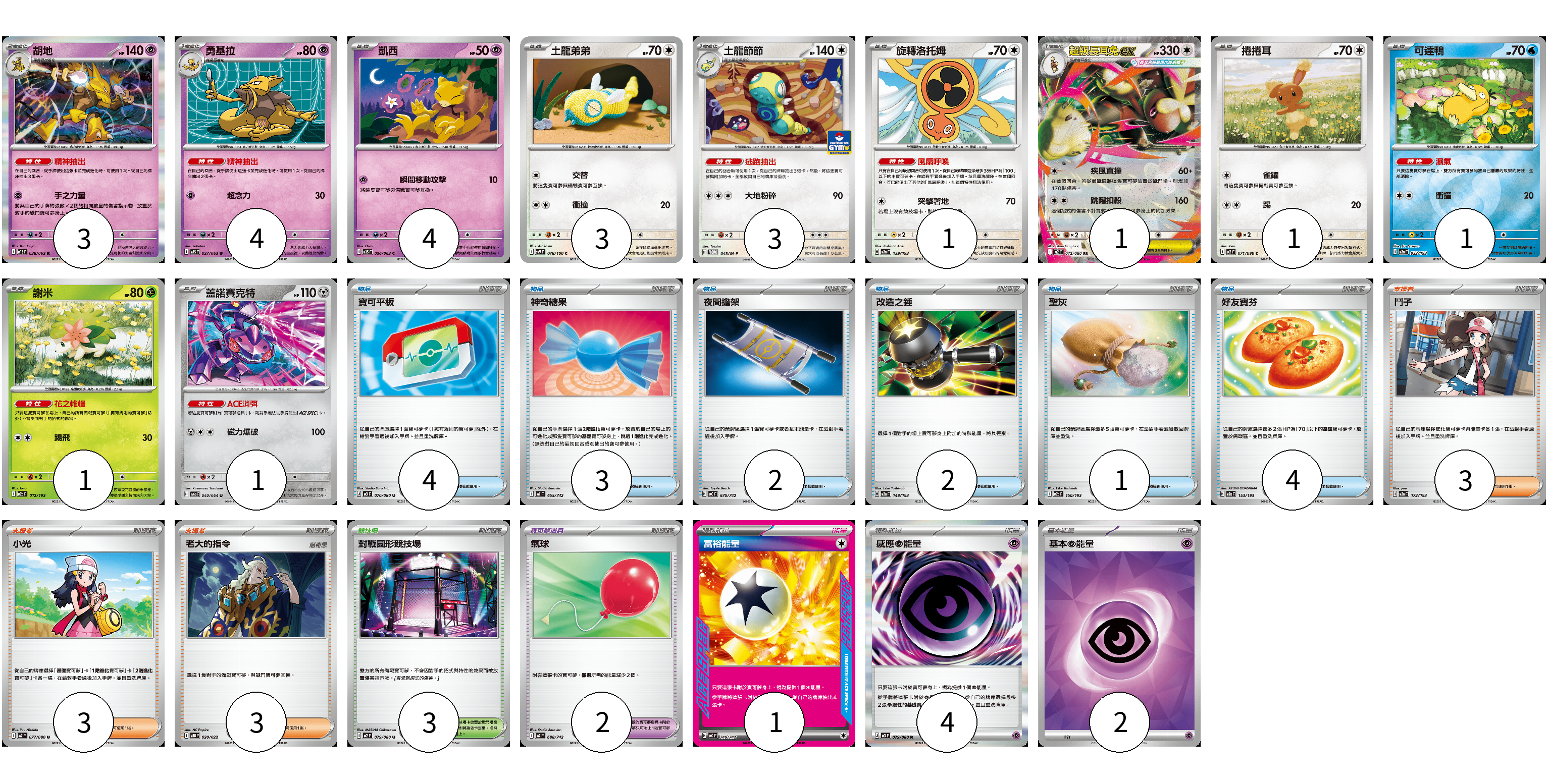 牌組構築方案 以此牌組為基礎新構築牌組 顯示卡面 顯示列表 寶可夢卡(23) 3 4 4 3 3 1 1 1 1 1 1 寶可夢道具(2) 2 物品卡(16) 4 3 2 2 1 4 支援者卡(9) 3 3 3 競技場卡(3) 3 能量卡(7) 1 4 2 寶可夢卡(23) 卡牌名稱 張數 卡牌名稱 張數 胡地 M1S 038/063 03 勇基拉 M1S 037/063 04 凱西 M1S 036/063 04 土龍弟弟 SV9 078/100 03 土龍節節 M-P 045/M-P 03 旋轉洛托姆 M2a 139/193 01 超級長耳兔ex M2 072/080 01 捲捲耳 M2 071/080 01 可達鴨 M2a 032/193 01 謝米 M2a 012/193 01 蓋諾賽克特 SV6a 040/064 01 寶可夢道具(2) 卡牌名稱 張數 卡牌名稱 張數 氣球 MC 688/742 02 物品卡(16) 卡牌名稱 張數 卡牌名稱 張數 寶可平板 M3 070/080 04 神奇糖果 MC 655/742 03 夜間擔架 MC 670/742 02 改造之錘 M2a 148/193 02 聖灰 M2a 150/193 01 好友寶芬 M2a 153/193 04 支援者卡(9) 卡牌名稱 張數 卡牌名稱 張數 鬥子 M2a 172/193 03 小光 M2 077/080 03 老大的指令 MBD 020/022 03 競技場卡(3) 卡牌名稱 張數 卡牌名稱 張數 對戰圓形競技場 M2 079/080 03 能量卡(7) 卡牌名稱 張數 卡牌名稱 張數 富裕能量 MC 740/742 01 感應【超】能量 M3 079/080 04 基本【超】能量 SVOD PSY 02 以此牌組為基礎新構築牌組 牌組編碼 ucsZJw-CnKMmr-Wergmz copy 列印牌組單 牌組編碼已複製 分享至SNS