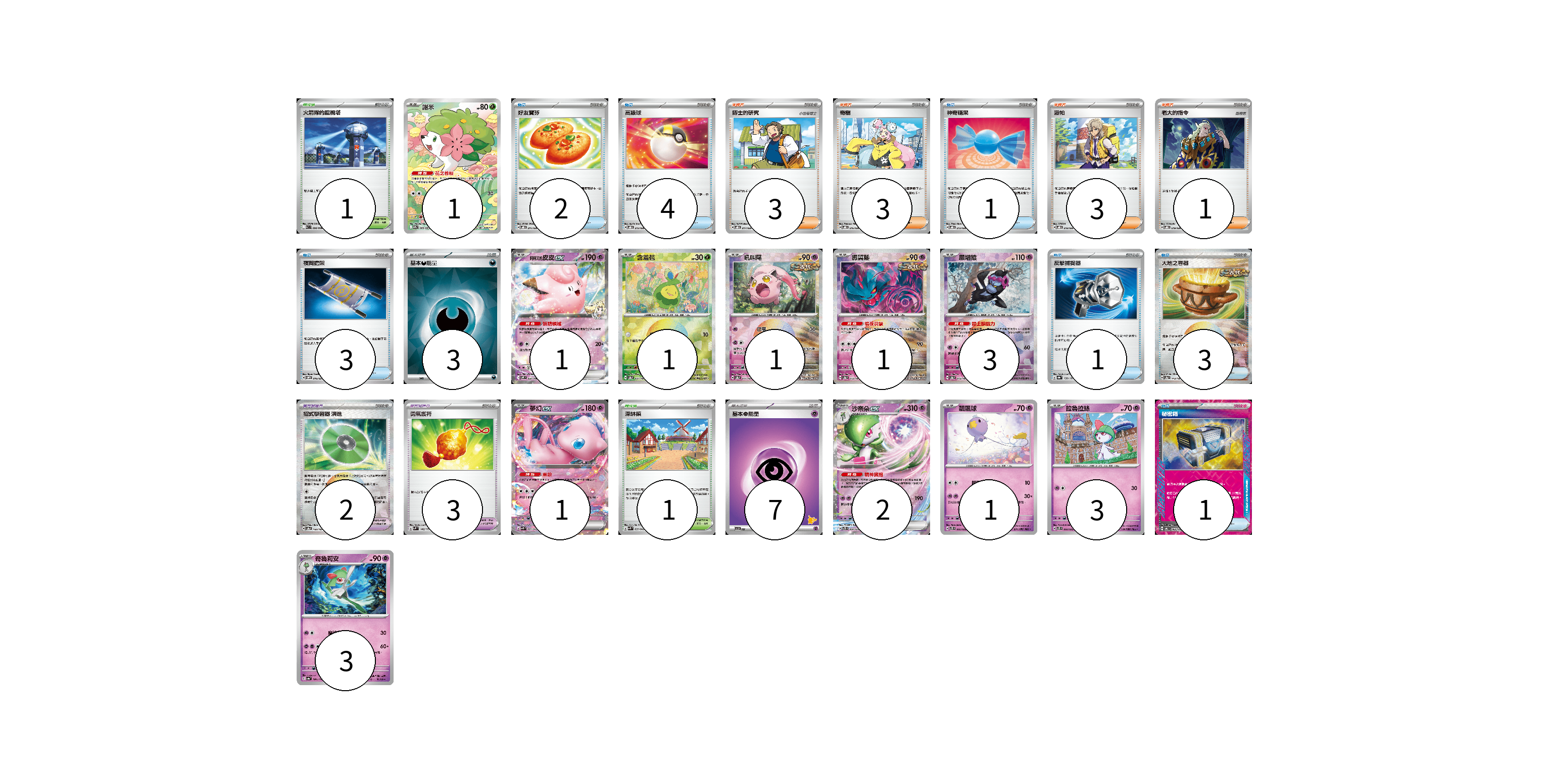 牌組構築方案 以此牌組為基礎新構築牌組 顯示卡面 顯示列表 寶可夢卡(18) 1 1 1 1 1 3 1 2 1 3 3 寶可夢道具(5) 2 3 物品卡(15) 2 4 1 3 1 3 1 支援者卡(10) 3 3 3 1 競技場卡(2) 1 1 能量卡(10) 3 7 寶可夢卡(18) 卡牌名稱 張數 卡牌名稱 張數 謝米 SV9a 066/063 01 莉莉艾的皮皮ex SV9 033/100 01 含羞苞 SV8a 001/187 01 吼叫尾 SV8a 071/187 01 振翼髮 SV8a 072/187 01 願增猿 SV8a 075/187 03 夢幻ex SVK 001/042 01 沙奈朵ex SVTS 004/022 02 飄飄球 SVTS 005/022 01 拉魯拉絲 SVTS 002/022 03 奇魯莉安 SV4a 081/190 03 寶可夢道具(5) 卡牌名稱 張數 卡牌名稱 張數 招式學習器 演進 SV8a 160/187 02 勇氣護符 SVM 142/175 03 物品卡(15) 卡牌名稱 張數 卡牌名稱 張數 好友寶芬 SVOD 011/020 02 高級球 SVOD 012/020 04 神奇糖果 SVOD 013/020 01 夜間擔架 SVOM 016/021 03 反擊捕捉器 SV8a 139/187 01 大地之容器 SV8a 143/187 03 秘密箱 SV6 092/101 01 支援者卡(10) 卡牌名稱 張數 卡牌名稱 張數 博士的研究 SVOD 017/020 03 奇樹 SVOD 016/020 03 派帕 SVOD 018/020 03 老大的指令 SVOD 019/020 01 競技場卡(2) 卡牌名稱 張數 卡牌名稱 張數 火箭隊的監視塔 SV10 096/098 01 深缽鎮 SVK 039/042 01 能量卡(10) 卡牌名稱 張數 卡牌名稱 張數 基本【惡】能量 SVOM DAR 03 基本【超】能量 SVI PSY 07 以此牌組為基礎新構築牌組 牌組編碼 ufJPDs-mqEUbL-XpyWkJ copy 列印牌組單 牌組編碼已複製 分享至SNS