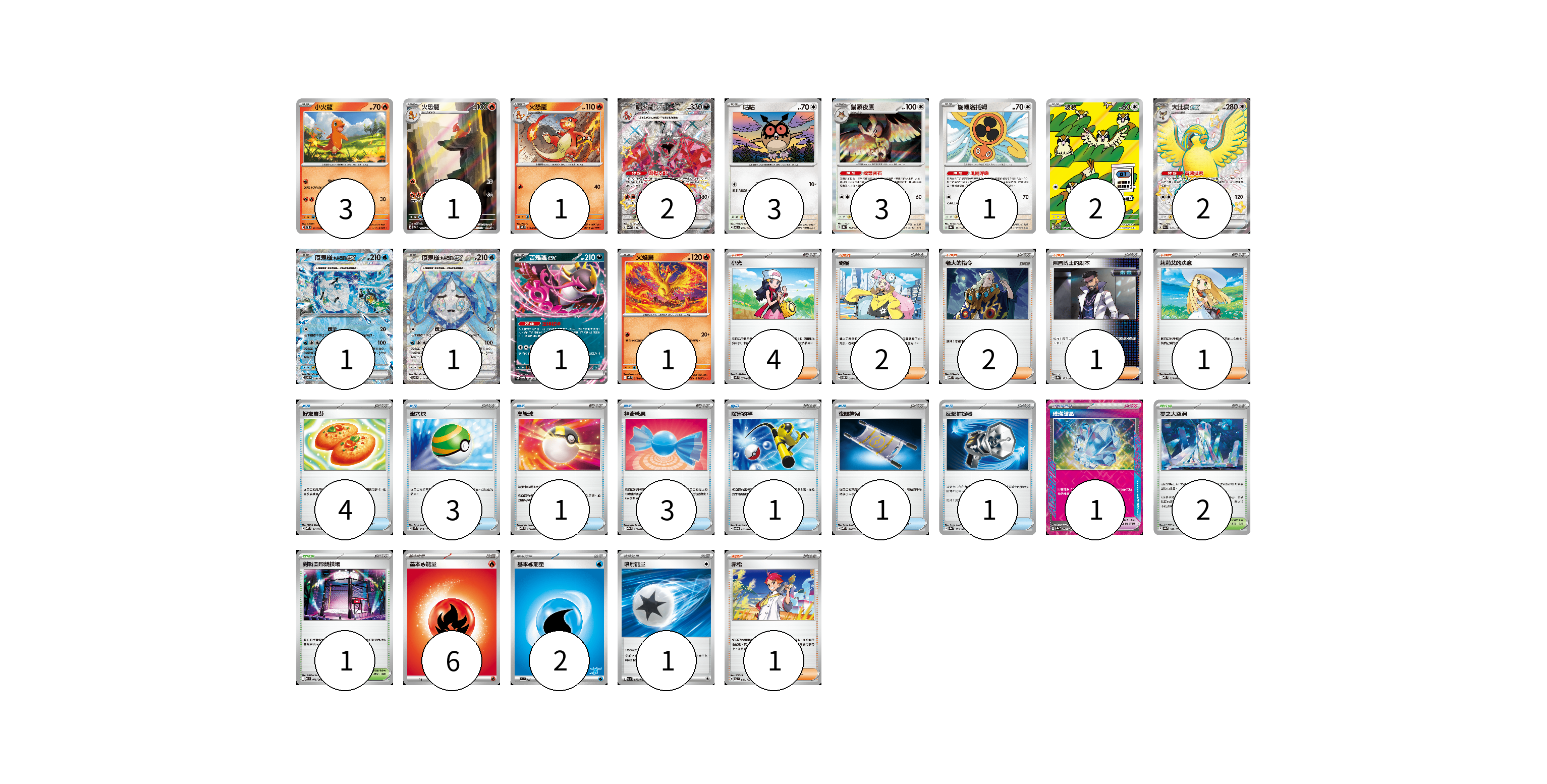 牌組構築方案 以此牌組為基礎新構築牌組 顯示卡面 顯示列表 寶可夢卡(22) 3 1 1 2 3 3 1 2 2 1 1 1 1 寶可夢道具(1) 1 物品卡(14) 4 3 1 3 1 1 1 支援者卡(11) 4 2 2 1 1 1 競技場卡(3) 2 1 能量卡(9) 6 2 1 寶可夢卡(22) 卡牌名稱 張數 卡牌名稱 張數 小火龍 SVTL 001/021 03 火恐龍 SV2a 169/165 01 火恐龍 M2 012/080 01 噴火龍ex SV4a 331/190 02 咕咕 SV7 076/102 03 貓頭夜鷹 SV8a 128/187 03 旋轉洛托姆 SV8a 131/187 01 波波 SV3 118/108 02 大比鳥ex SV4a 335/190 02 厄鬼椪 水井面具ex SV6 038/101 01 厄鬼椪 水井面具ex SV6 117/101 01 吉雉雞ex SVOM 009/021 01 火焰鳥 M2 014/080 01 寶可夢道具(1) 卡牌名稱 張數 卡牌名稱 張數 璀璨結晶 SV8a 152/187 01 物品卡(14) 卡牌名稱 張數 卡牌名稱 張數 好友寶芬 MBD 013/022 04 巢穴球 SVM 133/175 03 高級球 MBD 014/022 01 神奇糖果 MBG 013/022 03 厲害釣竿 SVOD 010/020 01 夜間擔架 MBD 016/022 01 反擊捕捉器 SV8a 139/187 01 支援者卡(11) 卡牌名稱 張數 卡牌名稱 張數 小光 M2 077/080 04 奇樹 SVOM 018/021 02 老大的指令 MBD 020/022 02 弗圖博士的劇本 SV8a 175/187 01 莉莉艾的決意 MBD 021/022 01 赤松 SV7 097/102 01 競技場卡(3) 卡牌名稱 張數 卡牌名稱 張數 零之大空洞 SV8a 182/187 02 對戰圓形競技場 M2 079/080 01 能量卡(9) 卡牌名稱 張數 卡牌名稱 張數 基本【火】能量 M-P FIR 06 基本【水】能量 SVI WAT 02 噴射能量 SV1a 072/073 01 以此牌組為基礎新構築牌組 牌組編碼 ufqBmO-FpyafN-yzYWTV copy 列印牌組單 牌組編碼已複製 分享至SNS