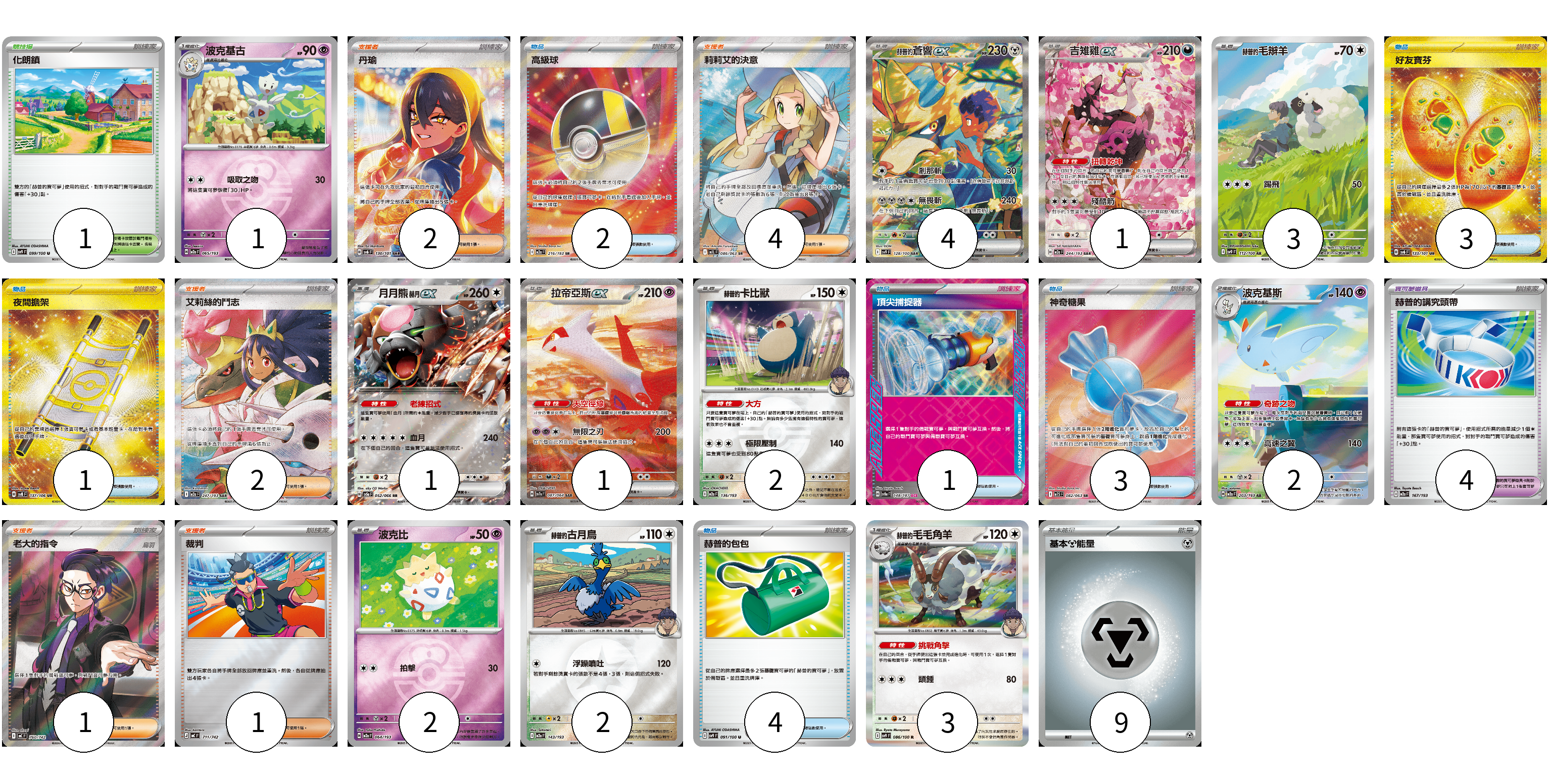 牌組構築方案 以此牌組為基礎新構築牌組 顯示卡面 顯示列表 寶可夢卡(22) 1 4 1 3 1 1 2 2 2 2 3 寶可夢道具(4) 4 物品卡(14) 2 3 1 1 3 4 支援者卡(10) 2 4 2 1 1 競技場卡(1) 1 能量卡(9) 9 寶可夢卡(22) 卡牌名稱 張數 卡牌名稱 張數 波克基古 M2a 065/193 01 赫普的蒼響ex SV9 128/100 04 吉雉雞ex M2a 244/193 01 赫普的毛辮羊 SV9 112/100 03 月月熊 赫月 ex SV5a 052/066 01 拉帝亞斯ex SV7a 087/064 01 赫普的卡比獸 M2a 136/193 02 波克基斯 M2a 203/193 02 波克比 M2a 064/193 02 赫普的古月鳥 M2a 143/193 02 赫普的毛毛角羊 SV9 086/100 03 寶可夢道具(4) 卡牌名稱 張數 卡牌名稱 張數 赫普的講究頭帶 M2a 167/193 04 物品卡(14) 卡牌名稱 張數 卡牌名稱 張數 高級球 M2a 216/193 02 好友寶芬 SV6 133/101 03 夜間擔架 SV8 137/106 01 頂尖捕捉器 SV8a 148/187 01 神奇糖果 M1S 082/063 03 赫普的包包 SV9 091/100 04 支援者卡(10) 卡牌名稱 張數 卡牌名稱 張數 丹瑜 SV6 130/101 02 莉莉艾的決意 M1L 086/063 04 艾莉絲的鬥志 M2a 247/193 02 老大的指令(烏羽) MC 760/742 01 裁判 MC 711/742 01 競技場卡(1) 卡牌名稱 張數 卡牌名稱 張數 化朗鎮 SV9 099/100 01 能量卡(9) 卡牌名稱 張數 卡牌名稱 張數 基本【鋼】能量 M-P MET 09 以此牌組為基礎新構築牌組 牌組編碼 ugUPsJ-ICOTPW-yQTrLP copy 列印牌組單 牌組編碼已複製 分享至SNS
