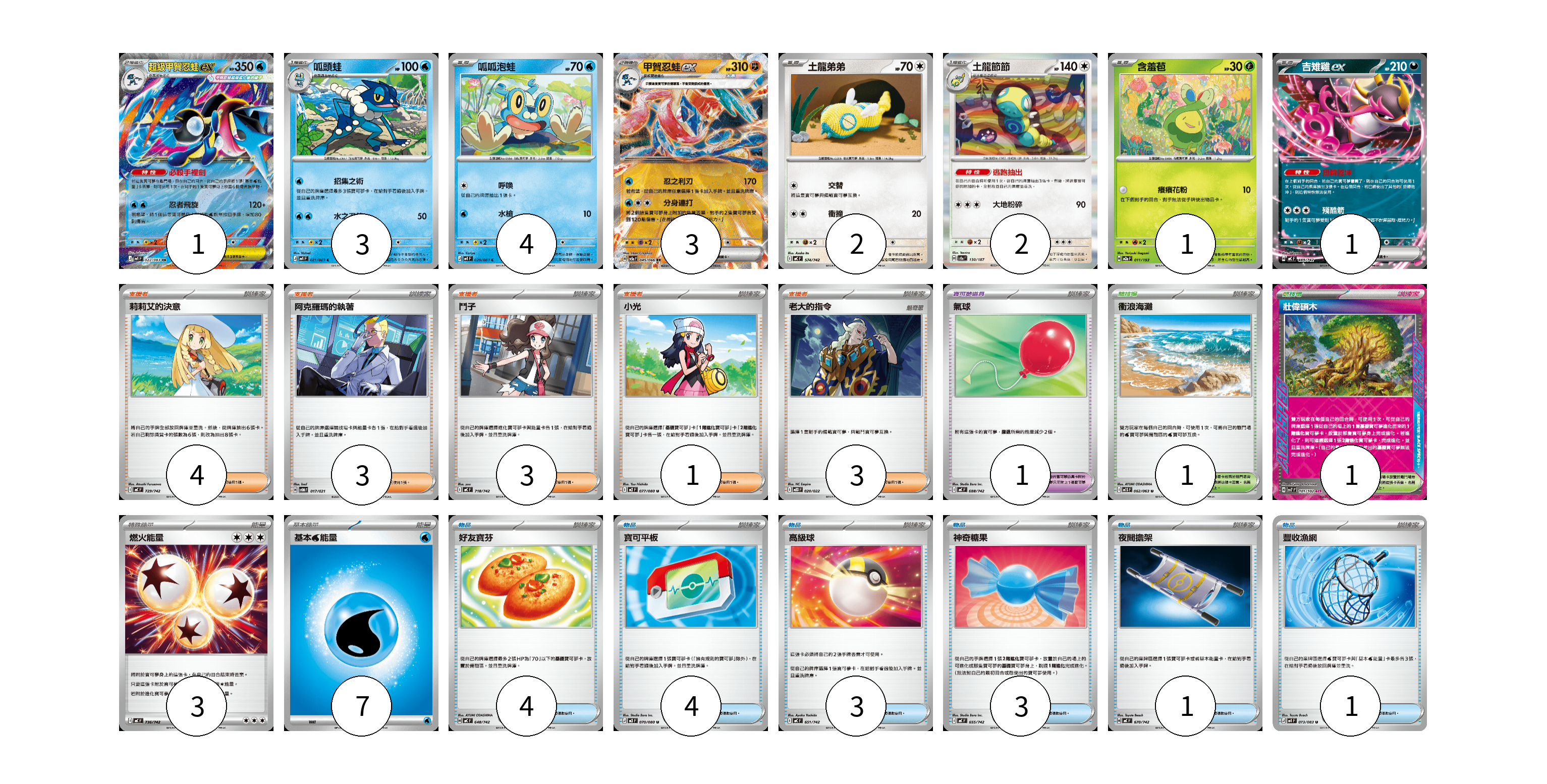 牌組構築方案 以此牌組為基礎新構築牌組 顯示卡面 顯示列表 寶可夢卡(17) 1 3 4 3 2 2 1 1 寶可夢道具(1) 1 物品卡(16) 4 4 3 3 1 1 支援者卡(14) 4 3 3 1 3 競技場卡(2) 1 1 能量卡(10) 3 7 寶可夢卡(17) 卡牌名稱 張數 卡牌名稱 張數 超級甲賀忍蛙ex M4 022/083 01 呱頭蛙 M4 021/083 03 呱呱泡蛙 M4 020/083 04 甲賀忍蛙ex SV5a 045/066 03 土龍弟弟 MC 574/742 02 土龍節節 SV8a 130/187 02 含羞苞 M2a 011/193 01 吉雉雞ex MC 489/742 01 寶可夢道具(1) 卡牌名稱 張數 卡牌名稱 張數 氣球 MC 688/742 01 物品卡(16) 卡牌名稱 張數 卡牌名稱 張數 好友寶芬 MC 648/742 04 寶可平板 M3 070/080 04 高級球 MC 651/742 03 神奇糖果 MC 655/742 03 夜間擔架 MC 670/742 01 豐收漁網 M4 073/083 01 支援者卡(14) 卡牌名稱 張數 卡牌名稱 張數 莉莉艾的決意 MC 729/742 04 阿克羅瑪的執著 SVOM 017/021 03 鬥子 MC 718/742 03 小光 M2 077/080 01 老大的指令 MBD 020/022 03 競技場卡(2) 卡牌名稱 張數 卡牌名稱 張數 衝浪海灘 M1S 062/063 01 壯偉碩木 SV7 101/102 01 能量卡(10) 卡牌名稱 張數 卡牌名稱 張數 燃火能量 MC 736/742 03 基本【水】能量 MC WAT 07 以此牌組為基礎新構築牌組 牌組編碼 ujeSBx-hclBCc-OBkOgT copy 列印牌組單 牌組編碼已複製 分享至SNS