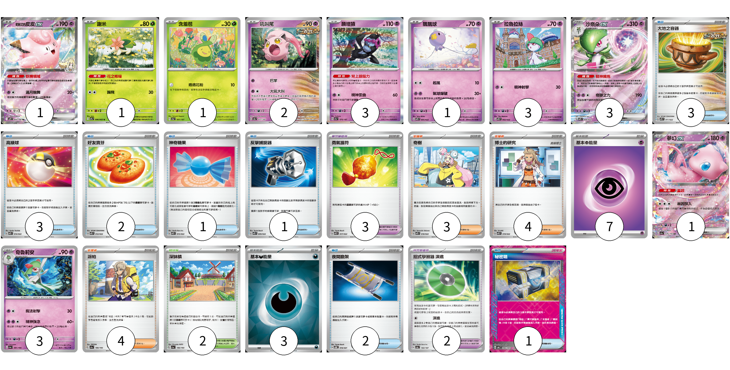 牌組構築方案 以此牌組為基礎新構築牌組 顯示卡面 顯示列表 寶可夢卡(19) 1 1 1 2 3 1 3 3 1 3 寶可夢道具(5) 3 2 物品卡(13) 3 3 2 1 1 2 1 支援者卡(11) 3 4 4 競技場卡(2) 2 能量卡(10) 7 3 寶可夢卡(19) 卡牌名稱 張數 卡牌名稱 張數 莉莉艾的皮皮ex SV9 033/100 01 謝米 SV9a 006/063 01 含羞苞 SV8a 001/187 01 吼叫尾 SV8a 071/187 02 願增猿 SV8a 075/187 03 飄飄球 SVTS 005/022 01 拉魯拉絲 SVTS 002/022 03 沙奈朵ex SVTS 004/022 03 夢幻ex SV4a 076/190 01 奇魯莉安 SV4a 081/190 03 寶可夢道具(5) 卡牌名稱 張數 卡牌名稱 張數 勇氣護符 SVTS 017/022 03 招式學習器 演進 SV8a 160/187 02 物品卡(13) 卡牌名稱 張數 卡牌名稱 張數 大地之容器 SVTS 011/022 03 高級球 SVTS 014/022 03 好友寶芬 SVTS 012/022 02 神奇糖果 SVTS 015/022 01 反擊捕捉器 SVTS 009/022 01 夜間擔架 SVOM 016/021 02 秘密箱 SV6 092/101 01 支援者卡(11) 卡牌名稱 張數 卡牌名稱 張數 奇樹 SVTS 018/022 03 博士的研究 SVTS 019/022 04 派帕 SV4a 180/190 04 競技場卡(2) 卡牌名稱 張數 卡牌名稱 張數 深缽鎮 SV4a 185/190 02 能量卡(10) 卡牌名稱 張數 卡牌名稱 張數 基本【超】能量 SVTS PSY 07 基本【惡】能量 SVOM DAR 03 以此牌組為基礎新構築牌組 牌組編碼 ujvtdE-LTkjFO-EmlTAj copy 列印牌組單 牌組編碼已複製 分享至SNS
