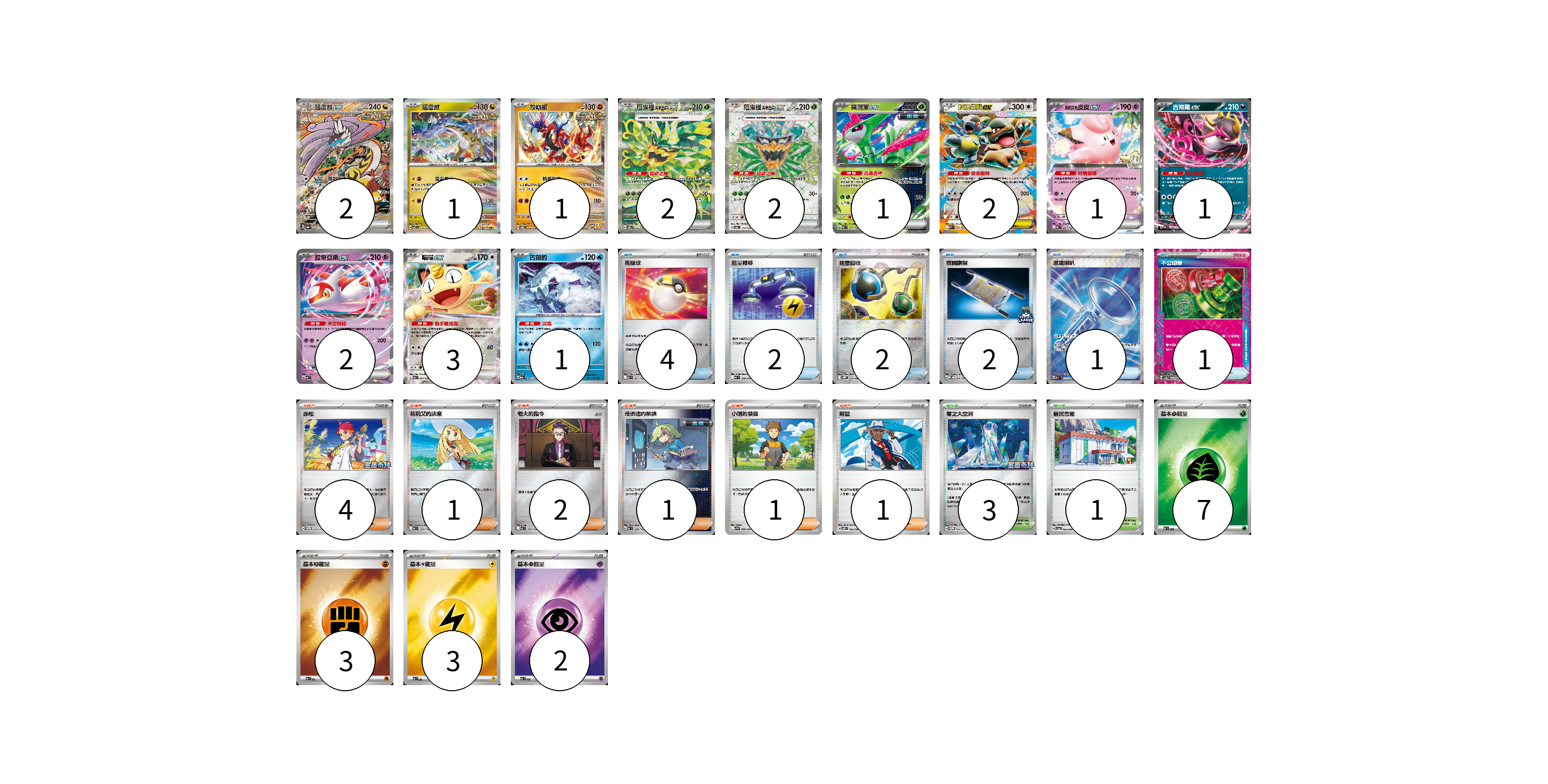 牌組構築方案 以此牌組為基礎新構築牌組 顯示卡面 顯示列表 寶可夢卡(19) 2 1 1 2 2 1 2 1 1 2 3 1 物品卡(12) 4 2 2 2 1 1 支援者卡(10) 4 1 2 1 1 1 競技場卡(4) 3 1 能量卡(15) 7 3 3 2 寶可夢卡(19) 卡牌名稱 張數 卡牌名稱 張數 猛雷鼓ex SV8a 222/187 02 猛雷鼓 SV7 075/102 01 故勒頓 SV8 069/106 01 厄鬼椪 碧草面具ex SV6 125/101 02 厄鬼椪 碧草面具ex SV6 114/101 02 鐵斑葉ex MC 077/742 01 超級袋獸ex M1S 051/063 02 莉莉艾的皮皮ex MC 287/742 01 吉雉雞ex MC 489/742 01 拉帝亞斯ex MC 312/742 02 喵喵ex M3 061/080 03 古劍豹 M2a 043/193 01 物品卡(12) 卡牌名稱 張數 卡牌名稱 張數 高級球 MC 651/742 04 能量轉移 MC 638/742 02 能量回收 SV11W 079/086 02 夜間擔架 SV-P 204/SV-P 02 玻璃喇叭 M2a 215/193 01 不公印章 SV5a 053/066 01 支援者卡(10) 卡牌名稱 張數 卡牌名稱 張數 赤松 SV-P 150/SV-P 04 莉莉艾的決意 MC 729/742 01 老大的指令 MC 724/742 02 暗碼迷的解讀 MC 698/742 01 小剛的發掘 SV9 096/100 01 席藍 SV8 102/106 01 競技場卡(4) 卡牌名稱 張數 卡牌名稱 張數 零之大空洞 SV-P 151/SV-P 03 居民會館 SV5a 065/066 01 能量卡(15) 卡牌名稱 張數 卡牌名稱 張數 基本【草】能量 MC GRA 07 基本【鬥】能量 MC FIG 03 基本【雷】能量 MC LIG 03 基本【超】能量 MC PSY 02 以此牌組為基礎新構築牌組 牌組編碼 ureOvo-IubWdc-BjaqRH copy 列印牌組單 牌組編碼已複製 分享至SNS