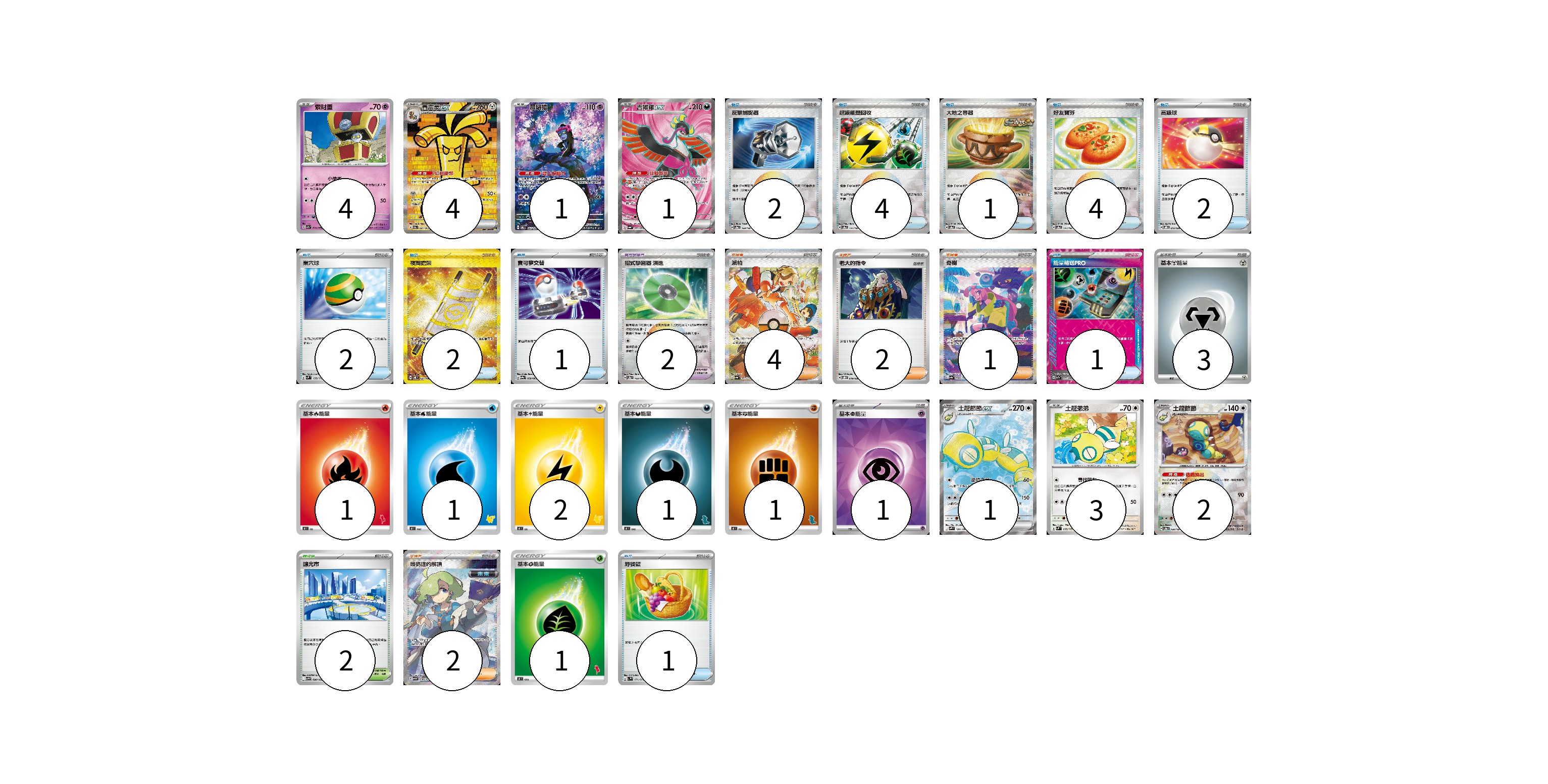 牌組構築方案 以此牌組為基礎新構築牌組 顯示卡面 顯示列表 寶可夢卡(16) 4 4 1 1 1 3 2 寶可夢道具(2) 2 物品卡(20) 2 4 1 4 2 2 2 1 1 1 支援者卡(9) 4 2 1 2 競技場卡(2) 2 能量卡(11) 3 1 1 2 1 1 1 1 寶可夢卡(16) 卡牌名稱 張數 卡牌名稱 張數 索財靈 SV7a 024/064 04 賽富豪ex SV3a 087/062 04 願增猿 SV6 107/101 01 吉雉雞ex SV6a 081/064 01 土龍節節ex SV9 120/100 01 土龍弟弟 SVM 095/175 03 土龍節節 SV8a 130/187 02 寶可夢道具(2) 卡牌名稱 張數 卡牌名稱 張數 招式學習器 演進 SV8a 160/187 02 物品卡(20) 卡牌名稱 張數 卡牌名稱 張數 反擊捕捉器 SV8a 139/187 02 超級能量回收 SV8a 141/187 04 大地之容器 SV8a 143/187 01 好友寶芬 SV8a 147/187 04 高級球 SVOD 012/020 02 巢穴球 SVM 133/175 02 夜間擔架 SV8 137/106 02 寶可夢交替 SV9a 058/063 01 能量輸送PRO SV7a 052/064 01 野餐籃 SV1V 071/078 01 支援者卡(9) 卡牌名稱 張數 卡牌名稱 張數 派帕 SV4a 353/190 04 老大的指令 SVOD 019/020 02 奇樹 SV4a 350/190 01 暗碼迷的解讀 SV5M 090/071 02 競技場卡(2) 卡牌名稱 張數 卡牌名稱 張數 釀光市 SV9 098/100 02 能量卡(11) 卡牌名稱 張數 卡牌名稱 張數 基本【鋼】能量 SVD MET 03 基本火能量 SH FIR 01 基本水能量 SH WAT 01 基本雷能量 SH LIG 02 基本惡能量 SH DAR 01 基本鬥能量 SH FIG 01 基本【超】能量 SVOD PSY 01 基本草能量 SH GRA 01 以此牌組為基礎新構築牌組 牌組編碼 usLVBJ-XpHowe-uIvdYX copy 列印牌組單 牌組編碼已複製 分享至SNS