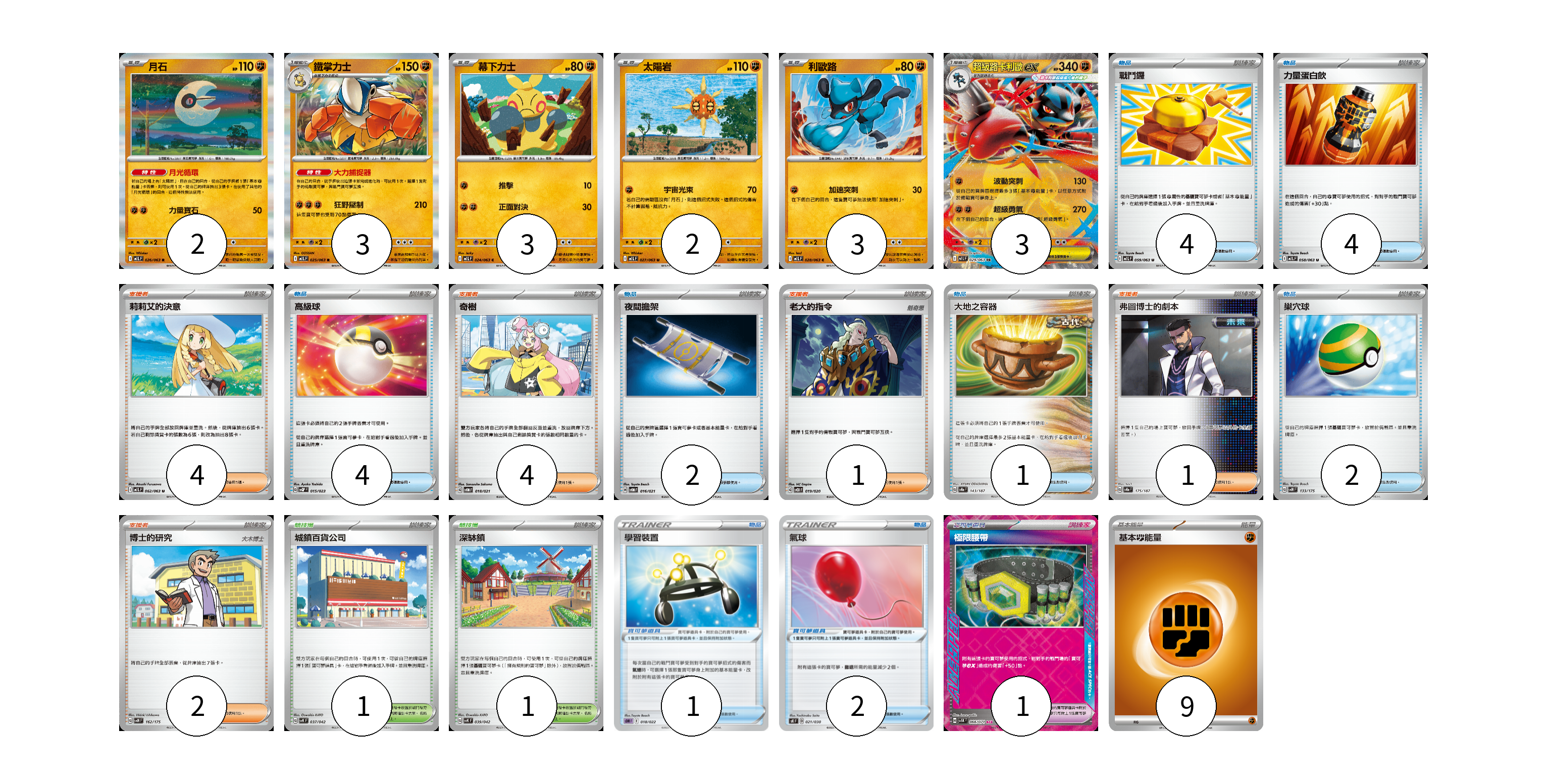 牌組構築方案 以此牌組為基礎新構築牌組 顯示卡面 顯示列表 寶可夢卡(16) 2 3 3 2 3 3 寶可夢道具(4) 1 2 1 物品卡(17) 4 4 4 2 1 2 支援者卡(12) 4 4 1 1 2 競技場卡(2) 1 1 能量卡(9) 9 寶可夢卡(16) 卡牌名稱 張數 卡牌名稱 張數 月石 M1L 026/063 02 鐵掌力士 M1L 025/063 03 幕下力士 M1L 024/063 03 太陽岩 M1L 027/063 02 利歐路 M1L 028/063 03 超級路卡利歐ex M1L 029/063 03 寶可夢道具(4) 卡牌名稱 張數 卡牌名稱 張數 學習裝置 SDM 018/022 01 氣球 SK 021/030 02 極限腰帶 SV5K 066/071 01 物品卡(17) 卡牌名稱 張數 卡牌名稱 張數 戰鬥鑼 M1L 059/063 04 力量蛋白飲 M1L 058/063 04 高級球 SVQP 015/023 04 夜間擔架 SVOM 016/021 02 大地之容器 SV8a 143/187 01 巢穴球 SVM 133/175 02 支援者卡(12) 卡牌名稱 張數 卡牌名稱 張數 莉莉艾的決意 M1L 062/063 04 奇樹 SVOM 018/021 04 老大的指令 SVOD 019/020 01 弗圖博士的劇本 SV8a 175/187 01 博士的研究 SVM 162/175 02 競技場卡(2) 卡牌名稱 張數 卡牌名稱 張數 城鎮百貨公司 SVK 037/042 01 深缽鎮 SVK 039/042 01 能量卡(9) 卡牌名稱 張數 卡牌名稱 張數 基本【鬥】能量 SVB FIG 09 以此牌組為基礎新構築牌組 牌組編碼 uxNfrm-lcdXPc-mbjMlC copy 列印牌組單 牌組編碼已複製 分享至SNS