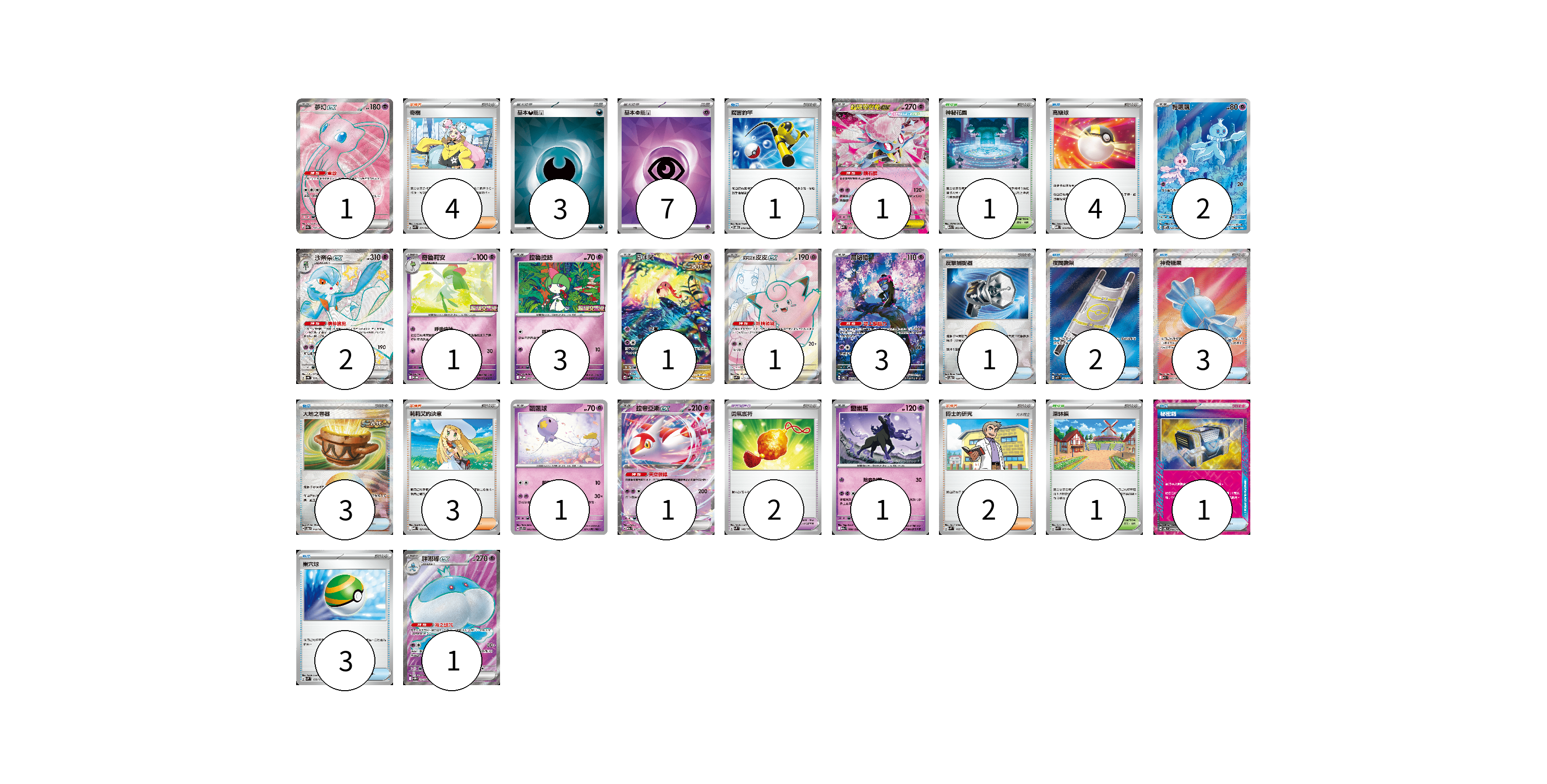牌組構築方案 以此牌組為基礎新構築牌組 顯示卡面 顯示列表 寶可夢卡(19) 1 1 2 2 1 3 1 1 3 1 1 1 1 寶可夢道具(2) 2 物品卡(18) 1 4 1 2 3 3 1 3 支援者卡(9) 4 3 2 競技場卡(2) 1 1 能量卡(10) 3 7 寶可夢卡(19) 卡牌名稱 張數 卡牌名稱 張數 夢幻ex SV2a 195/165 01 超級蒂安希ex MBD 006/022 01 輕飄飄 SV11W 124/086 02 沙奈朵ex SV4a 328/190 02 奇魯莉安 M-P 006/M-P 01 拉魯拉絲 M-P 005/M-P 03 吼叫尾 SV4K 071/066 01 莉莉艾的皮皮ex SV9 115/100 01 願增猿 SV6 107/101 03 飄飄球 SVTS 005/022 01 拉帝亞斯ex M2a 075/193 01 靈幽馬 M2a 080/193 01 胖嘟嘟ex SV11W 162/086 01 寶可夢道具(2) 卡牌名稱 張數 卡牌名稱 張數 勇氣護符 SVM 142/175 02 物品卡(18) 卡牌名稱 張數 卡牌名稱 張數 厲害釣竿 SVOD 010/020 01 高級球 MBD 014/022 04 反擊捕捉器 SV8a 139/187 01 夜間擔架 M1L 083/063 02 神奇糖果 M1S 082/063 03 大地之容器 SV8a 143/187 03 秘密箱 SV6 092/101 01 巢穴球 SVM 133/175 03 支援者卡(9) 卡牌名稱 張數 卡牌名稱 張數 奇樹 SVK 031/042 04 莉莉艾的決意 MBD 021/022 03 博士的研究 SVM 162/175 02 競技場卡(2) 卡牌名稱 張數 卡牌名稱 張數 神秘花園 M1S 063/063 01 深缽鎮 SVK 039/042 01 能量卡(10) 卡牌名稱 張數 卡牌名稱 張數 基本【惡】能量 SVK DAR 03 基本【超】能量 SVK PSY 07 以此牌組為基礎新構築牌組 牌組編碼 uylsKN-wFYpKg-ajURnE copy 列印牌組單 牌組編碼已複製 分享至SNS