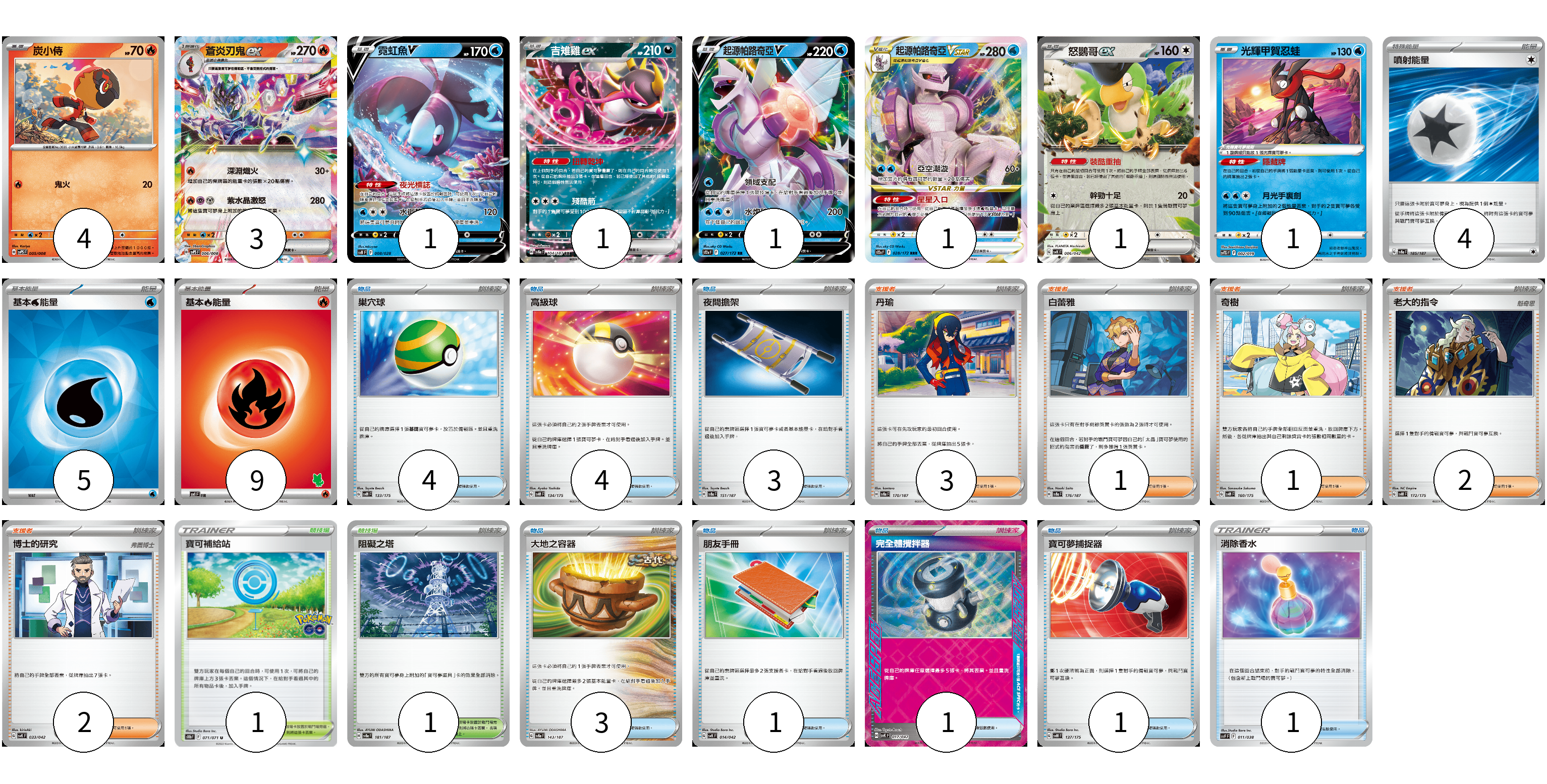 牌組構築方案 以此牌組為基礎新構築牌組 顯示卡面 顯示列表 寶可夢卡(13) 4 3 1 1 1 1 1 1 物品卡(18) 4 4 3 3 1 1 1 1 支援者卡(9) 3 1 1 2 2 競技場卡(2) 1 1 能量卡(18) 4 5 9 寶可夢卡(13) 卡牌名稱 張數 卡牌名稱 張數 炭小侍 SVPS 005/008 04 蒼炎刃鬼ex SVPS 006/008 03 霓虹魚V SVB 008/028 01 吉雉雞ex SV8a 104/187 01 起源帕路奇亞V S12a 027/172 01 起源帕路奇亞VSTAR S12a 028/172 01 怒鸚哥ex SVK 006/042 01 光輝甲賀忍蛙 SVTG 002/019 01 物品卡(18) 卡牌名稱 張數 卡牌名稱 張數 巢穴球 SVM 133/175 04 高級球 SVM 134/175 04 夜間擔架 SV8a 151/187 03 大地之容器 SV8a 143/187 03 朋友手冊 SVK 014/042 01 完全體攪拌器 SVK 017/042 01 寶可夢捕捉器 SVM 137/175 01 消除香水 SVF 011/038 01 支援者卡(9) 卡牌名稱 張數 卡牌名稱 張數 丹瑜 SV8a 170/187 03 白蕾雅 SV8a 176/187 01 奇樹 SVM 160/175 01 老大的指令 SVM 172/175 02 博士的研究 SVK 033/042 02 競技場卡(2) 卡牌名稱 張數 卡牌名稱 張數 寶可補給站 S10b 071/071 01 阻礙之塔 SV8a 181/187 01 能量卡(18) 卡牌名稱 張數 卡牌名稱 張數 噴射能量 SV8a 185/187 04 基本【水】能量 SVK WAT 05 基本【火】能量 SVI FIR 09 以此牌組為基礎新構築牌組 牌組編碼 uyqHKq-hSnATn-LUyDRc copy 列印牌組單 牌組編碼已複製 分享至SNS