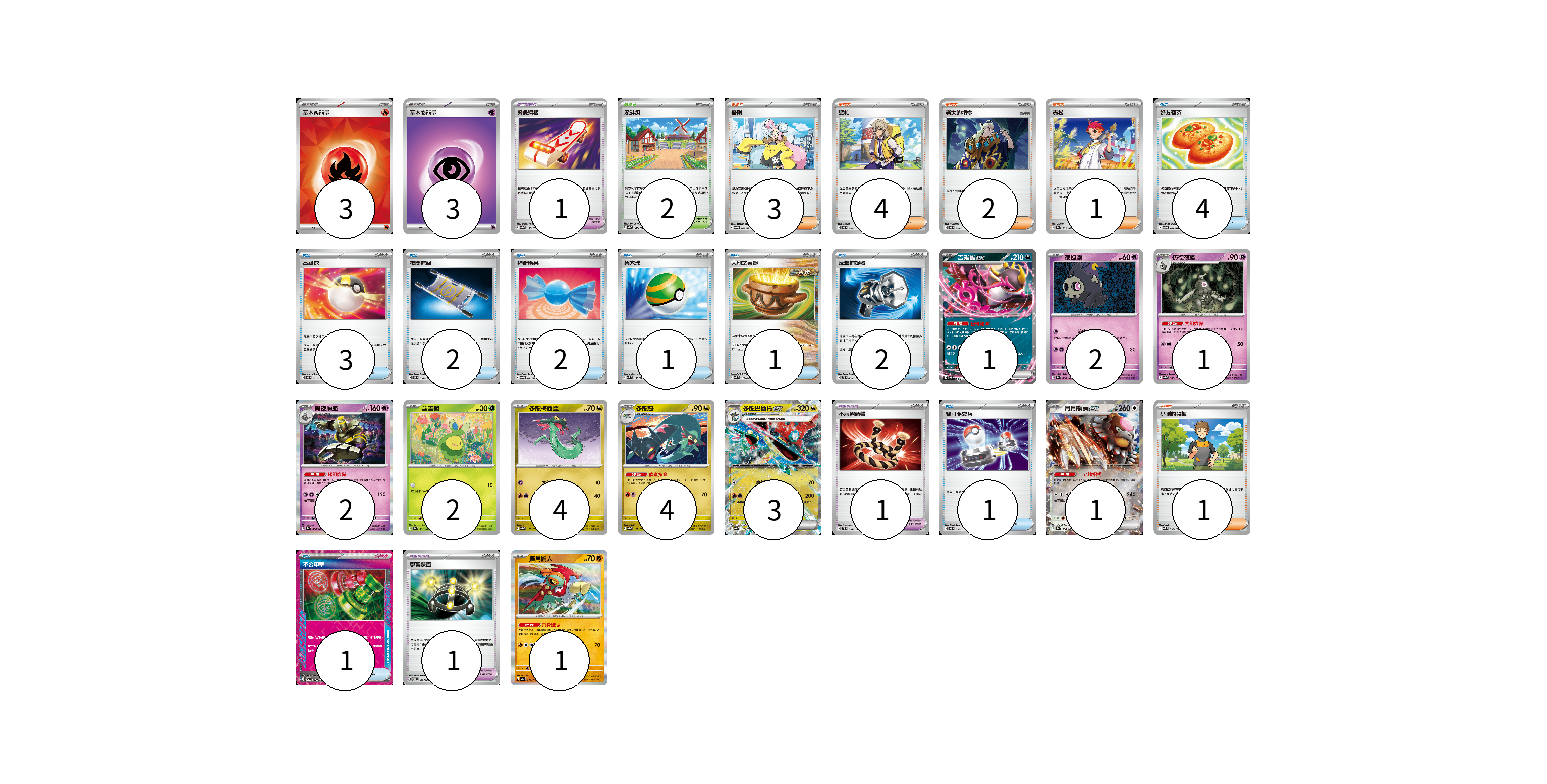 牌組構築方案 以此牌組為基礎新構築牌組 顯示卡面 顯示列表 寶可夢卡(21) 1 2 1 2 2 4 4 3 1 1 寶可夢道具(3) 1 1 1 物品卡(17) 4 3 2 2 1 1 2 1 1 支援者卡(11) 3 4 2 1 1 競技場卡(2) 2 能量卡(6) 3 3 寶可夢卡(21) 卡牌名稱 張數 卡牌名稱 張數 吉雉雞ex SVOD 004/020 01 夜巡靈 SV8a 064/187 02 彷徨夜靈 SV8a 065/187 01 黑夜魔靈 SV8a 066/187 02 含羞苞 SV8a 001/187 02 多龍梅西亞 SV8a 118/187 04 多龍奇 SV8a 119/187 04 多龍巴魯托ex SV8a 120/187 03 月月熊 赫月ex SV8a 134/187 01 摔角鷹人 SV1S 045/078 01 寶可夢道具(3) 卡牌名稱 張數 卡牌名稱 張數 緊急滑板 SV8a 153/187 01 不服輸頭帶 SVTL 016/021 01 學習裝置 SVTM 016/022 01 物品卡(17) 卡牌名稱 張數 卡牌名稱 張數 好友寶芬 SVOD 011/020 04 高級球 SVOD 012/020 03 夜間擔架 SVOM 016/021 02 神奇糖果 SVOM 014/021 02 巢穴球 SVM 133/175 01 大地之容器 SVK 012/042 01 反擊捕捉器 SVTS 009/022 02 寶可夢交替 SVOD 014/020 01 不公印章 SV5a 053/066 01 支援者卡(11) 卡牌名稱 張數 卡牌名稱 張數 奇樹 SVOM 018/021 03 派帕 SVOD 018/020 04 老大的指令 SVOD 019/020 02 赤松 SV8a 163/187 01 小剛的發掘 SV9 096/100 01 競技場卡(2) 卡牌名稱 張數 卡牌名稱 張數 深缽鎮 SV4a 185/190 02 能量卡(6) 卡牌名稱 張數 卡牌名稱 張數 基本【火】能量 SVK FIR 03 基本【超】能量 SVTS PSY 03 以此牌組為基礎新構築牌組 牌組編碼 vAFkeh-JNgrNx-mOyIiR copy 列印牌組單 牌組編碼已複製 分享至SNS