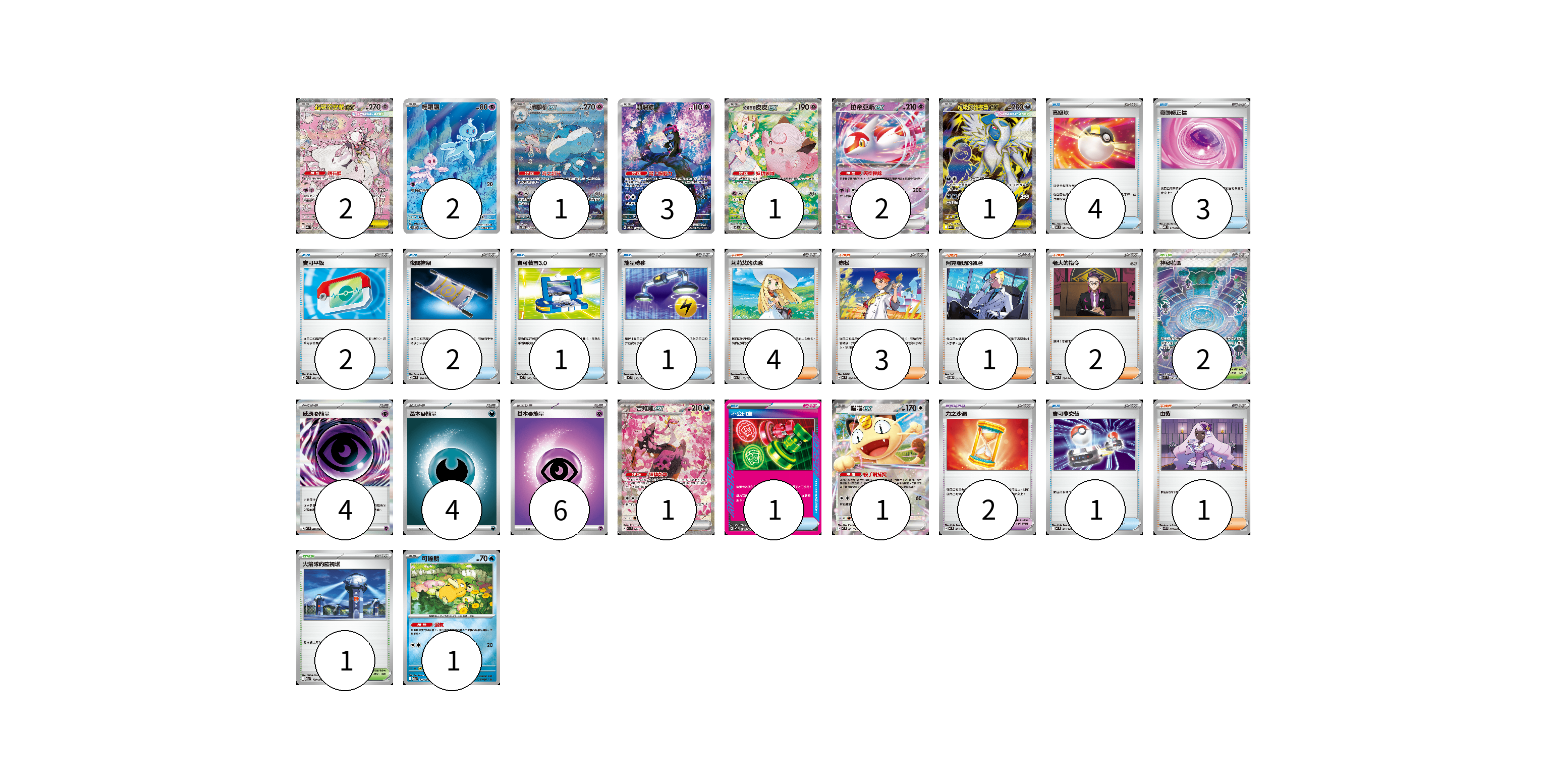 牌組構築方案 以此牌組為基礎新構築牌組 顯示卡面 顯示列表 寶可夢卡(15) 2 2 1 3 1 2 1 1 1 1 寶可夢道具(2) 2 物品卡(15) 4 3 2 2 1 1 1 1 支援者卡(11) 4 3 1 2 1 競技場卡(3) 2 1 能量卡(14) 4 4 6 寶可夢卡(15) 卡牌名稱 張數 卡牌名稱 張數 超級蒂安希ex M2a 238/193 02 輕飄飄 SV11W 124/086 02 胖嘟嘟ex SV11W 170/086 01 願增猿 SV6 107/101 03 莉莉艾的皮皮ex SV9 126/100 01 拉帝亞斯ex M2a 075/193 02 超級阿勃梭魯ex M1L 079/063 01 吉雉雞ex M2a 244/193 01 喵喵ex M3 061/080 01 可達鴨 M2a 032/193 01 寶可夢道具(2) 卡牌名稱 張數 卡牌名稱 張數 力之沙漏 MC 683/742 02 物品卡(15) 卡牌名稱 張數 卡牌名稱 張數 高級球 MC 651/742 04 奇跡修正檔 MBD 017/022 03 寶可平板 M3 070/080 02 夜間擔架 MC 670/742 02 寶可裝置3.0 MC 660/742 01 能量轉移 MC 638/742 01 不公印章 MC 633/742 01 寶可夢交替 MC 663/742 01 支援者卡(11) 卡牌名稱 張數 卡牌名稱 張數 莉莉艾的決意 M2a 175/193 04 赤松 MC 696/742 03 阿克羅瑪的執著 SVOM 017/021 01 老大的指令 MC 724/742 02 由紫 M3 076/080 01 競技場卡(3) 卡牌名稱 張數 卡牌名稱 張數 神秘花園 M1S 086/063 02 火箭隊的監視塔 M2a 189/193 01 能量卡(14) 卡牌名稱 張數 卡牌名稱 張數 感應【超】能量 M3 079/080 04 基本【惡】能量 MC DAR 04 基本【超】能量 MC PSY 06 以此牌組為基礎新構築牌組 牌組編碼 vBMCjg-ktxaEh-lUZKRE copy 列印牌組單 牌組編碼已複製 分享至SNS