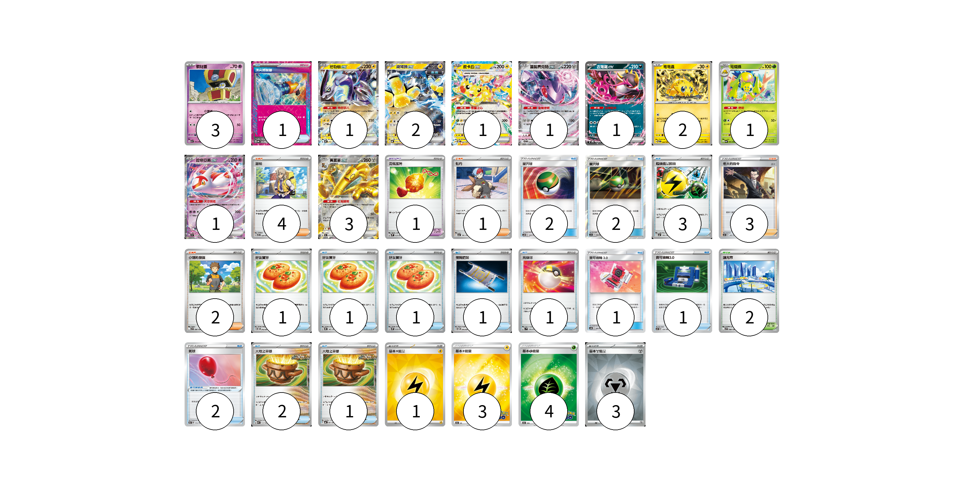 牌組構築方案 以此牌組為基礎新構築牌組 顯示卡面 顯示列表 寶可夢卡(16) 3 1 2 1 1 1 2 1 1 3 寶可夢道具(3) 1 2 物品卡(18) 1 2 2 3 1 1 1 1 1 1 1 2 1 支援者卡(10) 4 1 3 2 競技場卡(2) 2 能量卡(11) 1 3 4 3 寶可夢卡(16) 卡牌名稱 張數 卡牌名稱 張數 索財靈 SV7a 024/064 03 密勒頓ex SV4a 071/190 01 鐵臂膀ex SV8a 054/187 02 皮卡丘ex SV8 033/106 01 蓋諾賽克特ex SV11B 069/086 01 吉雉雞ex SVOM 009/021 01 電電蟲 SV7 032/102 02 電蜘蛛 SV6a 002/064 01 拉帝亞斯ex SV7a 019/064 01 賽富豪ex SV3a 050/062 03 寶可夢道具(3) 卡牌名稱 張數 卡牌名稱 張數 勇氣護符 SV2D 067/071 01 氣球 S8b 145/184 02 物品卡(18) 卡牌名稱 張數 卡牌名稱 張數 頂尖捕捉器 SV8a 148/187 01 巢穴球 AC2D 146/176 02 巢穴球 AS5a 178/184 02 超級能量回收 SV4a 157/190 03 好友寶芬 SVOM 012/021 01 好友寶芬 SV8a 147/187 01 好友寶芬 SV5K 063/071 01 夜間擔架 SVOM 016/021 01 高級球 SV1V 070/078 01 寶可齒輪3.0 AS6b 190/194 01 寶可齒輪3.0 SCB 126/156 01 大地之容器 SVK 012/042 02 大地之容器 SV4K 060/066 01 支援者卡(10) 卡牌名稱 張數 卡牌名稱 張數 派帕 SVTL 020/021 04 牡丹 SV4a 182/190 01 老大的指令(坂木) SC1b 148/153 03 小剛的發掘 SV9 096/100 02 競技場卡(2) 卡牌名稱 張數 卡牌名稱 張數 釀光市 SV9 098/100 02 能量卡(11) 卡牌名稱 張數 卡牌名稱 張數 基本【雷】能量 SVQP LIG 01 基本雷能量 S10b LIG 03 基本草能量 S10b GRA 04 基本【鋼】能量 SVOD MET 03 以此牌組為基礎新構築牌組 牌組編碼 vHrlhb-tKnuDU-RJvgPc copy 列印牌組單 牌組編碼已複製 分享至SNS