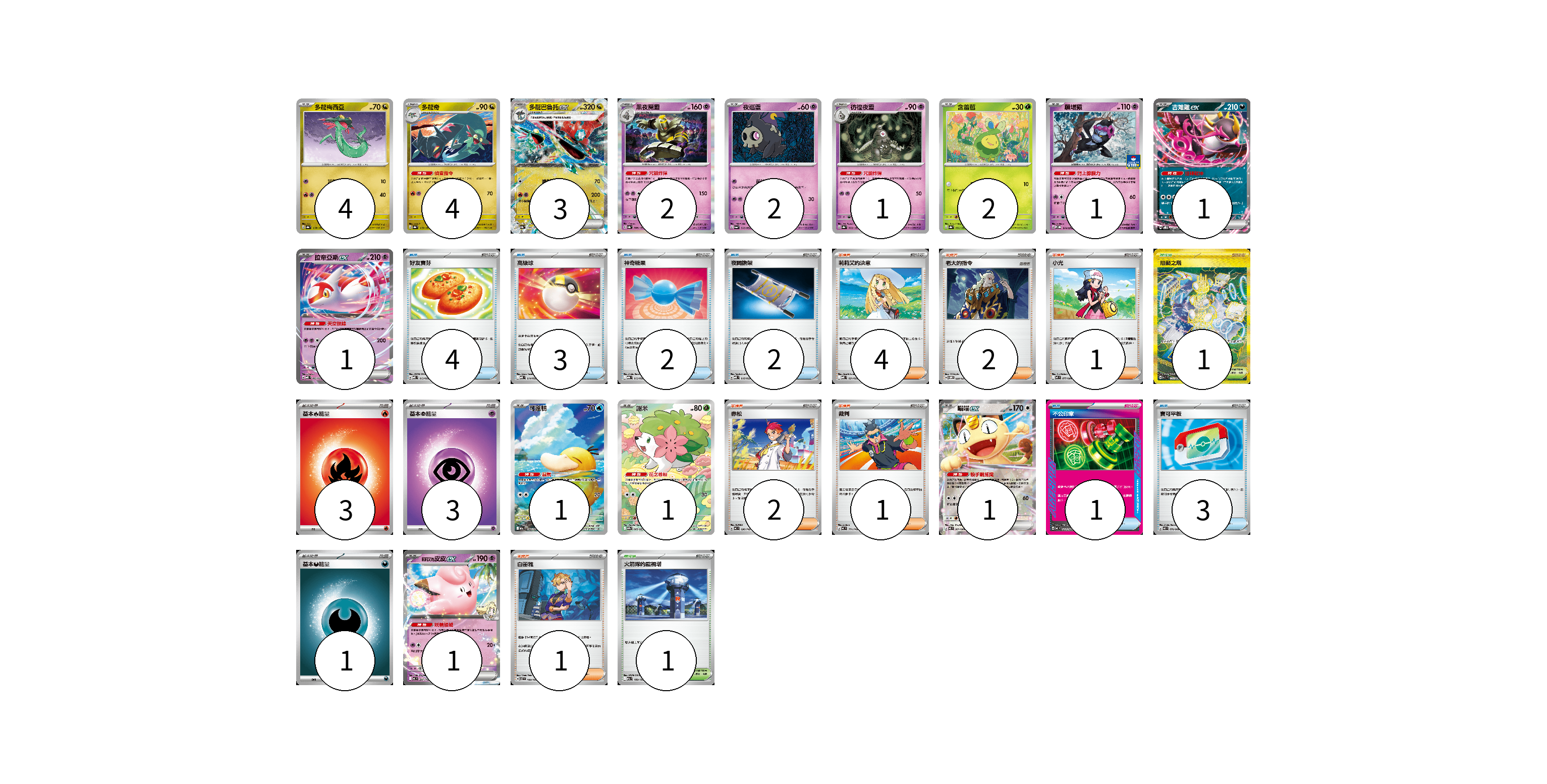 牌組構築方案 以此牌組為基礎新構築牌組 顯示卡面 顯示列表 寶可夢卡(25) 4 4 3 2 2 1 2 1 1 1 1 1 1 1 物品卡(15) 4 3 2 2 1 3 支援者卡(11) 4 2 1 2 1 1 競技場卡(2) 1 1 能量卡(7) 3 3 1 寶可夢卡(25) 卡牌名稱 張數 卡牌名稱 張數 多龍梅西亞 SV8a 118/187 04 多龍奇 SV8a 119/187 04 多龍巴魯托ex SV8a 120/187 03 黑夜魔靈 SV8a 066/187 02 夜巡靈 SV6a 018/064 02 彷徨夜靈 SV8a 065/187 01 含羞苞 SV8a 001/187 02 願增猿 M-P 014/M-P 01 吉雉雞ex SVOD 004/020 01 拉帝亞斯ex MBD 003/022 01 可達鴨 M2a 199/193 01 謝米 SV9a 066/063 01 喵喵ex M3 061/080 01 莉莉艾的皮皮ex MC 287/742 01 物品卡(15) 卡牌名稱 張數 卡牌名稱 張數 好友寶芬 MBD 013/022 04 高級球 MBD 014/022 03 神奇糖果 MBG 013/022 02 夜間擔架 MBD 016/022 02 不公印章 MC 633/742 01 寶可平板 M3 070/080 03 支援者卡(11) 卡牌名稱 張數 卡牌名稱 張數 莉莉艾的決意 MBD 021/022 04 老大的指令 SVOM 020/021 02 小光 M2 077/080 01 赤松 MC 696/742 02 裁判 MC 711/742 01 白蕾雅 SV7 100/102 01 競技場卡(2) 卡牌名稱 張數 卡牌名稱 張數 阻礙之塔 SV10 132/098 01 火箭隊的監視塔 M2a 189/193 01 能量卡(7) 卡牌名稱 張數 卡牌名稱 張數 基本【火】能量 M-P FIR 03 基本【超】能量 MBD PSY 03 基本【惡】能量 MC DAR 01 以此牌組為基礎新構築牌組 牌組編碼 vIRFLn-DPMXaa-OKwrLL copy 列印牌組單 牌組編碼已複製 分享至SNS