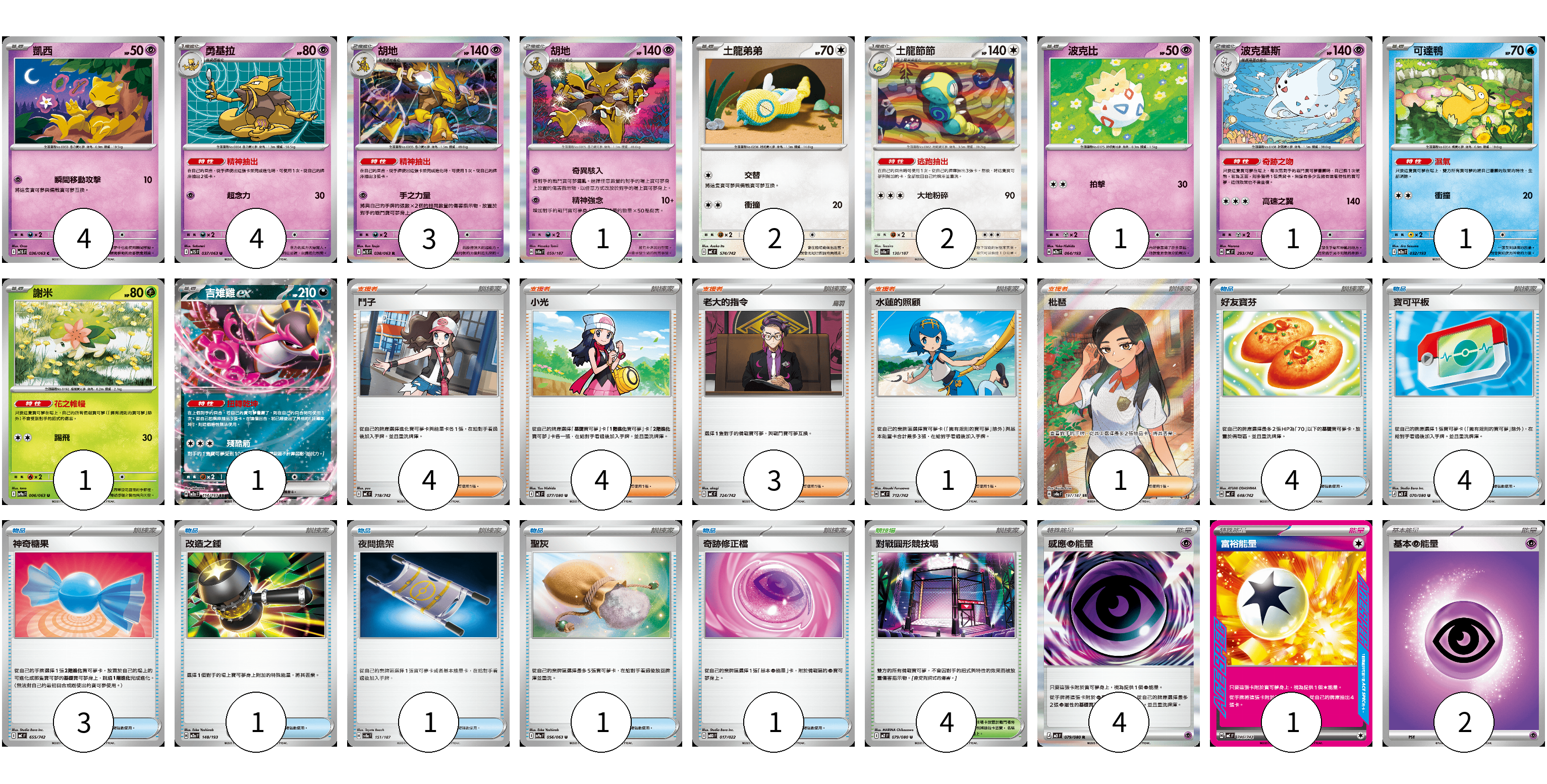 牌組構築方案 以此牌組為基礎新構築牌組 顯示卡面 顯示列表 寶可夢卡(21) 4 4 3 1 2 2 1 1 1 1 1 物品卡(15) 4 4 3 1 1 1 1 支援者卡(13) 4 4 3 1 1 競技場卡(4) 4 能量卡(7) 4 1 2 寶可夢卡(21) 卡牌名稱 張數 卡牌名稱 張數 凱西 M1S 036/063 04 勇基拉 M1S 037/063 04 胡地 M1S 038/063 03 胡地 SV8a 059/187 01 土龍弟弟 MC 574/742 02 土龍節節 SV8a 130/187 02 波克比 M2a 064/193 01 波克基斯 MC 293/742 01 可達鴨 M2a 032/193 01 謝米 SV9a 006/063 01 吉雉雞ex M2a 114/193 01 物品卡(15) 卡牌名稱 張數 卡牌名稱 張數 好友寶芬 MC 648/742 04 寶可平板 M3 070/080 04 神奇糖果 MC 655/742 03 改造之錘 M2a 148/193 01 夜間擔架 SV8a 151/187 01 聖灰 SV9a 056/063 01 奇跡修正檔 MBD 017/022 01 支援者卡(13) 卡牌名稱 張數 卡牌名稱 張數 鬥子 MC 718/742 04 小光 M2 077/080 04 老大的指令 MC 724/742 03 水蓮的照顧 MC 712/742 01 枇琶 SV8a 197/187 01 競技場卡(4) 卡牌名稱 張數 卡牌名稱 張數 對戰圓形競技場 M2 079/080 04 能量卡(7) 卡牌名稱 張數 卡牌名稱 張數 感應【超】能量 M3 079/080 04 富裕能量 MC 740/742 01 基本【超】能量 MC PSY 02 以此牌組為基礎新構築牌組 牌組編碼 vJoAVX-uNOSHJ-AWTlBa copy 列印牌組單 牌組編碼已複製 分享至SNS