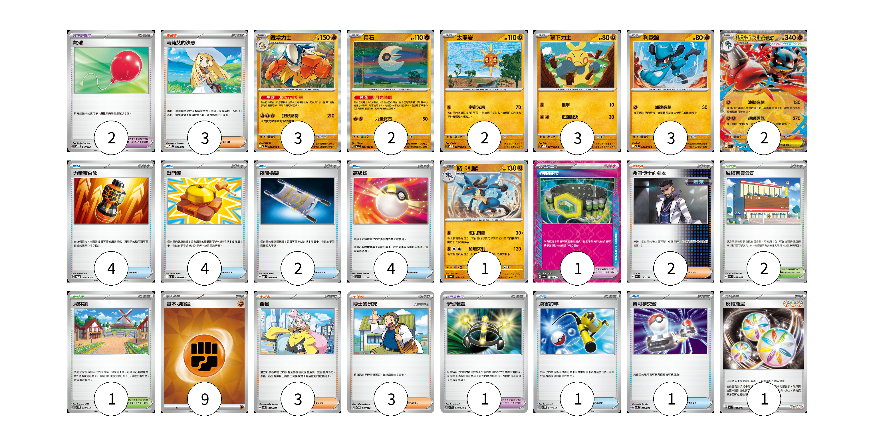 牌組構築方案 以此牌組為基礎新構築牌組 顯示卡面 顯示列表 寶可夢卡(16) 3 2 2 3 3 2 1 寶可夢道具(4) 2 1 1 物品卡(16) 4 4 2 4 1 1 支援者卡(11) 3 2 3 3 競技場卡(3) 2 1 能量卡(10) 9 1 寶可夢卡(16) 卡牌名稱 張數 卡牌名稱 張數 鐵掌力士 M1L 025/063 03 月石 M1L 026/063 02 太陽岩 M1L 027/063 02 幕下力士 M1L 024/063 03 利歐路 M1L 028/063 03 超級路卡利歐ex M1L 029/063 02 路卡利歐 SV4a 105/190 01 寶可夢道具(4) 卡牌名稱 張數 卡牌名稱 張數 氣球 MBG 019/022 02 極限腰帶 SV8a 159/187 01 學習裝置 SV1S 072/078 01 物品卡(16) 卡牌名稱 張數 卡牌名稱 張數 力量蛋白飲 M1L 058/063 04 戰鬥鑼 M1L 059/063 04 夜間擔架 MBG 017/022 02 高級球 MBG 012/022 04 厲害釣竿 SVK 011/042 01 寶可夢交替 SVQL 016/022 01 支援者卡(11) 卡牌名稱 張數 卡牌名稱 張數 莉莉艾的決意 MBG 022/022 03 弗圖博士的劇本 SV8a 175/187 02 奇樹 SVOD 016/020 03 博士的研究 SVOD 017/020 03 競技場卡(3) 卡牌名稱 張數 卡牌名稱 張數 城鎮百貨公司 SVK 037/042 02 深缽鎮 SVK 039/042 01 能量卡(10) 卡牌名稱 張數 卡牌名稱 張數 基本【鬥】能量 SVK FIG 09 反轉能量 SVK 041/042 01 以此牌組為基礎新構築牌組 牌組編碼 vLiPIk-aGTeJt-LzBngt copy 列印牌組單 牌組編碼已複製 分享至SNS