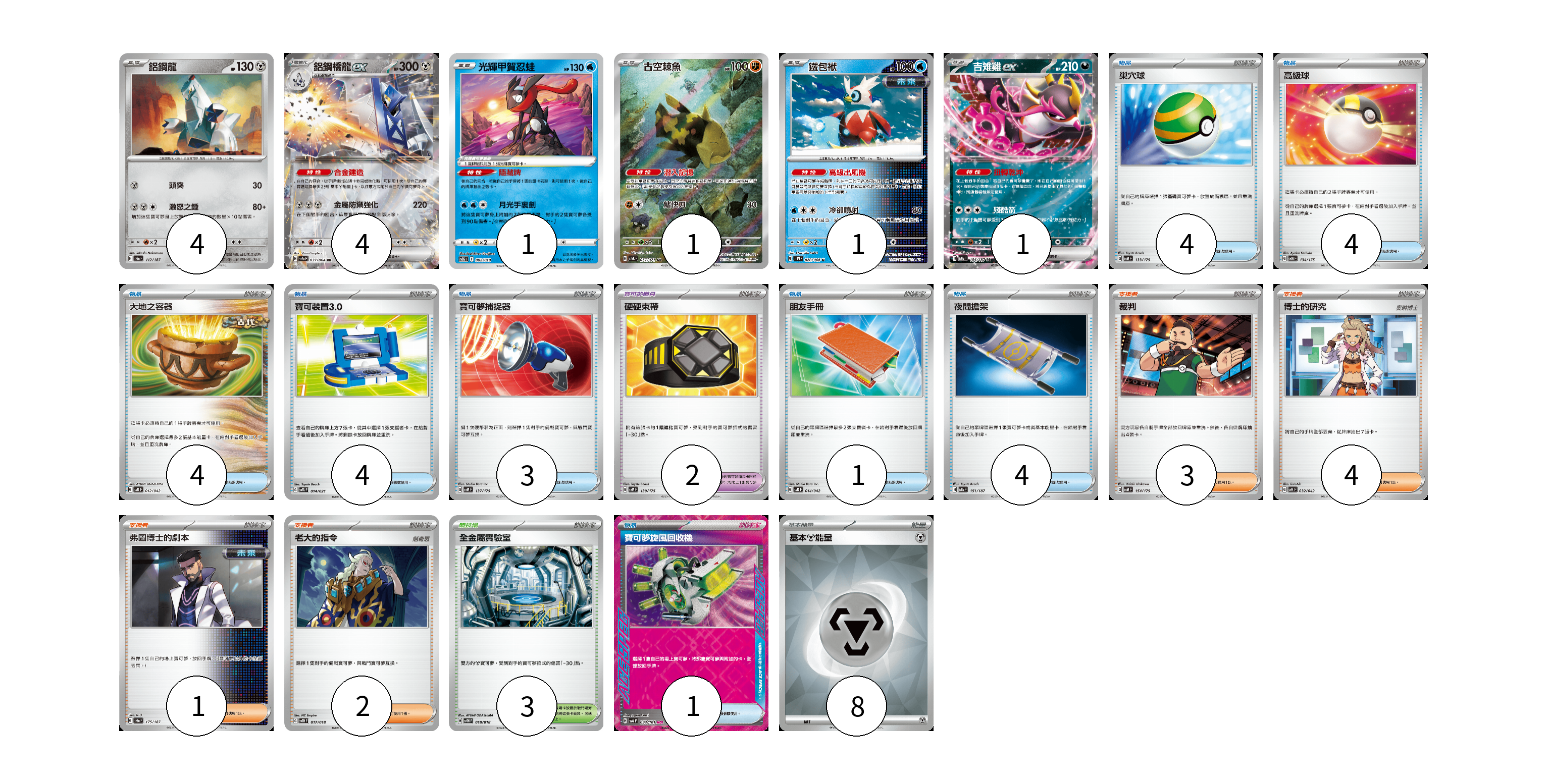 牌組構築方案 以此牌組為基礎新構築牌組 顯示卡面 顯示列表 寶可夢卡(12) 4 4 1 1 1 1 寶可夢道具(2) 2 物品卡(25) 4 4 4 4 3 1 4 1 支援者卡(10) 3 4 1 2 競技場卡(3) 3 能量卡(8) 8 寶可夢卡(12) 卡牌名稱 張數 卡牌名稱 張數 鋁鋼龍 SV8a 112/187 04 鋁鋼橋龍ex SV7a 037/064 04 光輝甲賀忍蛙 SVTG 002/019 01 古空棘魚 SV5K 077/071 01 鐵包袱 SV4M 020/066 01 吉雉雞ex SV8a 104/187 01 寶可夢道具(2) 卡牌名稱 張數 卡牌名稱 張數 硬硬束帶 SVM 139/175 02 物品卡(25) 卡牌名稱 張數 卡牌名稱 張數 巢穴球 SVM 133/175 04 高級球 SVM 134/175 04 大地之容器 SVK 012/042 04 寶可裝置3.0 SVTL 014/021 04 寶可夢捕捉器 SVM 137/175 03 朋友手冊 SVK 014/042 01 夜間擔架 SV8a 151/187 04 寶可夢旋風回收機 SV6 093/101 01 支援者卡(10) 卡牌名稱 張數 卡牌名稱 張數 裁判 SVM 154/175 03 博士的研究 SVK 032/042 04 弗圖博士的劇本 SV8a 175/187 01 老大的指令 SVTH 017/018 02 競技場卡(3) 卡牌名稱 張數 卡牌名稱 張數 全金屬實驗室 SVTH 018/018 03 能量卡(8) 卡牌名稱 張數 卡牌名稱 張數 基本【鋼】能量 SVK MET 08 以此牌組為基礎新構築牌組 牌組編碼 vNgFtM-dnXuNs-hZkySU copy 列印牌組單 牌組編碼已複製 分享至SNS