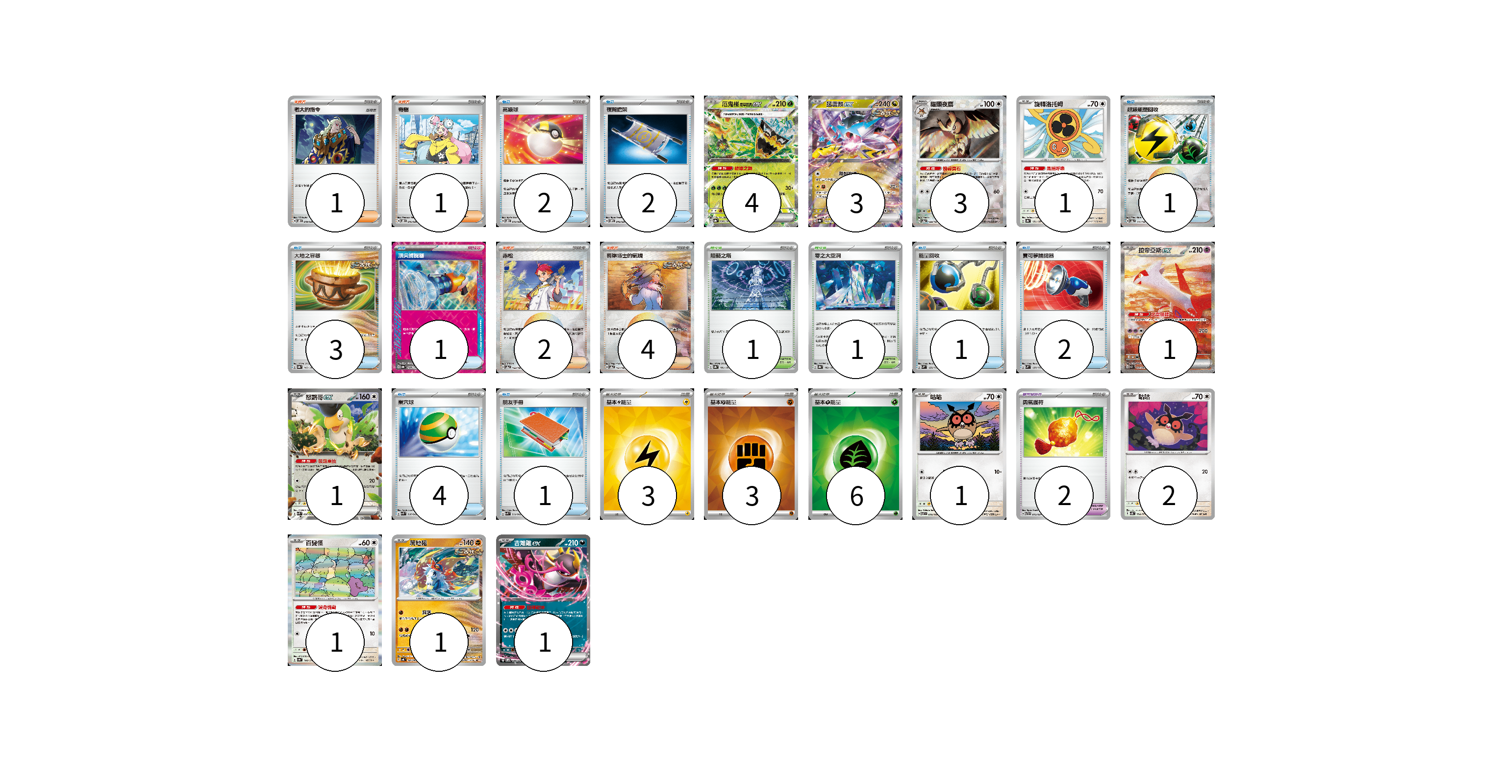 牌組構築方案 以此牌組為基礎新構築牌組 顯示卡面 顯示列表 寶可夢卡(19) 4 3 3 1 1 1 1 2 1 1 1 寶可夢道具(2) 2 物品卡(17) 2 2 1 3 1 1 2 4 1 支援者卡(8) 1 1 2 4 競技場卡(2) 1 1 能量卡(12) 3 3 6 寶可夢卡(19) 卡牌名稱 張數 卡牌名稱 張數 厄鬼椪 碧草面具ex SV8a 020/187 04 猛雷鼓ex SV8a 124/187 03 貓頭夜鷹 SV8a 128/187 03 旋轉洛托姆 SV8a 131/187 01 拉帝亞斯ex SV7a 087/064 01 怒鸚哥ex SVK 006/042 01 咕咕 SV7 076/102 01 咕咕 SV5K 054/071 02 百變怪 SV4a 144/190 01 爬地翅 SV4K 041/066 01 吉雉雞ex SVOM 009/021 01 寶可夢道具(2) 卡牌名稱 張數 卡牌名稱 張數 勇氣護符 SVTR 015/021 02 物品卡(17) 卡牌名稱 張數 卡牌名稱 張數 高級球 SVOD 012/020 02 夜間擔架 SVOM 016/021 02 超級能量回收 SV8a 141/187 01 大地之容器 SV8a 143/187 03 頂尖捕捉器 SV8a 148/187 01 能量回收 SVM 125/175 01 寶可夢捕捉器 SVM 137/175 02 巢穴球 SVK 016/042 04 朋友手冊 SVK 014/042 01 支援者卡(8) 卡牌名稱 張數 卡牌名稱 張數 老大的指令 SVOD 019/020 01 奇樹 SVOD 016/020 01 赤松 SV8a 163/187 02 奧琳博士的氣魄 SV8a 167/187 04 競技場卡(2) 卡牌名稱 張數 卡牌名稱 張數 阻礙之塔 SV8a 181/187 01 零之大空洞 SV8a 182/187 01 能量卡(12) 卡牌名稱 張數 卡牌名稱 張數 基本【雷】能量 SVK LIG 03 基本【鬥】能量 SVK FIG 03 基本【草】能量 SVK GRA 06 以此牌組為基礎新構築牌組 牌組編碼 vPKjZU-ndgysy-YccYNk copy 列印牌組單 牌組編碼已複製 分享至SNS
