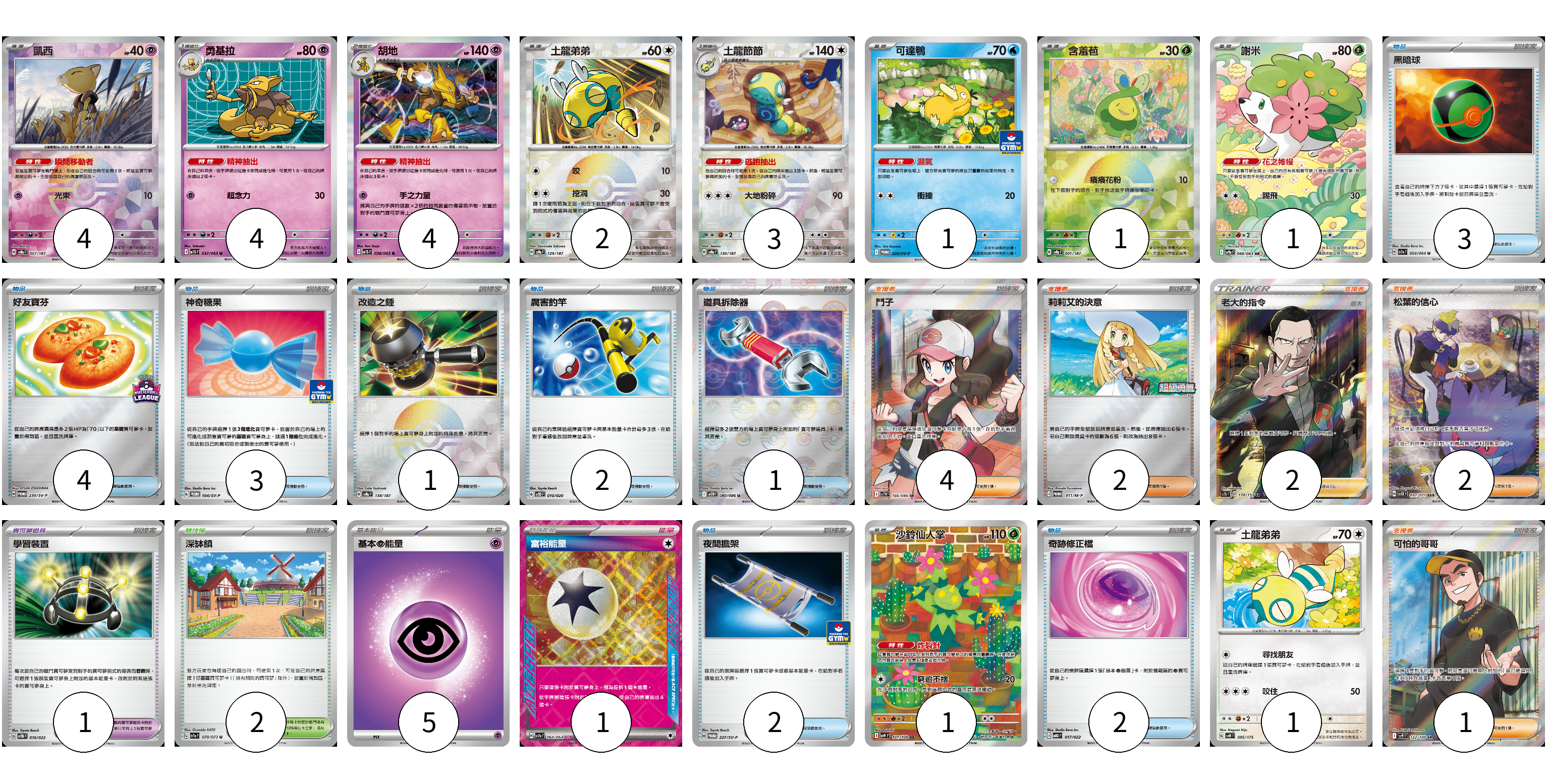 牌組構築方案 以此牌組為基礎新構築牌組 顯示卡面 顯示列表 寶可夢卡(22) 4 4 4 2 3 1 1 1 1 1 寶可夢道具(1) 1 物品卡(18) 3 4 3 1 2 1 2 2 支援者卡(11) 4 2 2 2 1 競技場卡(2) 2 能量卡(6) 5 1 寶可夢卡(22) 卡牌名稱 張數 卡牌名稱 張數 凱西 SV8a 057/187 04 勇基拉 M1S 037/063 04 胡地 M1S 038/063 04 土龍弟弟 SV8a 129/187 02 土龍節節 SV8a 130/187 03 可達鴨 SV-P 220/SV-P 01 含羞苞 SV8a 001/187 01 謝米 SV9a 066/063 01 沙鈴仙人掌 SV9 101/100 01 土龍弟弟 SVM 095/175 01 寶可夢道具(1) 卡牌名稱 張數 卡牌名稱 張數 學習裝置 SVTM 016/022 01 物品卡(18) 卡牌名稱 張數 卡牌名稱 張數 黑暗球 SV7a 054/064 03 好友寶芬 SV-P 230/SV-P 04 神奇糖果 SV-P 104/SV-P 03 改造之錘 SV8a 138/187 01 厲害釣竿 SVOD 010/020 02 道具拆除器 SV11W 080/086 01 夜間擔架 SV-P 227/SV-P 02 奇跡修正檔 MBD 017/022 02 支援者卡(11) 卡牌名稱 張數 卡牌名稱 張數 鬥子 SV11W 166/086 04 莉莉艾的決意 M-P 011/M-P 02 老大的指令(坂木) SC1b 170/153 02 松葉的信心 SV5K 097/071 02 可怕的哥哥 SV9 122/100 01 競技場卡(2) 卡牌名稱 張數 卡牌名稱 張數 深缽鎮 SV1a 070/073 02 能量卡(6) 卡牌名稱 張數 卡牌名稱 張數 基本【超】能量 M-P PSY 05 富裕能量 SV7a 064/064 01 以此牌組為基礎新構築牌組 牌組編碼 vQqfjb-adTyHy-rXObyB copy 列印牌組單 牌組編碼已複製 分享至SNS