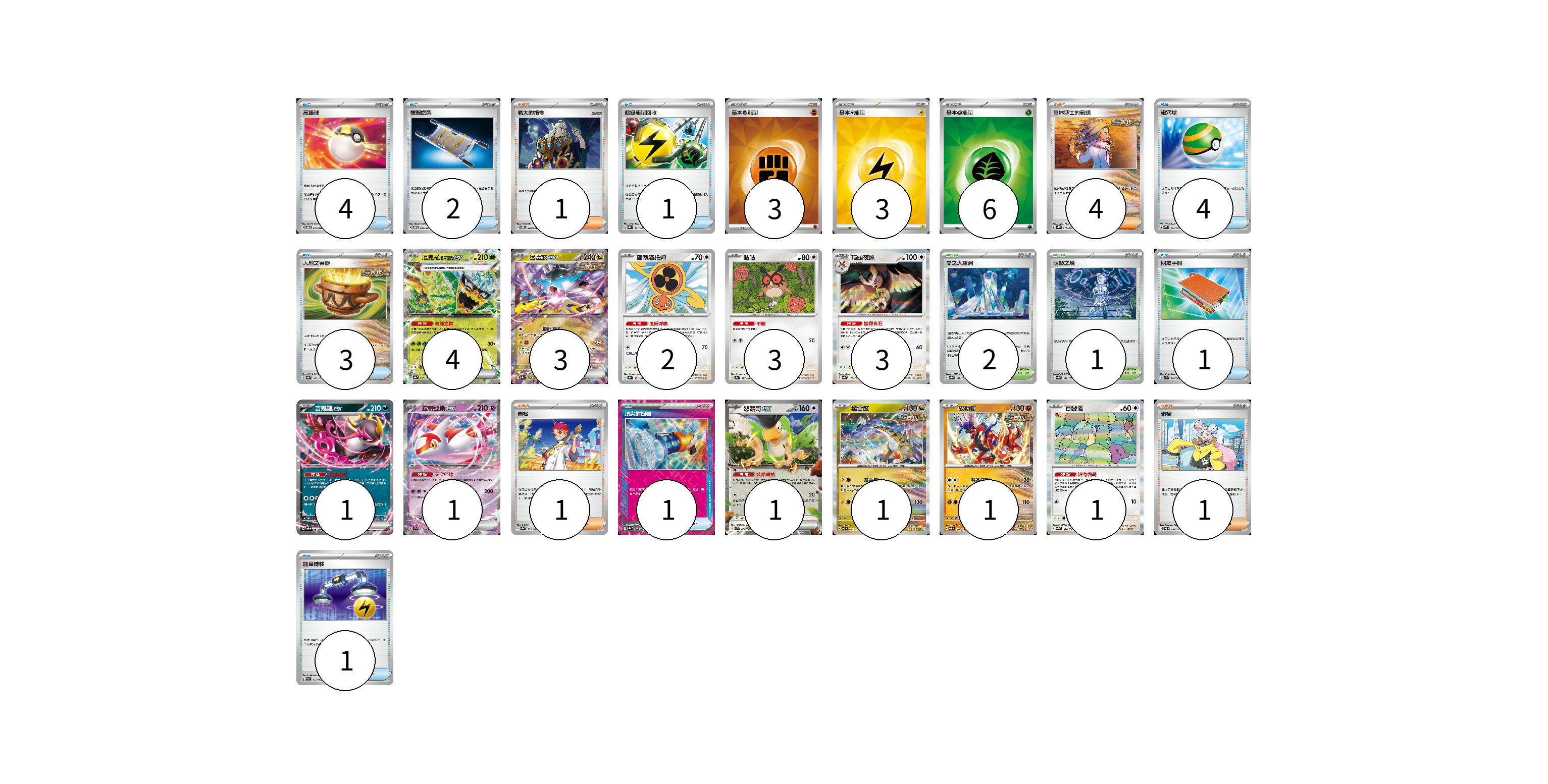 牌組構築方案 以此牌組為基礎新構築牌組 顯示卡面 顯示列表 寶可夢卡(21) 4 3 2 3 3 1 1 1 1 1 1 物品卡(17) 4 2 1 4 3 1 1 1 支援者卡(7) 1 4 1 1 競技場卡(3) 2 1 能量卡(12) 3 3 6 寶可夢卡(21) 卡牌名稱 張數 卡牌名稱 張數 厄鬼椪 碧草面具ex SV8a 020/187 04 猛雷鼓ex SV8a 124/187 03 旋轉洛托姆 SV8a 131/187 02 咕咕 SV8a 127/187 03 貓頭夜鷹 SV8a 128/187 03 吉雉雞ex SVOD 004/020 01 拉帝亞斯ex SV7a 019/064 01 怒鸚哥ex SVK 006/042 01 猛雷鼓 SV7 075/102 01 故勒頓 SV8 069/106 01 百變怪 SV4a 144/190 01 物品卡(17) 卡牌名稱 張數 卡牌名稱 張數 高級球 SVOD 012/020 04 夜間擔架 SVOM 016/021 02 超級能量回收 SV8a 141/187 01 巢穴球 SVAW 014/023 04 大地之容器 SV8a 143/187 03 朋友手冊 SVK 014/042 01 頂尖捕捉器 SV8a 148/187 01 能量轉移 SVAM 012/023 01 支援者卡(7) 卡牌名稱 張數 卡牌名稱 張數 老大的指令 SVOM 020/021 01 奧琳博士的氣魄 SVHK 017/022 04 赤松 SV8a 163/187 01 奇樹 SVOD 016/020 01 競技場卡(3) 卡牌名稱 張數 卡牌名稱 張數 零之大空洞 SV8a 182/187 02 阻礙之塔 SV8a 181/187 01 能量卡(12) 卡牌名稱 張數 卡牌名稱 張數 基本【鬥】能量 SVK FIG 03 基本【雷】能量 SVK LIG 03 基本【草】能量 SVK GRA 06 以此牌組為基礎新構築牌組 牌組編碼 vQwhZT-zaEPTn-FeAZXq copy 列印牌組單 牌組編碼已複製 分享至SNS